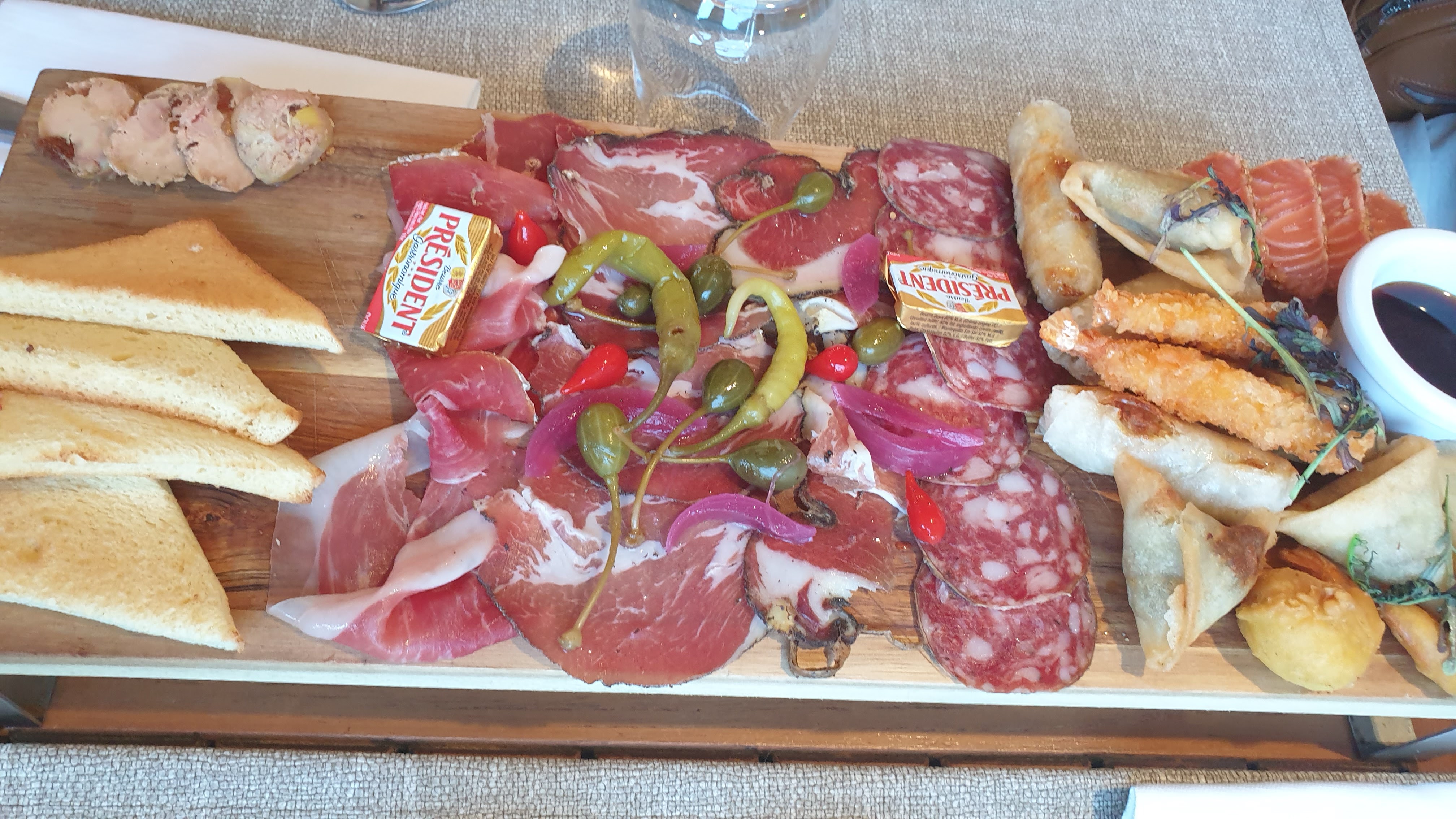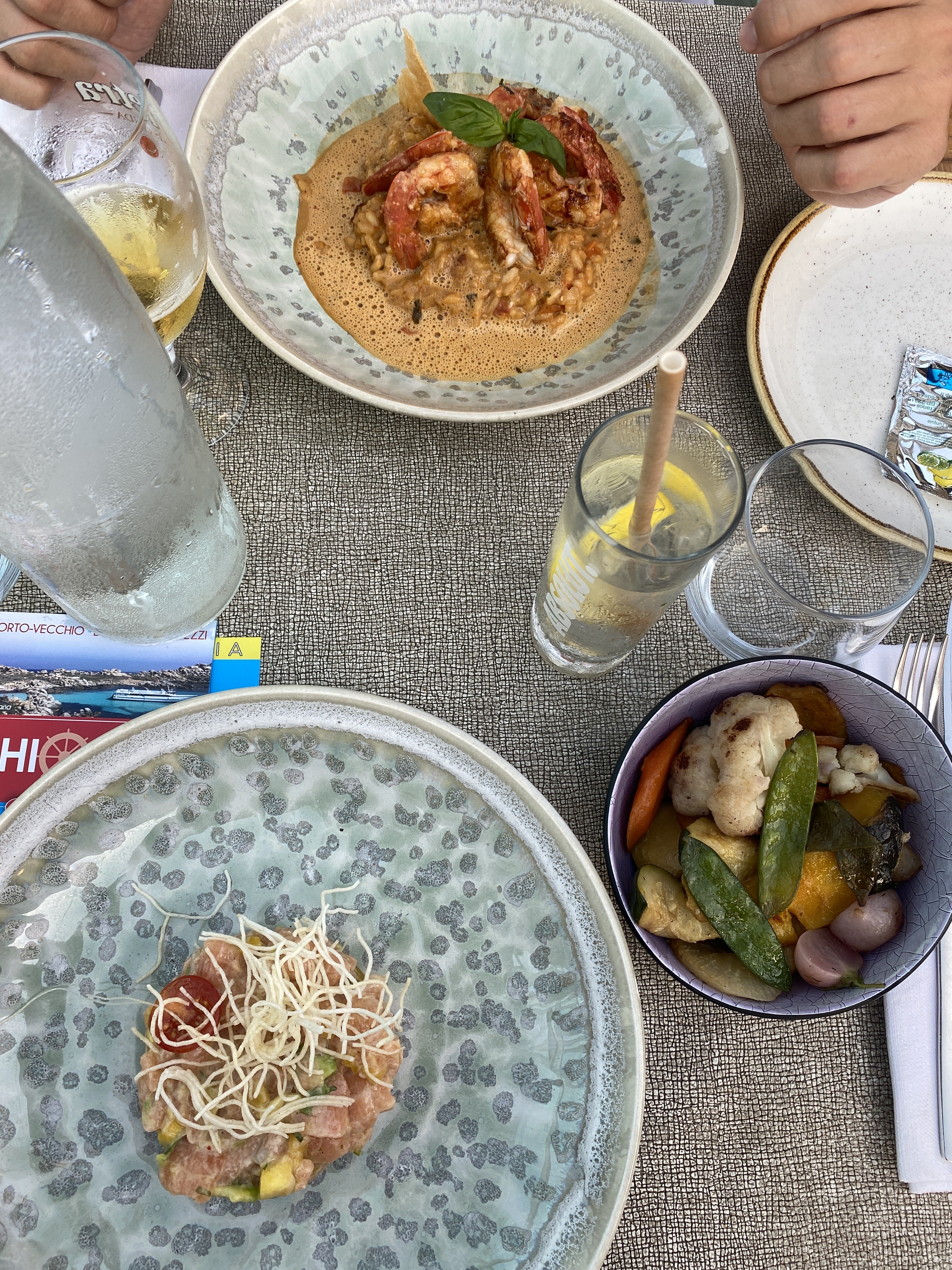 Excellents plats et portions généreuses. En entrée nous avons simplement pris une planche de charcuterie (1pers) à partager pour deux, ce qui était finalement suffisant. Nous avons ensuite opté pour un tartare de saumon et un pavé de dorade en suggestion du jour, tout aussi bon l’un que l’autre. Et malheureusement plus suffisamment faim pour le dessert… Egalement, le cadre donnant sur le port de Porto Vecchio est très sympathique, et mention spéciale pour le Mojito passion qui était aussi délicieux !