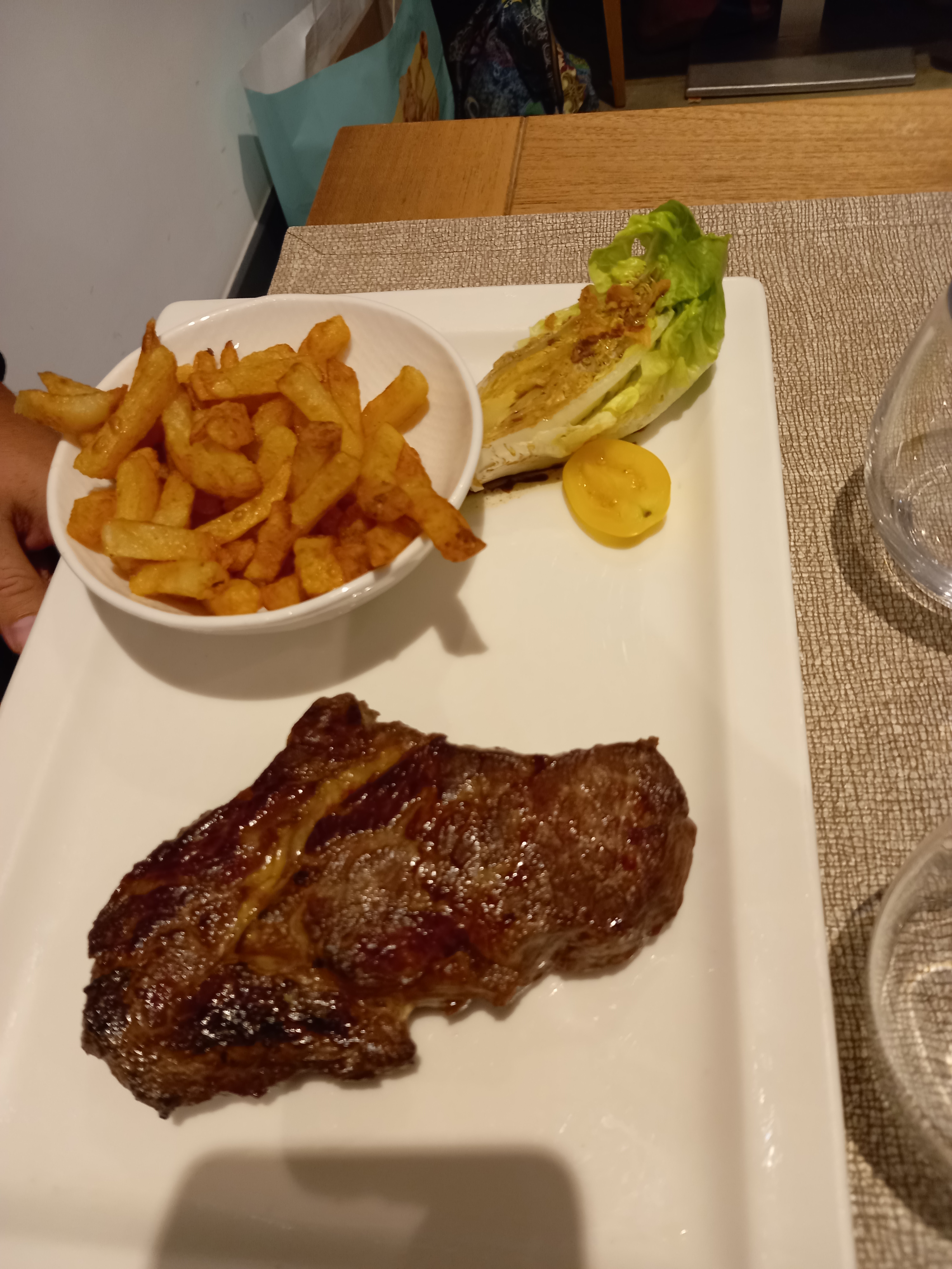 A l'arrivée une mousse au paprika avec toaste de bienvenues juste très bonne ! Faux filet de boeuf angus avec sa sauce forestière, frites et mayo le tout entièrement maison une vrai tuerie j'ai jamais manger une viande aussi bonne !! La sauce délicieuse, la mayo gourmande, moi qui mange lentement par habitude je pensais ne plus pouvoir m'arrêter de manger tellement c'était bon !!! Verre de vin rouge que j'ai bien aimé Les linguines à la carbo parfaites, la brochette de poulet au gingembre citron très tendre et parfaitement assaisonné pas trop et pas trop peu le top ! Tiramisu... enfin un vrai de vrai toute les saveurs et textures étaient là vraiment super bon !! Un seul point, j'avais demander ma viande saignante elle était plus bleue qu'autre chose mais sincèrement je pense que le chef en la cuisant de cette manière à permis de faire ressortir tout les arômes je ne regrette absolument pas la cuisson c'était juste excellent parfait comme ca !