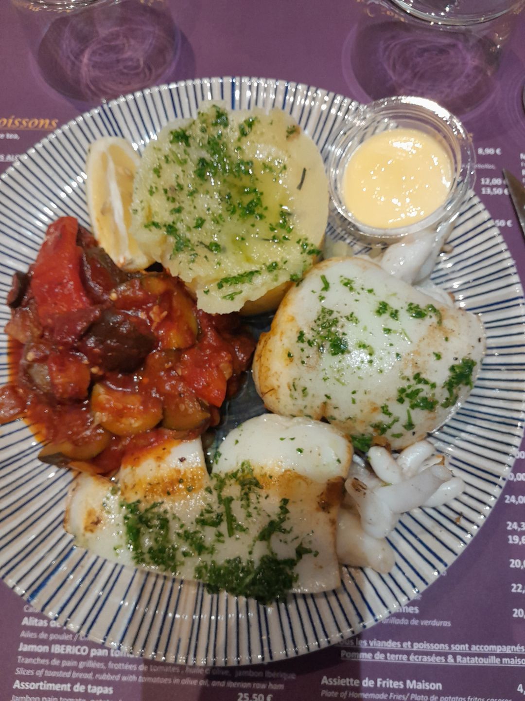 Paella très bonne et généreuse. Je regrette qu'il n'est pas été précisé que c'était uniquement aux fruits de mer (pas de volaille , pas de chorizo). Néanmoins très bien cuisinée