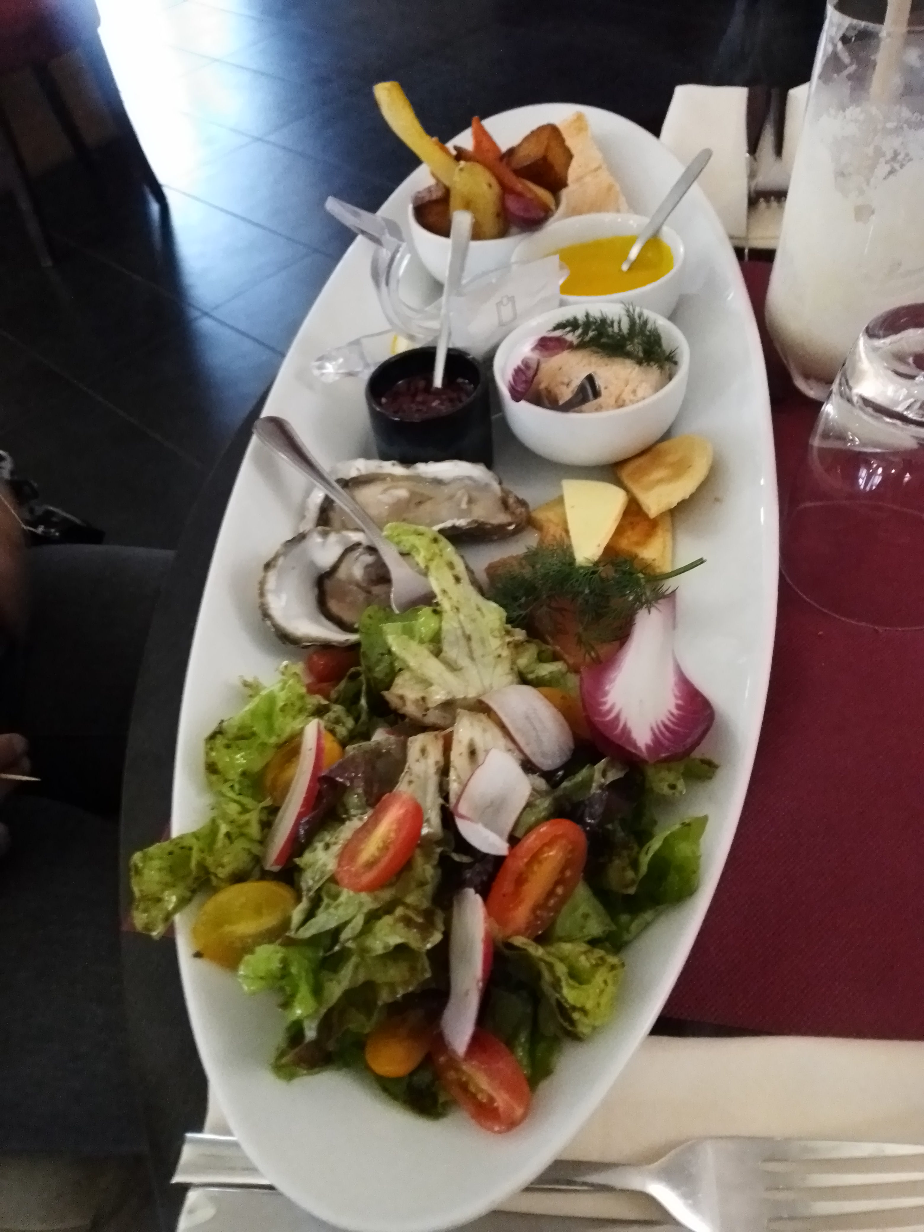 Assiette à partager pour 4 très satisfaisante, j'ai voulu tester pour une fois un tartare de bœuf avec des frites, c'est bon mais froid, et excellent coeur fondant avec du caramel, pièce principale un peu bruyante