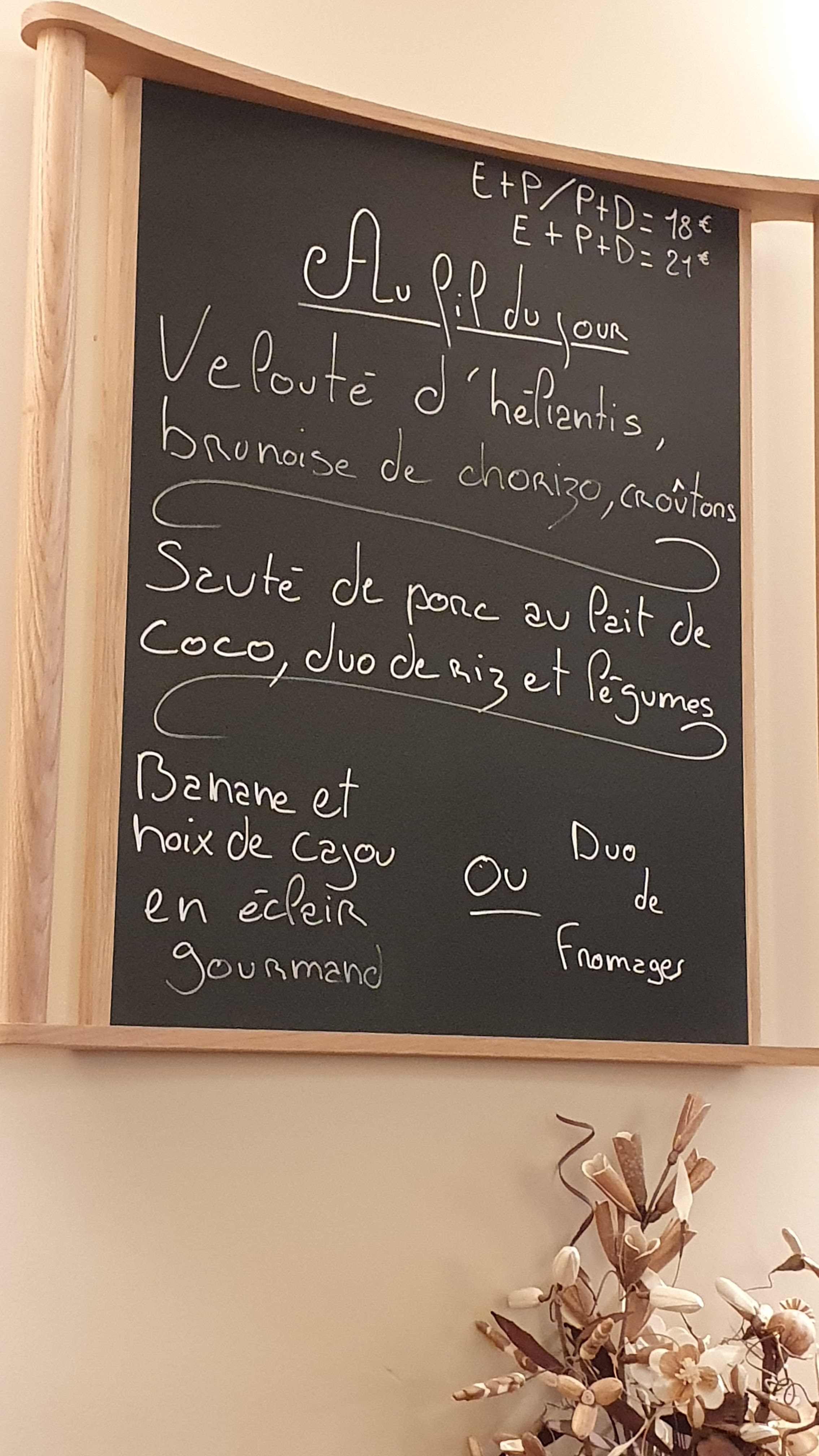Bon repas mais un peu déçue par le prix de la formule entrée plat qui m a été facturée à 18.50 € pour le menu du jour qui consistait en un petit bol de soupe de patate douce suivi d une blanquette de veau. Pour avoir l apetitif maison il fallait compter en plus 8.50 € (coupe de crémant aromatisee). Je trouve l ensemble assez cher...