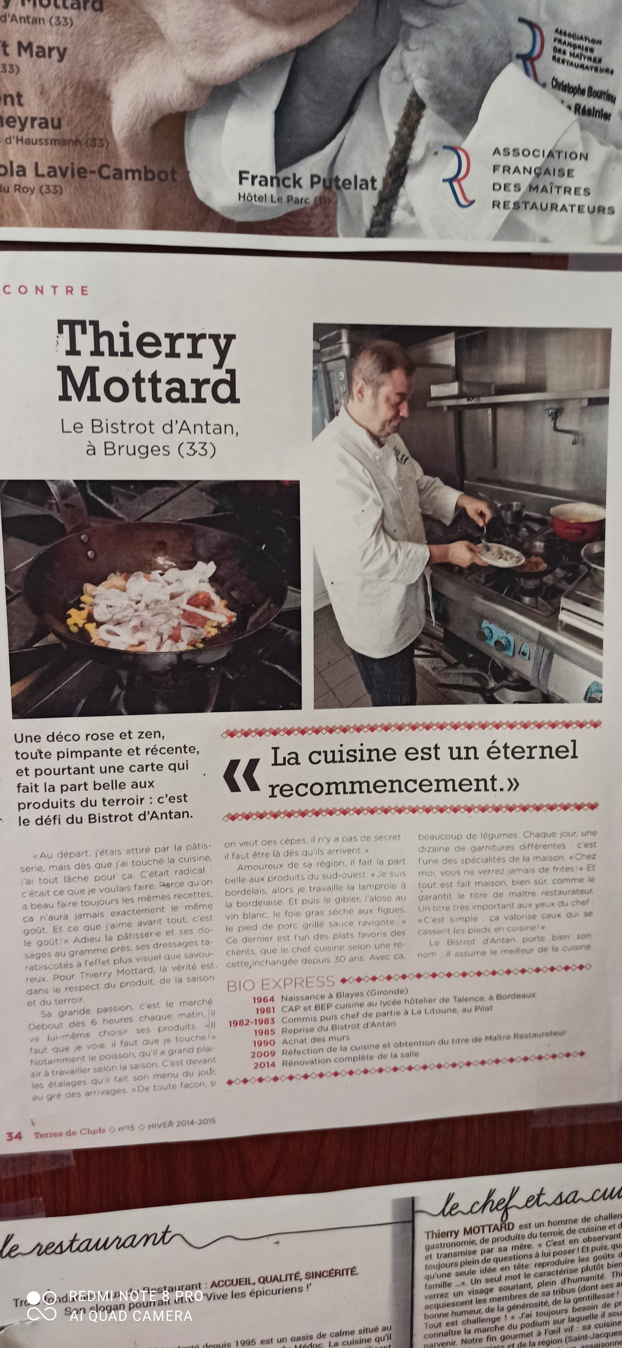 Etape gourmande du portail GéoBalad', cet établissement a le titre de Maître Restaurateur, le seul délivré, actuellement, par l'état. A quelques minutes à peine de Bordeaux, aux portes du Médoc, le restaurant Le Bistrot d'Antan est situé dans le centre ville de Bruges en Gironde(33). Ce restaurant, à proximité de la rocade bordelaise vous séduira pour la qualité de sa cuisine gastronomique et saisonnière et de ses prix étudiés. Ce qui a valu au Restaurant Le Bistrot d'Antan de nombreuses citations dans des guides tels que le Guide Hubert ou le Petit Futé. La cuisine de Thierry Mottard à base de produits saisonniers prend ses racines dans le terroir du Sud Ouest. Le Restaurant le Bistrot d'Antan propose une cuisine gastronomique traditionnelle qui permet d'utiliser les produits de saison avec finesse (St jacques, Foie gras aux fraises, Asperges, Canard gras, Lamproie à la Bordelaise,Alose, Gibiers, Truffe, Cèpes, Girolles, Crêpes) et d'accompagner tous les plats de Légumes frais et variés. Karin et Thierry Mottard, amateurs éclairés ont sélectionné une carte des vins de propriété et de grands crus (Médoc, St Emilion, Pomerol, Graves) ainsi qu'une cave à Whisky avec plusieurs dizaines de Whiskies de renom. Que ce soit pour un repas entre ami(e)s ou professionnel, l'équipe du restaurant Le Bistrot d'Antan à Bruges et Thierry Mottard, vous réserveront le meilleur accueil. Pour vos repas de groupe, mariage,anniversaire, communion, baptême, Saint Sylvestre, Saint Valentin, Fêtes des mères ou pour vos repas d'affaire, banquet,cocktail les groupes, des menus spécialement composés vous seront proposés.