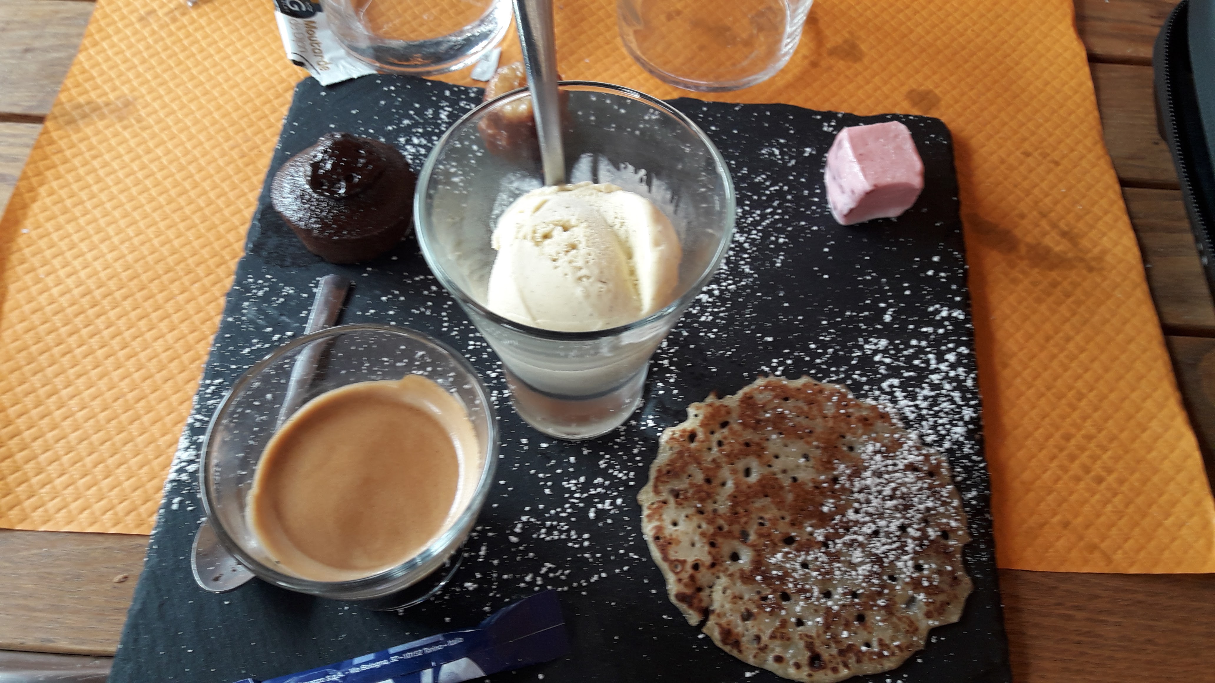 Arf... Pas donné quand même pour une assiette de viande séchée pas mauvaise mais... dès qu'on prend un verre de blanc en apéro et une bouteille de rouge pour accompagner l'ardoise, on est pas loin du racket. On le sait d'emblée parce que les prix sont affichés mais quand même... Une déception parce que mes choix ne nécessitaient aucune cuisine compliquée : de la viande froide et 2 boules de glaces en dessert.