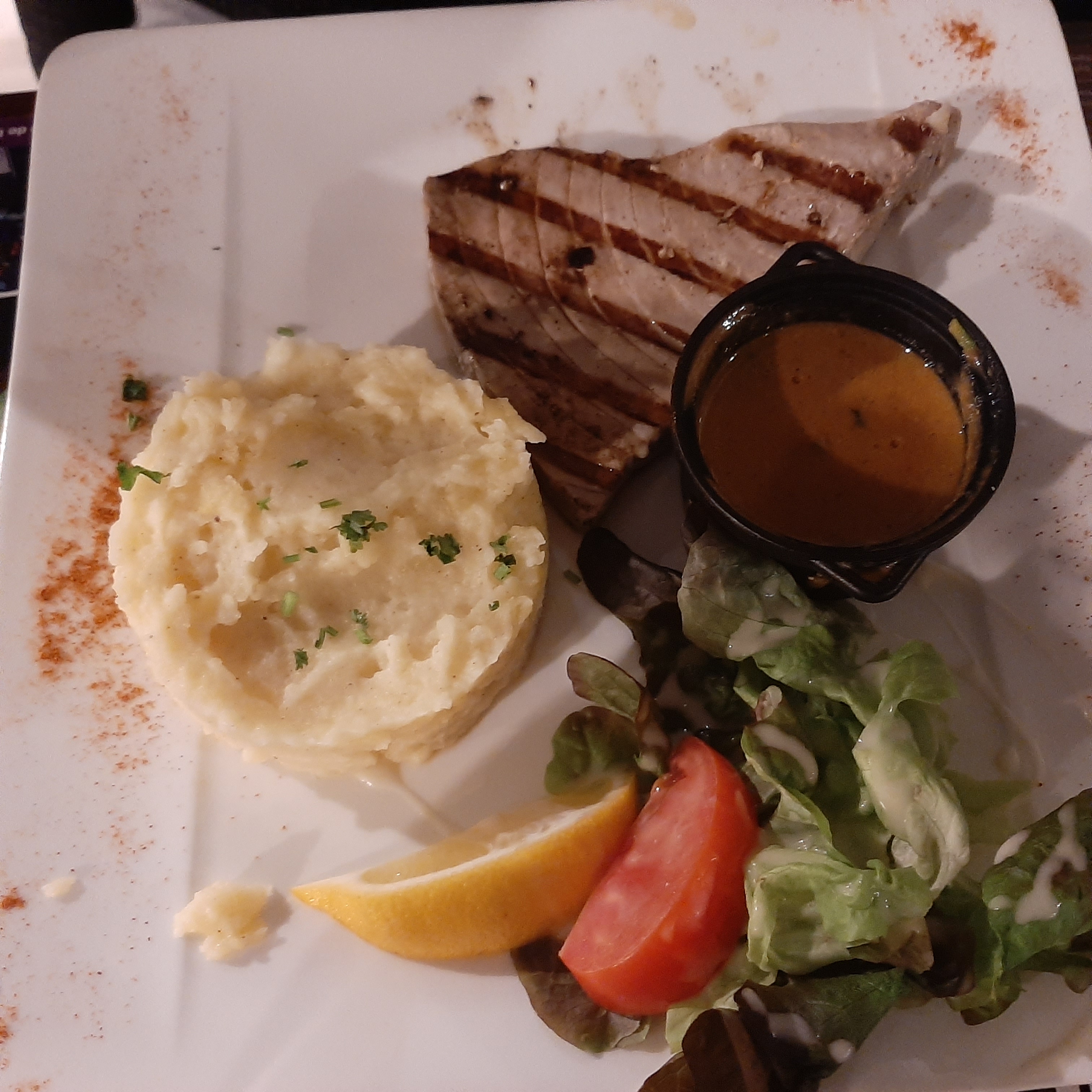 Choix varié un menu terre un mer, tout les jours différents,des bons burger la brochette de poulet super tendre un buffet toujours bien garni le midi dans un menu a 15euros . merci pour l acceuil et la réactivité du serveur .