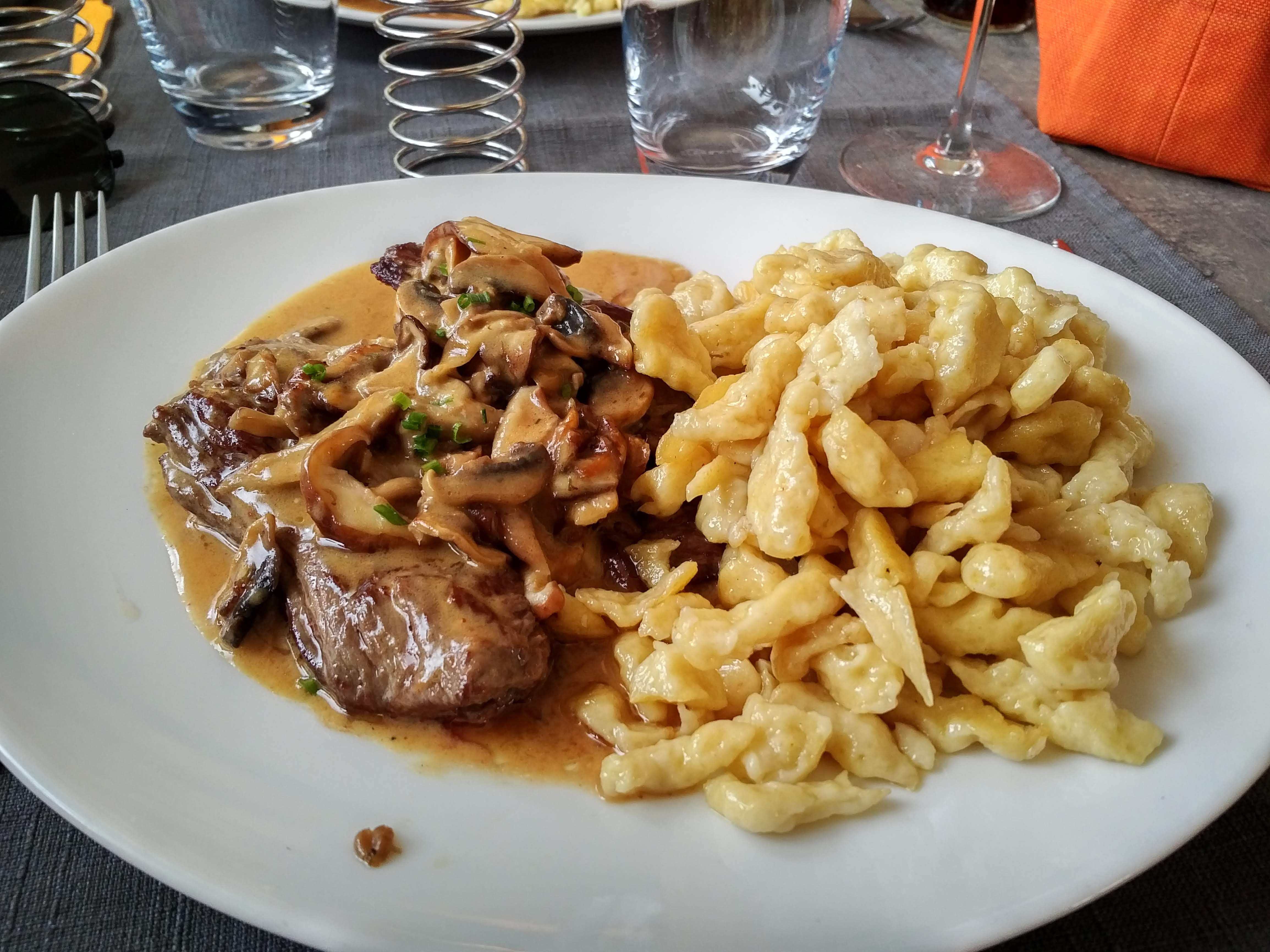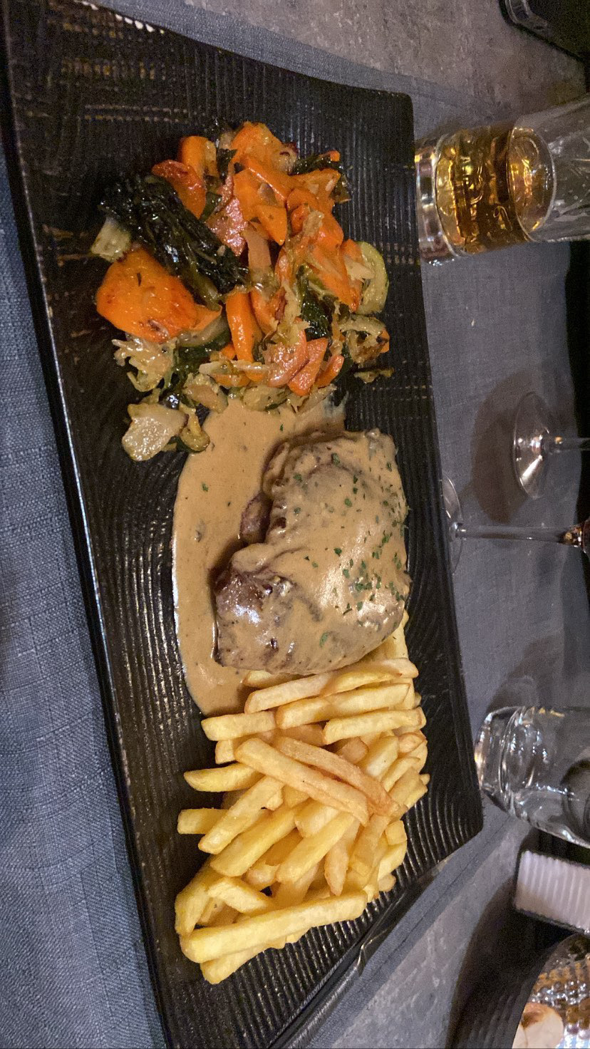 Premier dîner dans ce restaurant. L'ambiance est agréable, la décoration est chaleureuse. La serveuse est souriante, aimable et serviable. Que demander de plus ? Le plat, ici bœuf stroganoff, était très bon.. Mais les spatzles sentaient et brillaient le beurre. Mon conjoint a prit du magret de canard au four accompagné de nouilles, ces derniers aussi sentaient et brillaient le beurre. Le dessert, café gourmand, agréablement surprise par les gourmandises. La mousse à la fraise était à tomber. 😍 Malgré cela, c'est un très bon restaurant :) Je recommande 😉 bon appétit 🍴