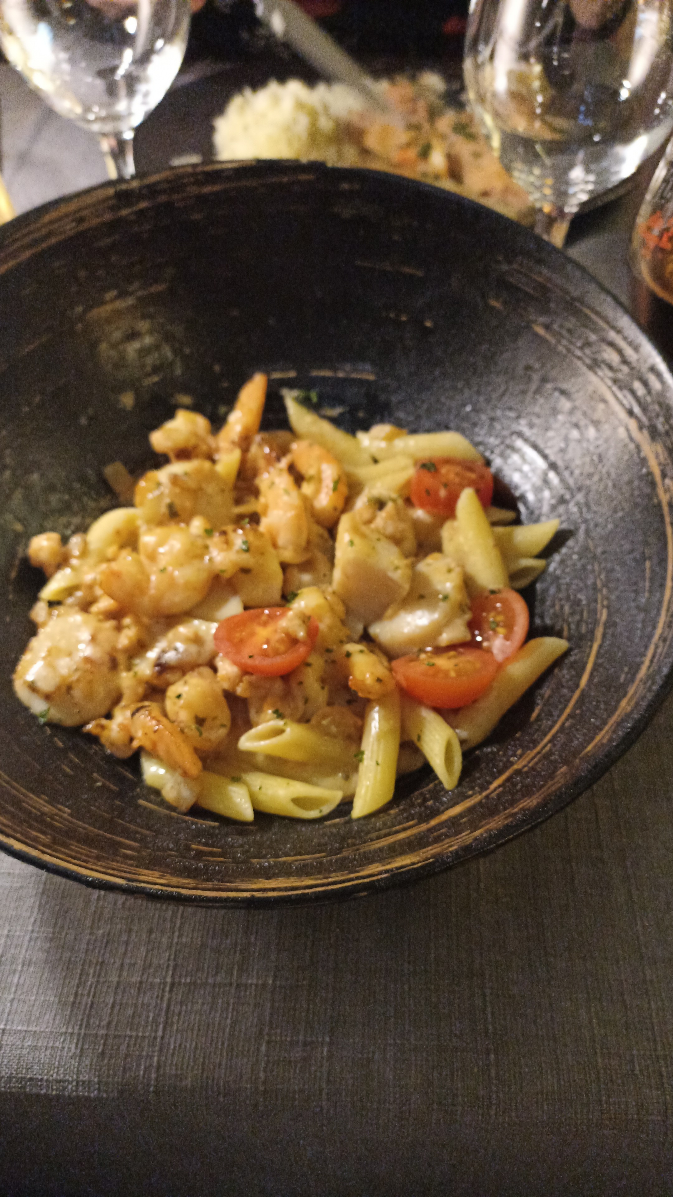 Très très bon repas. Dommage que (suite à un gros problème sur le réseau d eau)il n y avait pas de glaçons, ni de tisane, ni de café. On aurait pu acheter des bonbonne d eau et faire avec cela, et aussi mettre l aperol au frais, le Sprite aurait été meilleur un peu plus frais.