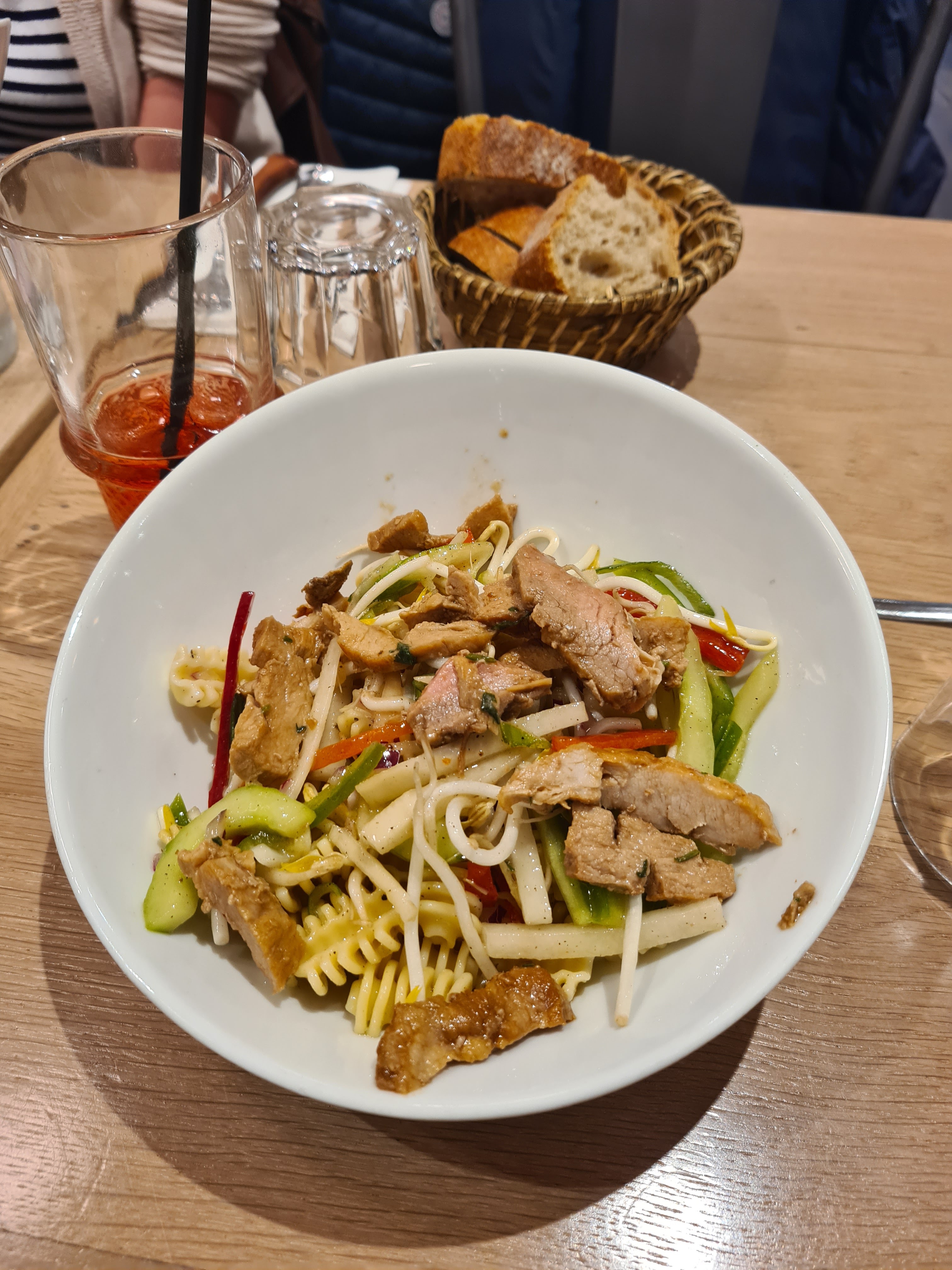 Bistrot à première vue sympa mais super bruyant j'y ai été avec des collègues on s entendait à peine...service très lent ..au menu il y avait une salade avec un nom très exotique mais en fait juste une salade de pâtes trop al dente a mon goût, avec quelques lamelles de porc , un peu de salade verte. Ce n était pas mauvais mais pas un régal non plus..je ne parlerais pas du dessert vu que je n'ai pas pu le manger...point positif les serveurs très avenants.. pas sûre d'y retourner😑
