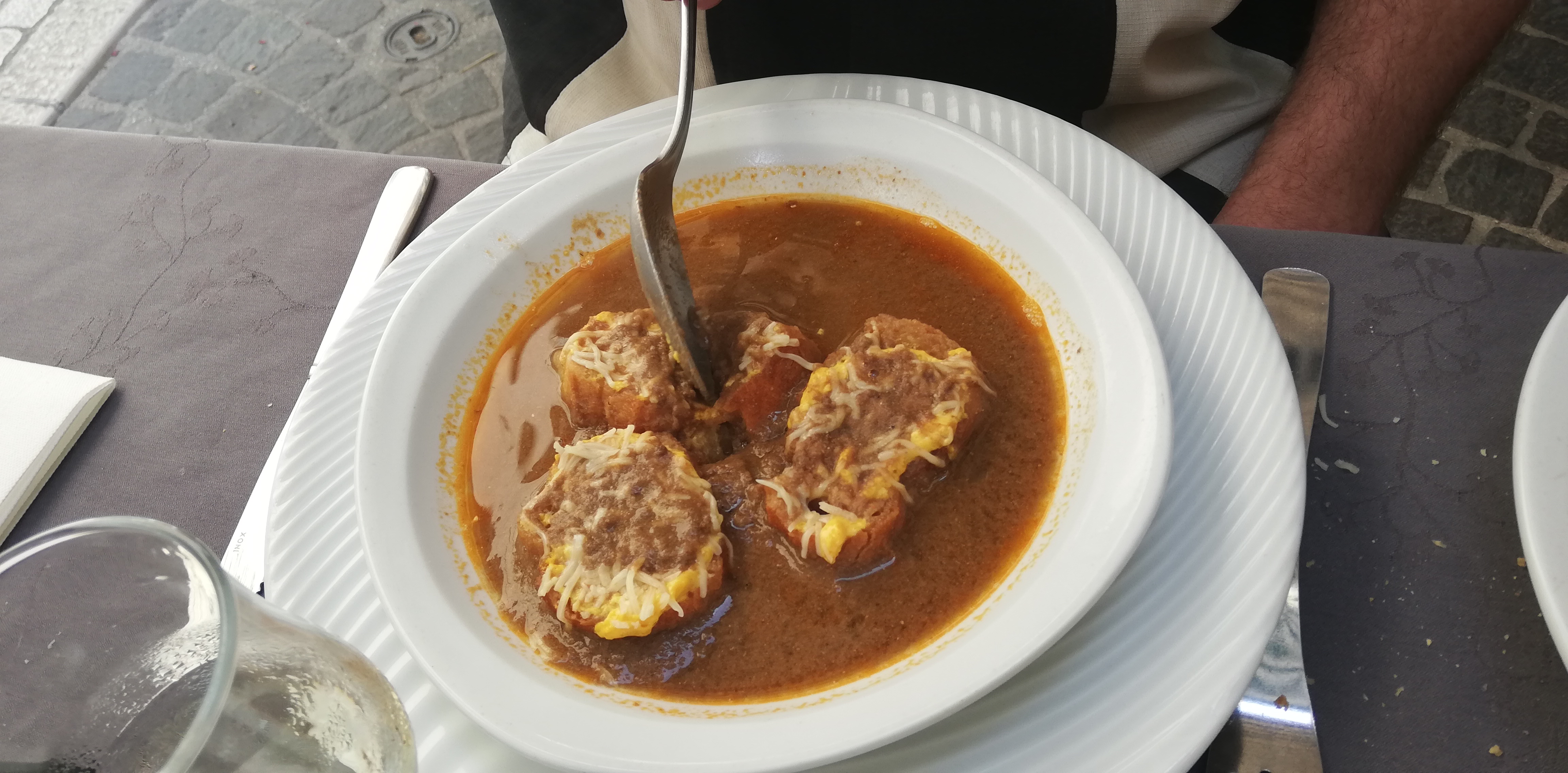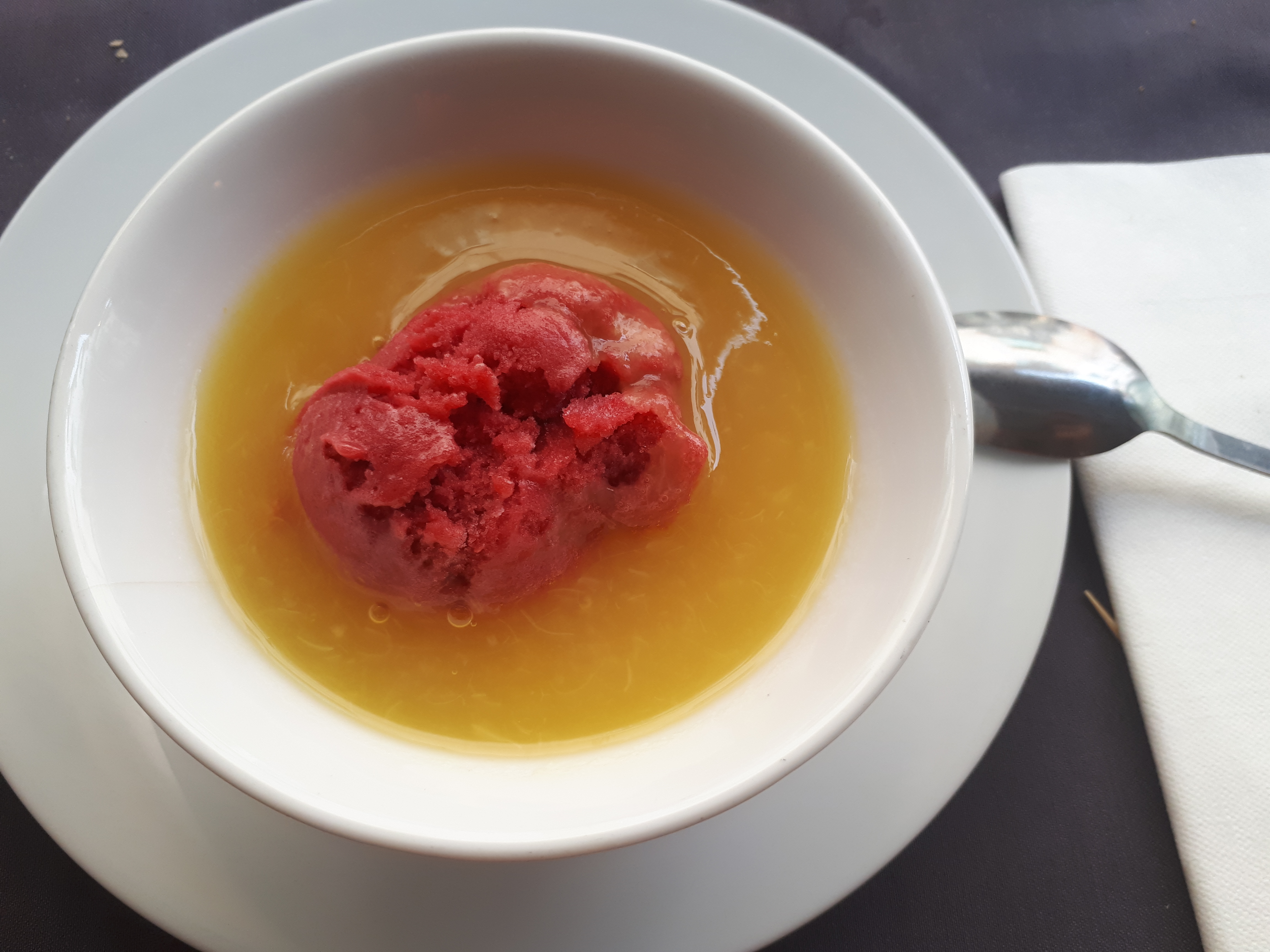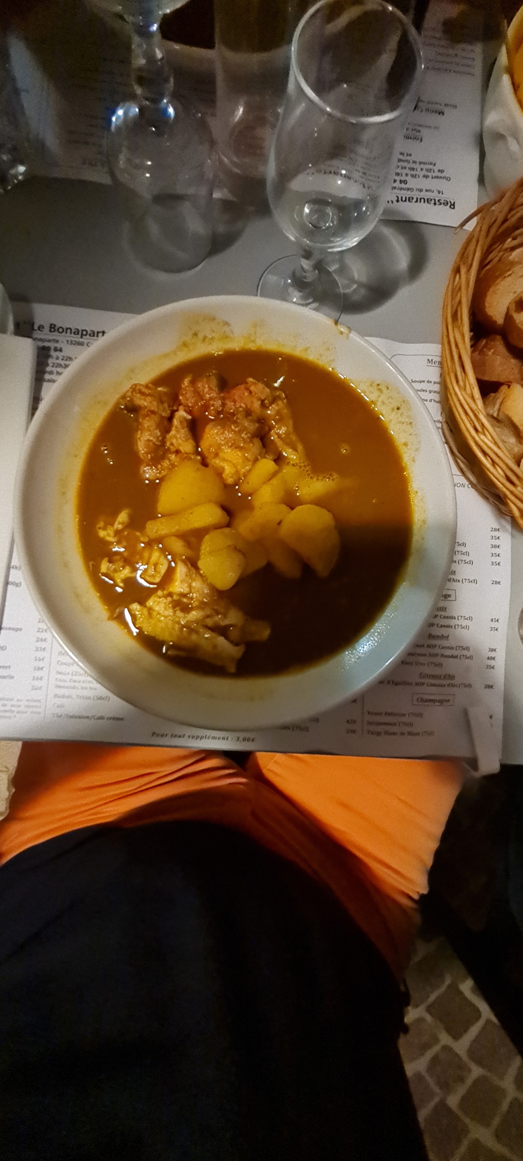 Une bonne soupe de poisson. Pour le reste de ce que nous avons mangé (médaillons de lotte, moules gratinées et agneau), c’était simplement convenable donc nous sommes repartis un peu déçus par rapport à la moyenne qu’obtient ce restaurant.