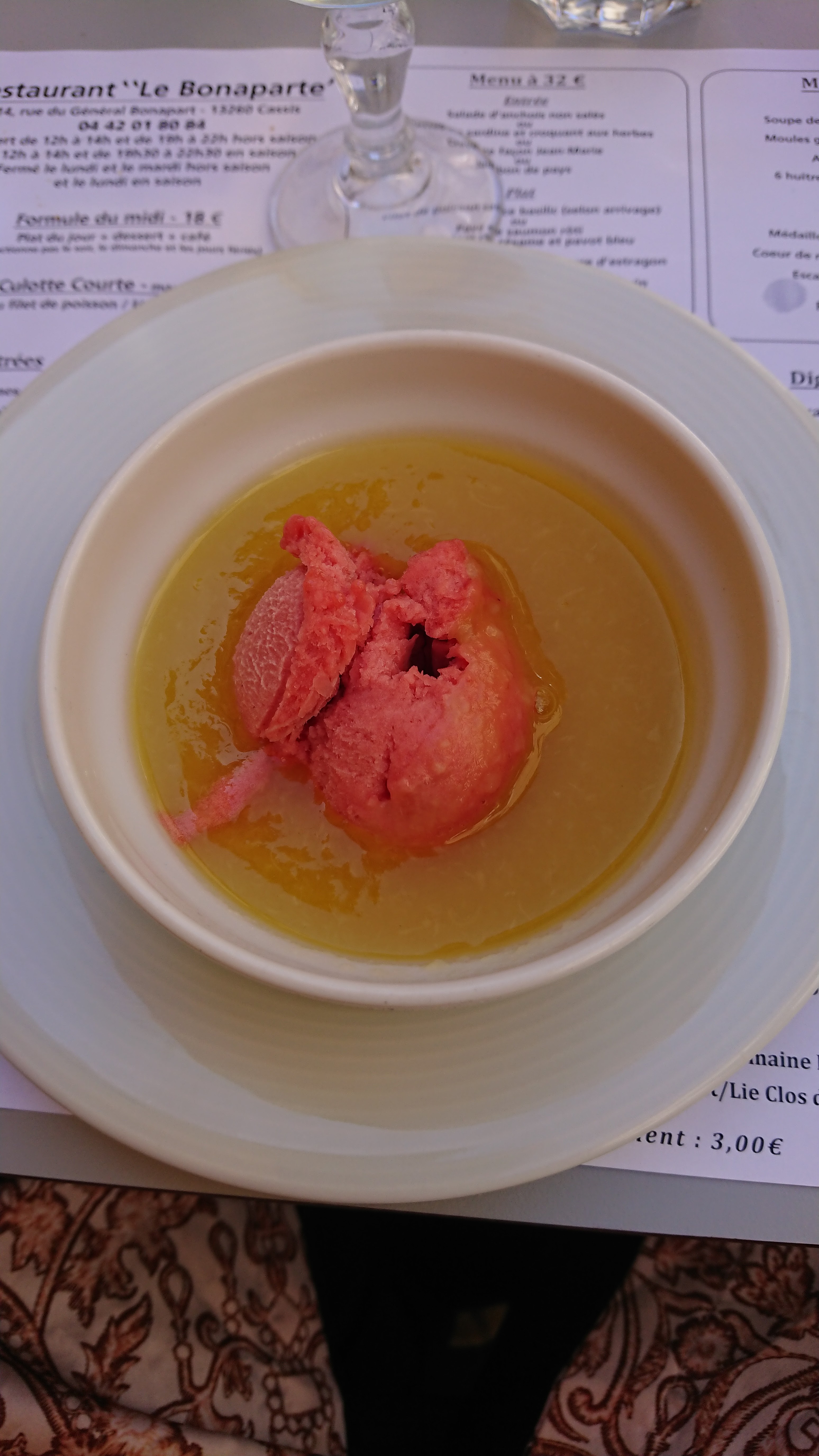 Nous sommes venus déjeuner au Bonaparte, attirés par les nombreux avis dithyrambiques sur le restaurant Il faisait très chaud, nous n'avions pas très faim et nous nous sommes laissé tenter par le plat du jour (menu à 16€) bien vendu par le serveur. Ce jour-là, c'était un filet de julienne à la sauce vierge. La vérité m'oblige à le dire, la sauce était excellente. La julienne par contre était un peu caoutchouteuse et décevante. Impression confirmée par les convives d'à côté qui la trouvaient quant à eux sèche. Mais le plus décevant fut le dessert. Une soupe à la mangue et ananas, sorbet framboise. La soupe avait la consistance et le goût de la compote en conserve. Rien à voir avec une soupe de fruits... Le menu avait beau ne pas être très coûteux, un plat du jour, ça ne peut/doit pas se manquer.