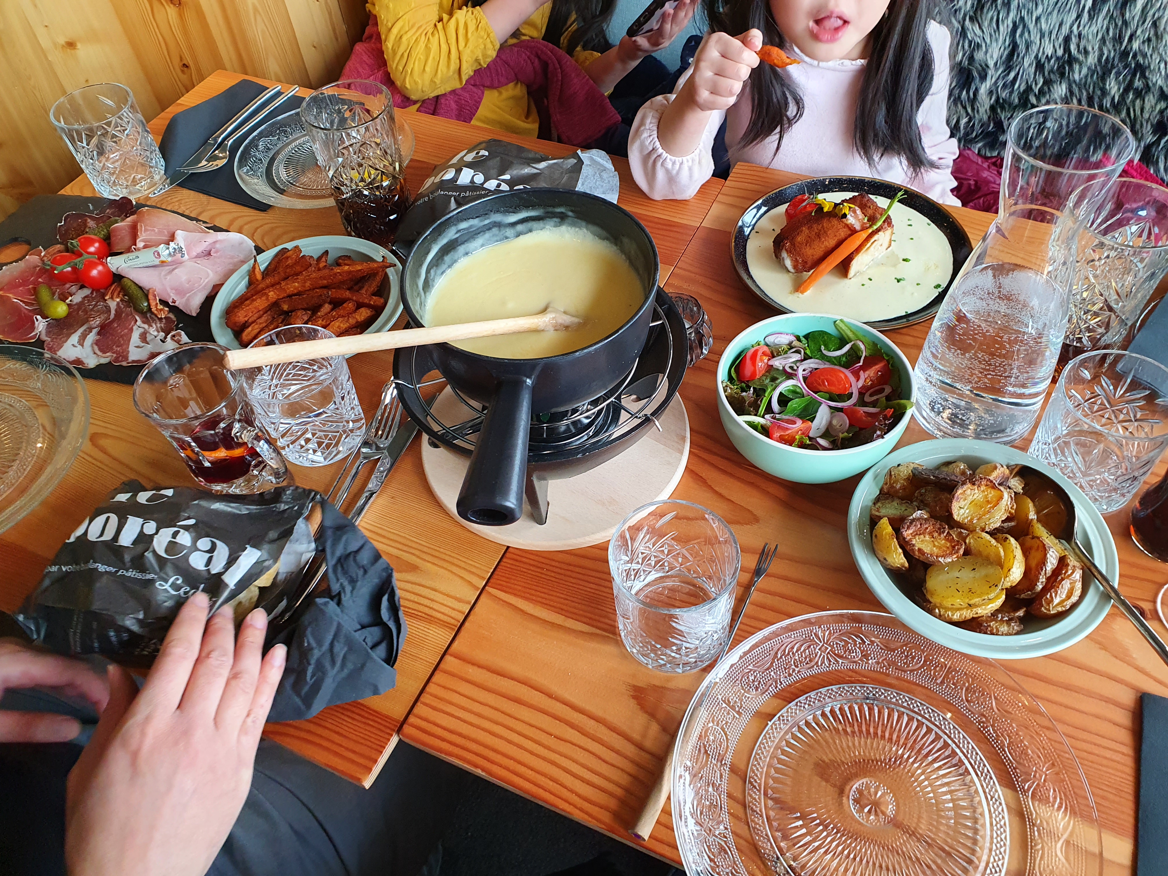 Je me suis arrêté parce que je me sentais mal de quitter la station de ski sans avoir de fondue, mais peut-être parce que c'était un magasin récemment ouvert, tout, des assiettes à l'intérieur, était très propre et brillant. La fondue coûtait environ 30 euros par personne, et elle comprenait charcuterie et salade ! Tout le monde demandait quel type de jambon était si délicieux, alors j'ai voulu l'acheter ! J'ai pris un repas spécial le jour de Noël dans un restaurant où je suis allé sans aucune attente.