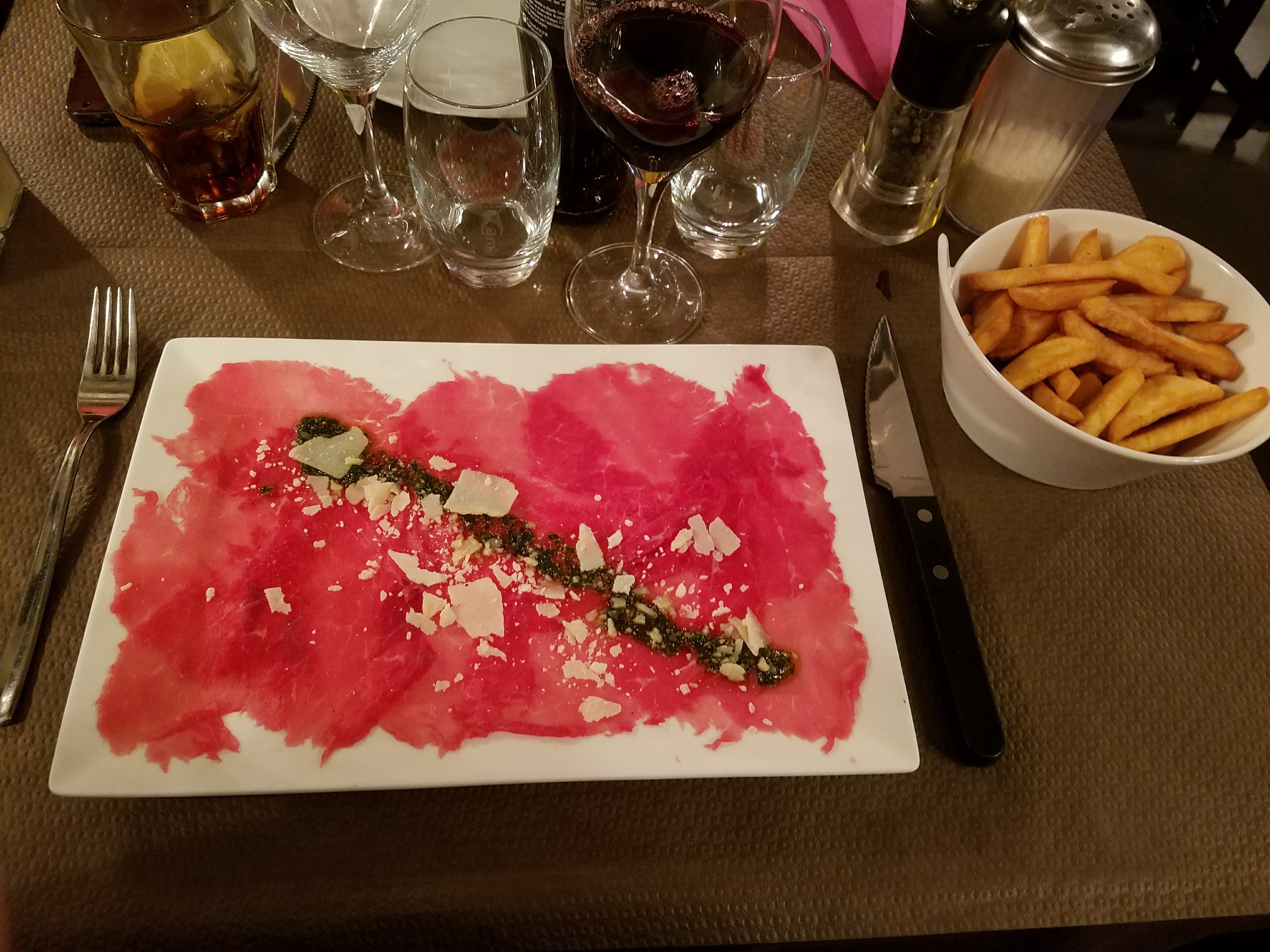 Pour le Carpacio à volonté, je suis venu. De supers accompagnements, j'ai vu. La qualité, m'a vaincu ! Poésie à part, on ne s'est pas foutu de nous ! Le service était efficace et les assiettes se sont bien enchaînées . Les accompagnements étaient excellent, nous avions choix alors nous avons demandé d'avoir les trois possibles . L'accord met et vin était bien choisi aussi. Ça nous a donné envie avec plaisir de revenir goûter d'autres plats ! Situé dans le centre historique de schiltihgeim il y a peu de places de parking à proximité (je conseille le parking du Tribunal ) mais sinon il faut moins de 15 minutes pour rejoindre le tram B et d'autres lignes de bus sont à proximité ;)