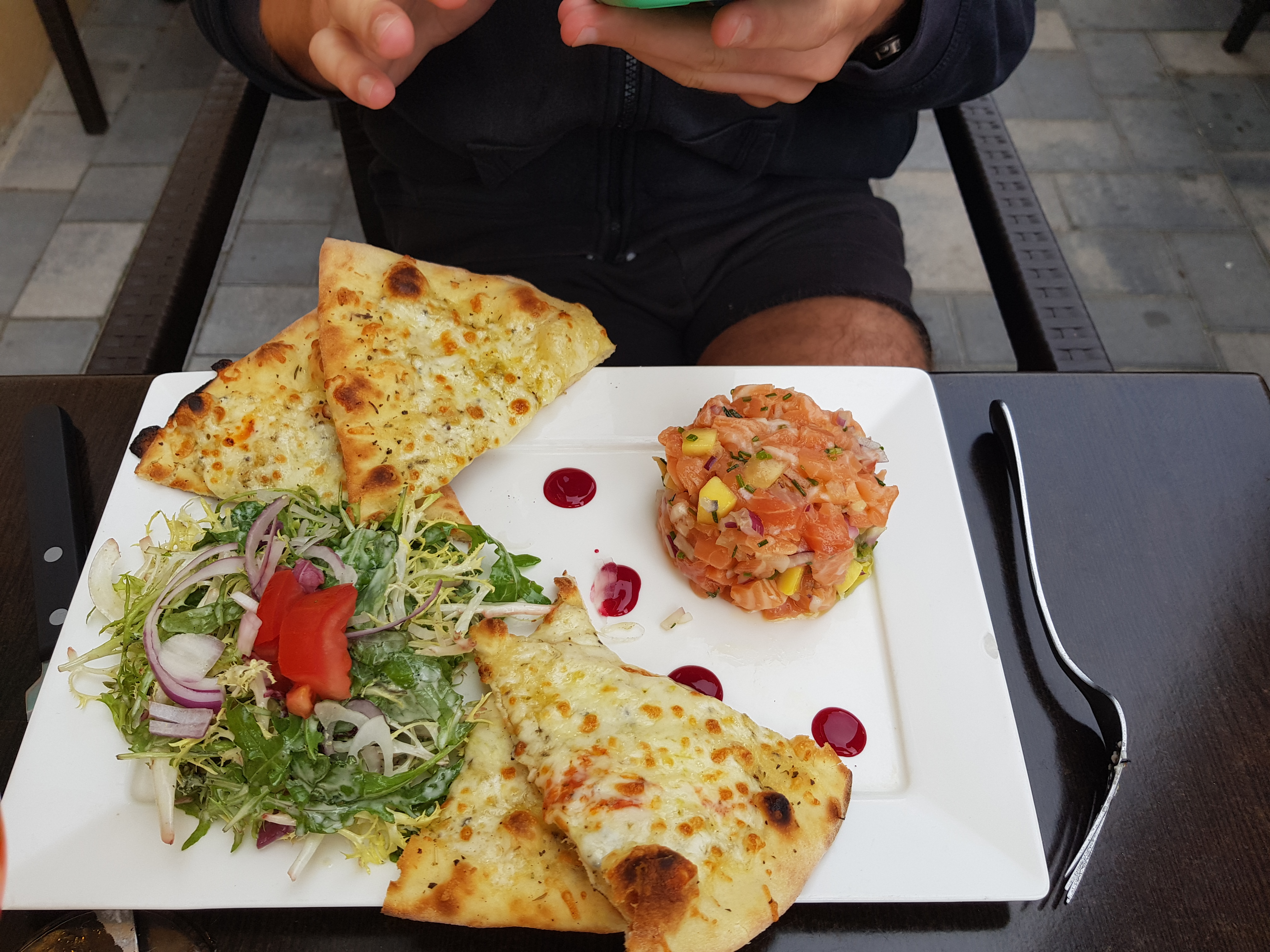 Nous avons réservé une table pour 3. Nous avons eu la possibilité de déjeuner à l'extérieur et abrité. Très bel accueil. Nous avons pris tous les trois le même plat: - tartare de saumon Le plat était goûteux et frais. Ce fut très agréable pour une journée caniculaire.