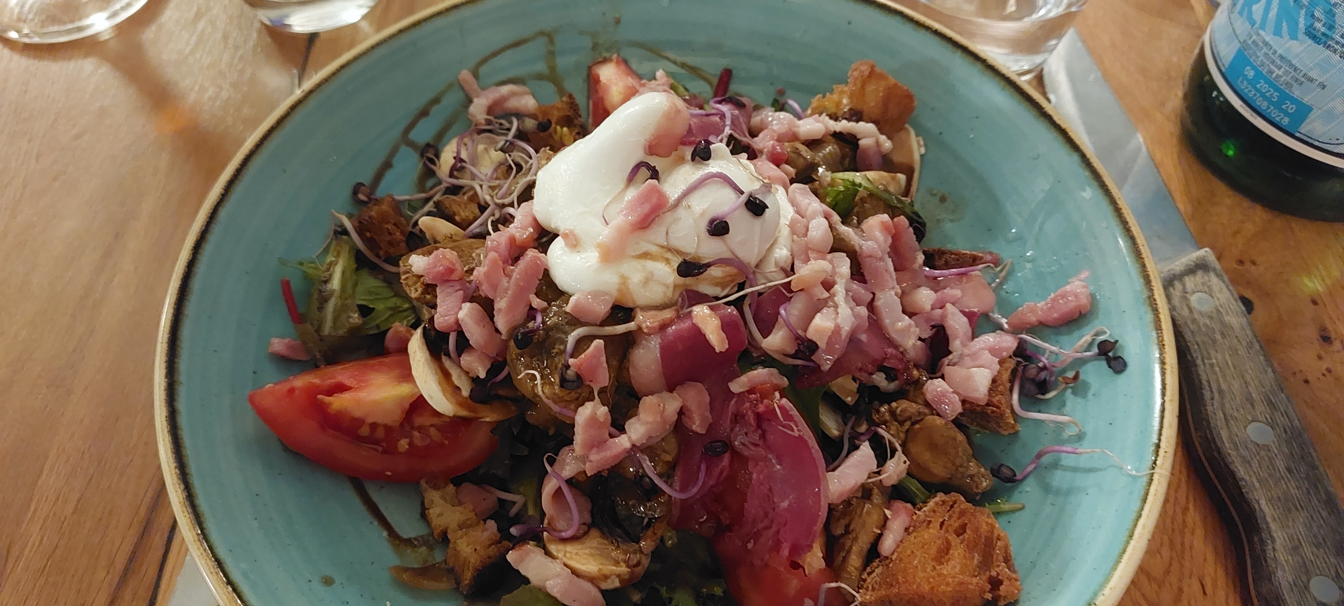 Le service est réactif, attentif, vraiment là pour mettre le client à l'aise. Au menu, une salade Caesar. Un peu plus déçue, pour une salade, j'aurais aimé plus de légèreté. La pâte à pizza dessous avec du fromage fondu, une salade qui avait pris la chaleur, un trop huilée, le poulet en croustille et les croûtons, le parmesan en copeaux, vraiment, j'aurais une déclinaison plus légère et aérienne. Quand au goût, du coup, c'était plus que classique.