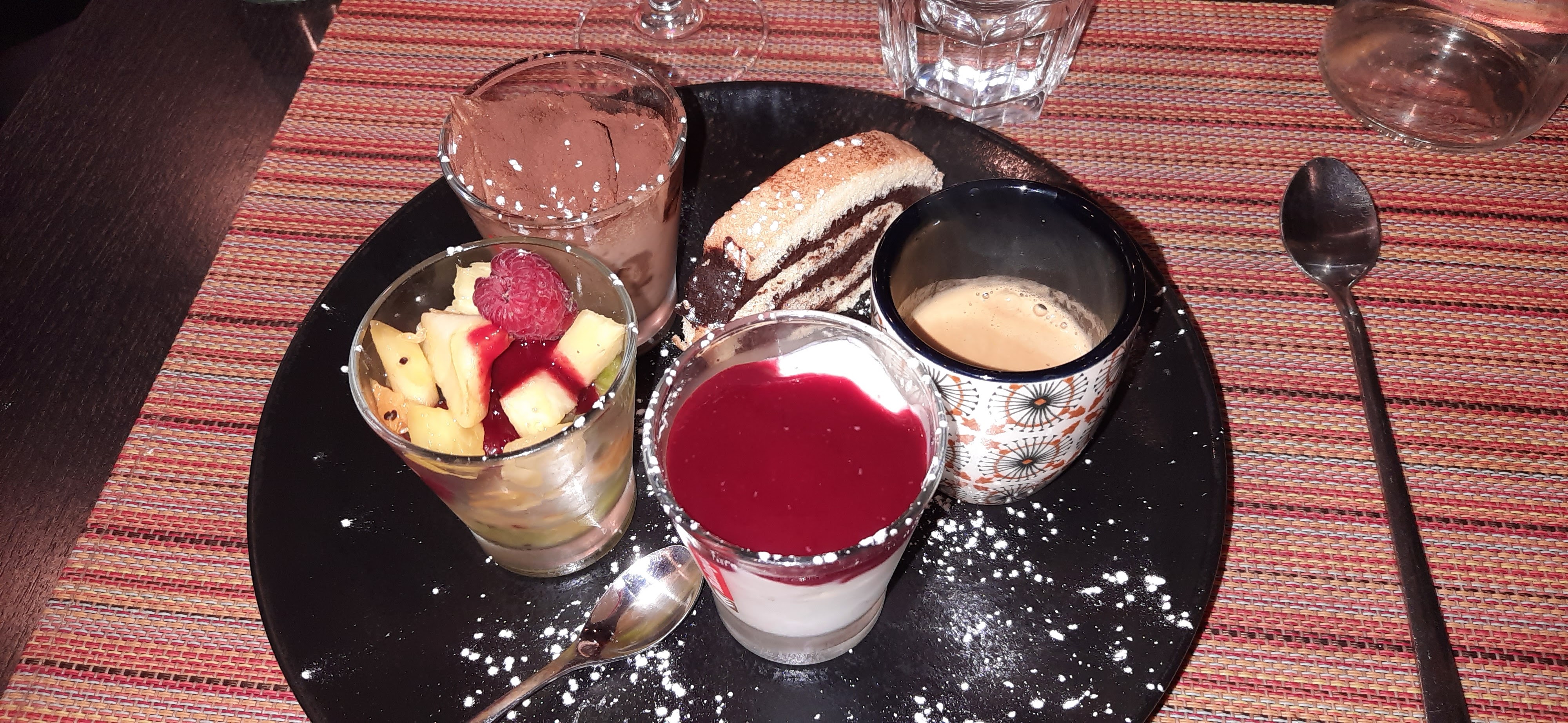 Je suis passé au hasard devant ce petit resto et je dois dire.....que je ne suis pas déçu ni par le plat (paupiette de veau) ni par le dessert (tiramisu revisité) et bien sur son prix : 15€ plat + dessert I was here by chance in this little restaurant and I have to say.....that I was not disappointed either by the dish (veal paupiette) or by the dessert (revisited tiramisu) and of course its price: 15€ dish + dessert.....