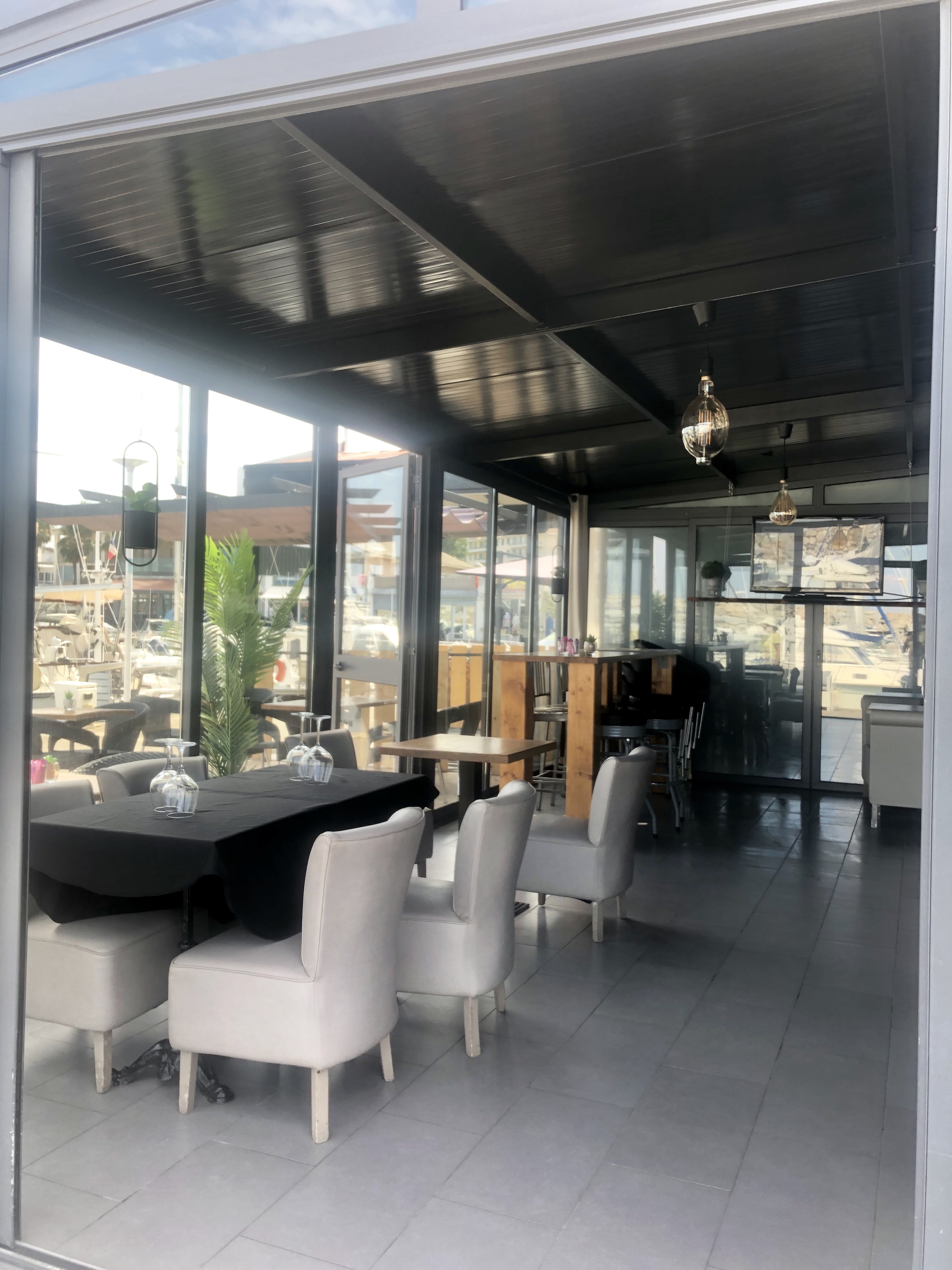 Service rapide et agréable ,terasse à.fleur de.bateau sur le.port