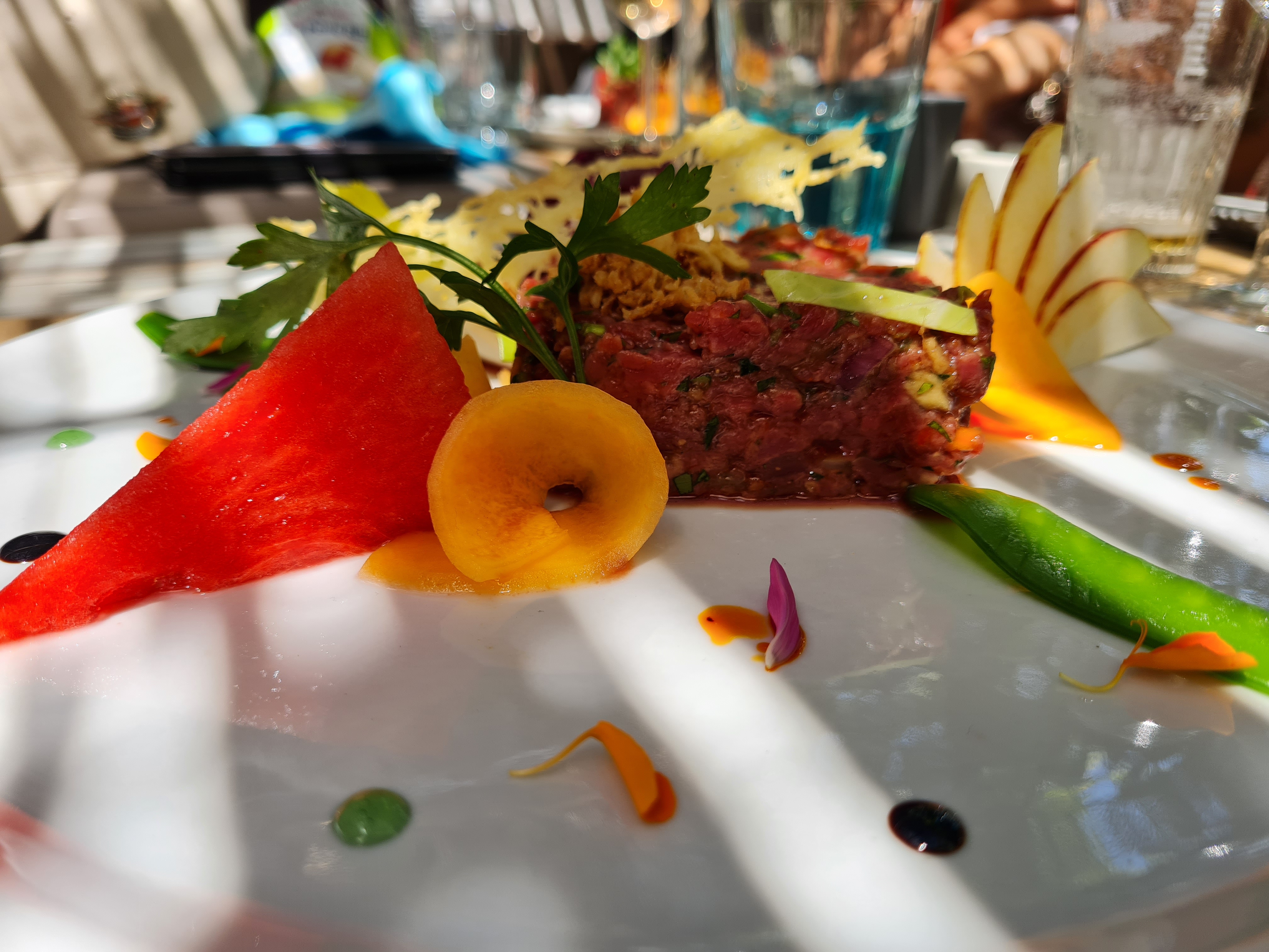 Les plats sont présentés comme de petites œuvres d'art. Le restaurant n'a pas volé son nom, ni question de situation ni d'originalité. Taquineries de langue.