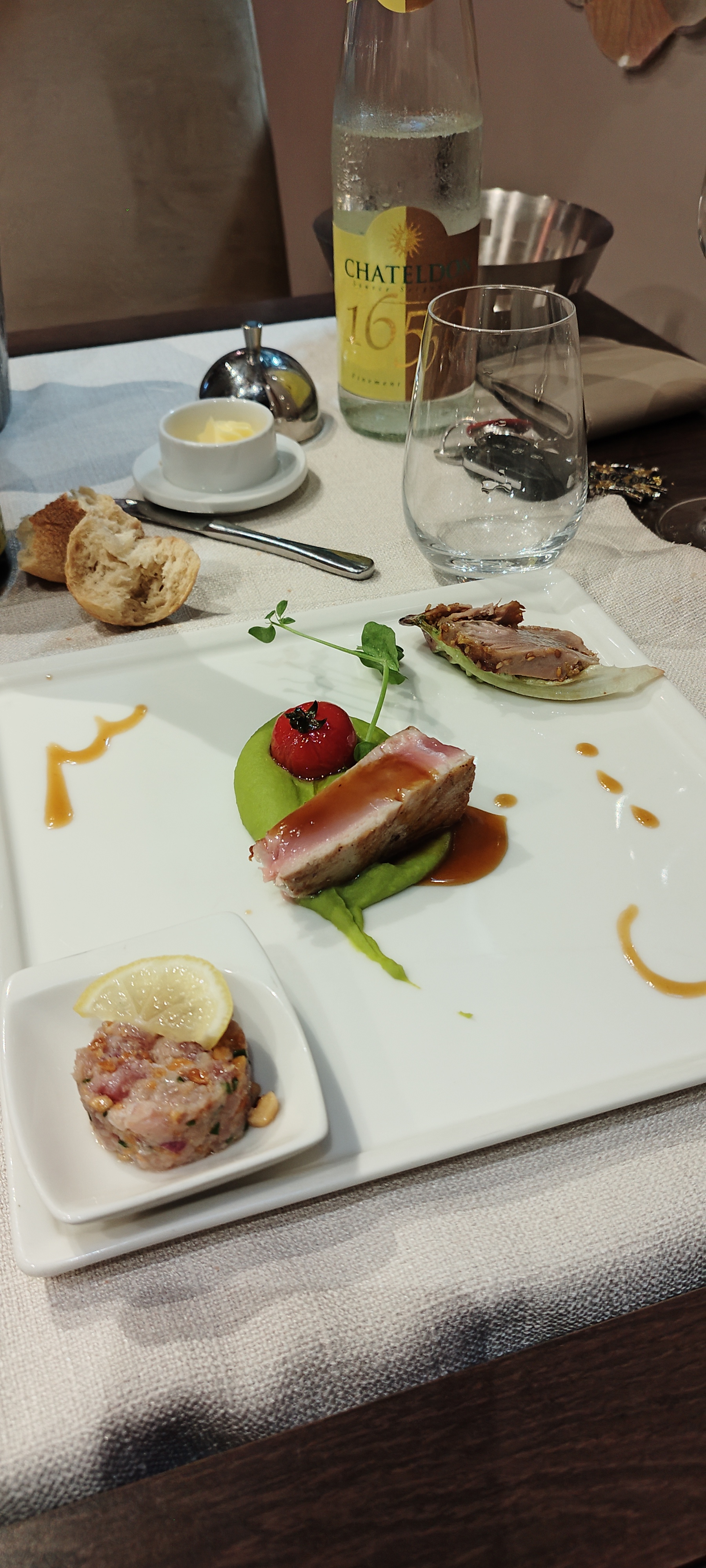 Un grand moment de régal ce midi .. Menu trilogie : déclinaison en 3 façons pour les crevettes de Madagascar , puis de même pour le thon méditerranéen , en plat, puis trilogie autour des fraises du dauphinois.. Le tout avec des petits pains maison et un mini caquelon de beurre fumé maison… Que du bonheur dans ce joli petit village.. Je recommande fortement..