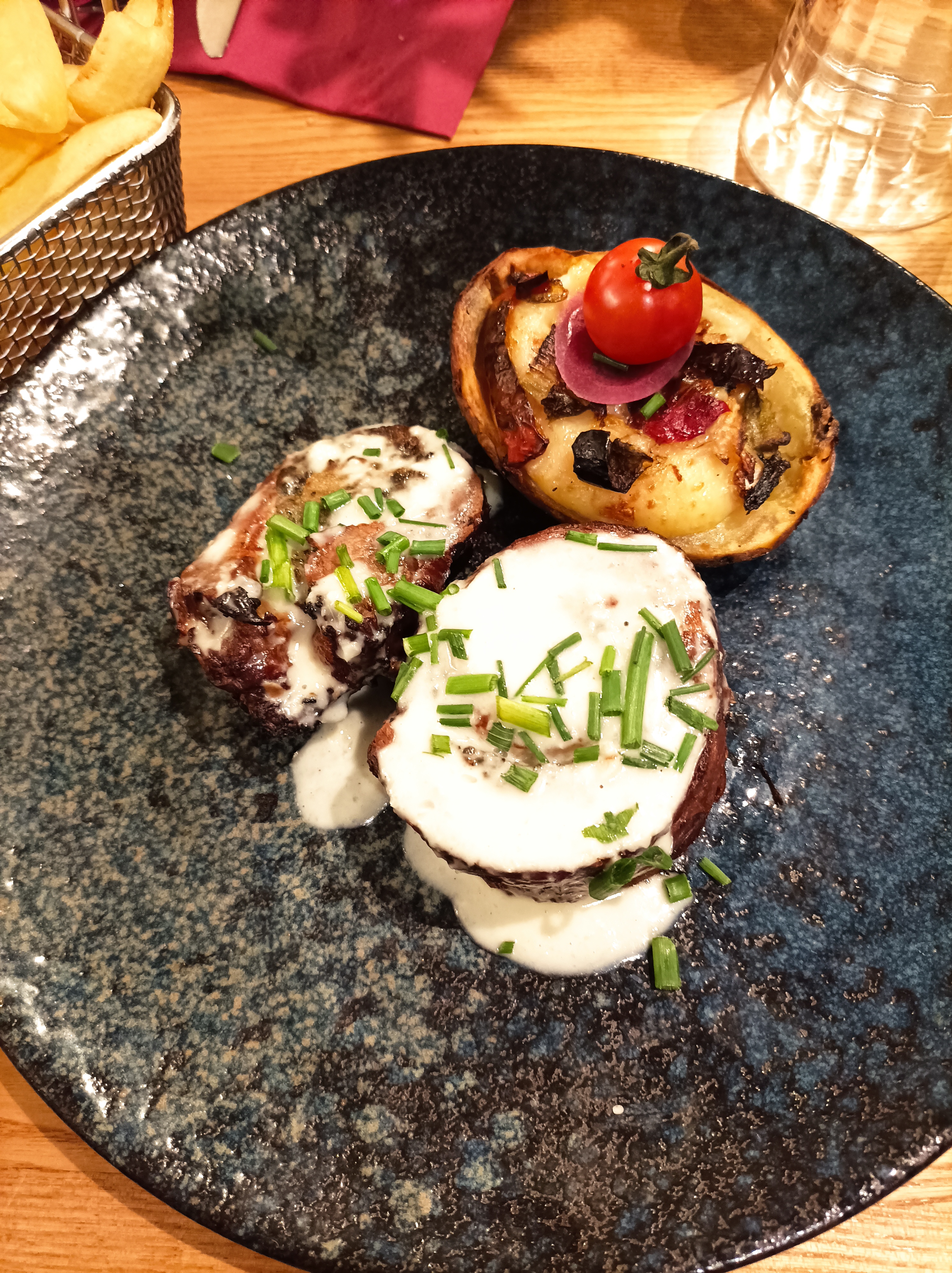 Viande trop cuite , viande très nerveuse , sauce bernaise qui n’a pas le goût de bernaise mais juste d’huile et de beurre , je ne recommande pas .