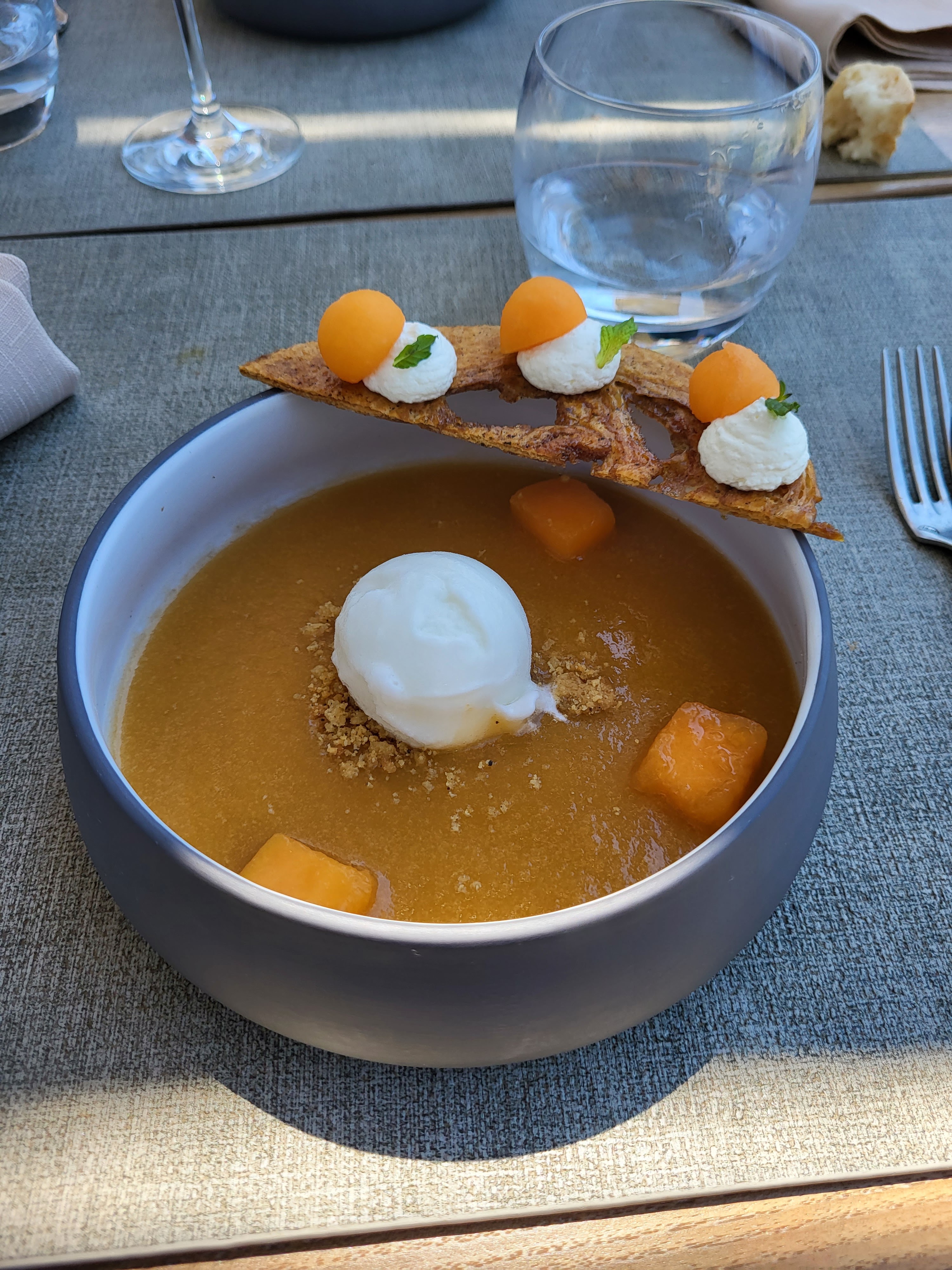 belle endroit terrasse sympa dommage que la cuisine ne soit pas à la hauteur manque d assaisonnement sur l entrée et l amuse bouche la cuissons des plats était bonne le dessert au melon était immangeable réalisé avec des melons infecte il serait bien de vérifier la qualité des produits servi surtout que nous sommes dans le pays du melons pas a la hauteur des commentaires nous ne reviendront pas dommage.