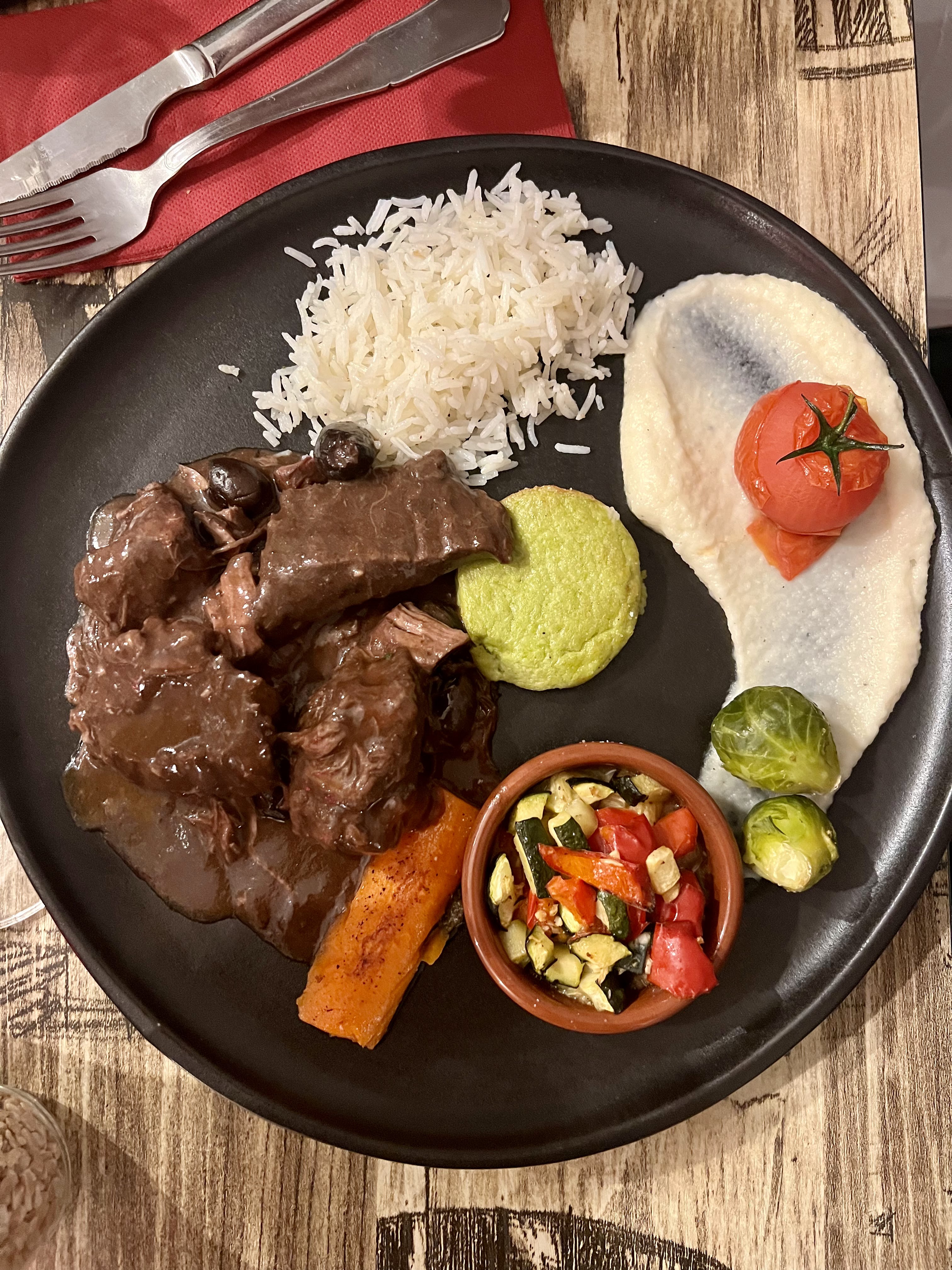 J'ai beaucoup apprécié le plat avec ses légumes variés et une part de poisson très bonne et importante je recommande cet endroit sympathique