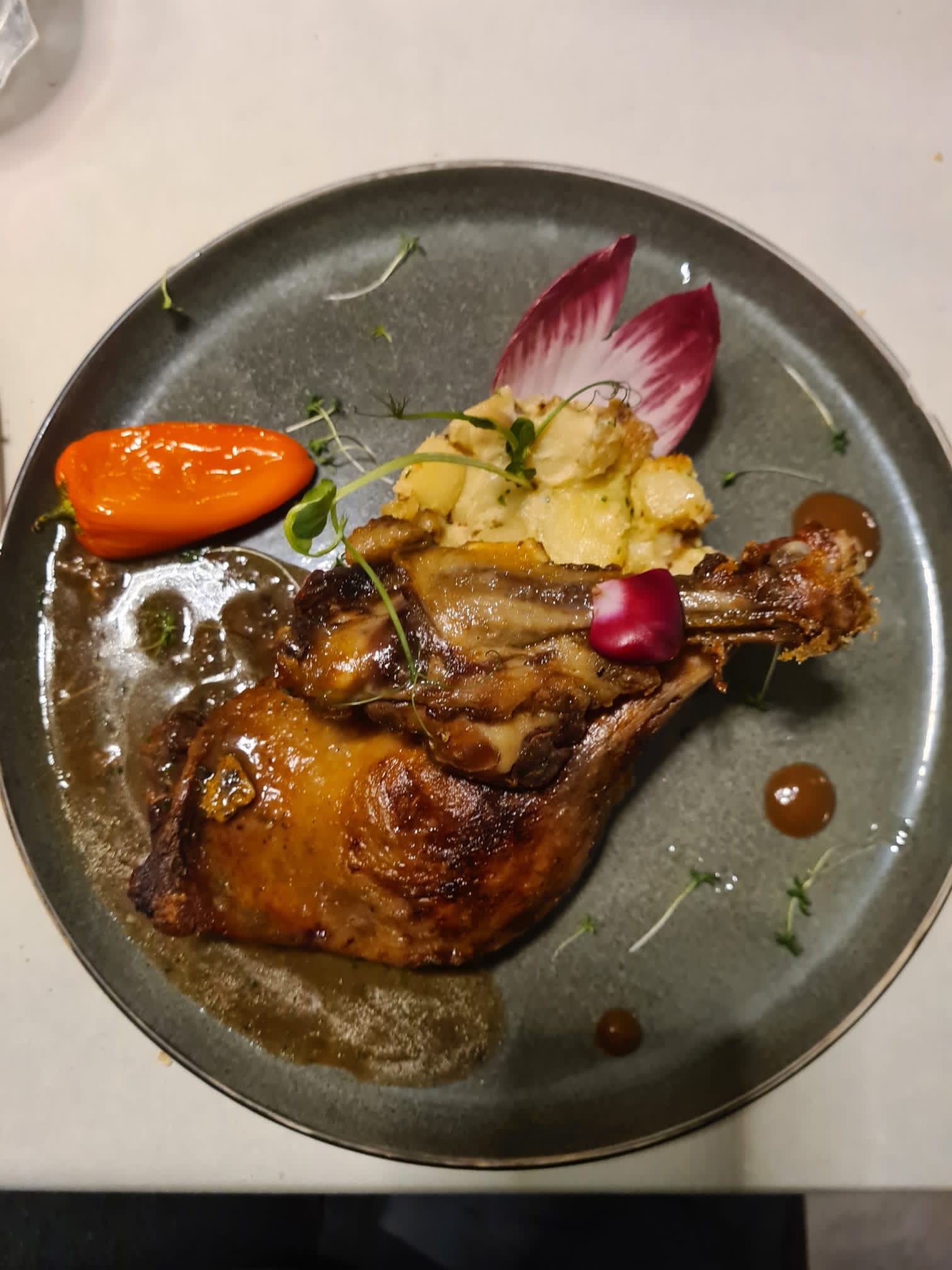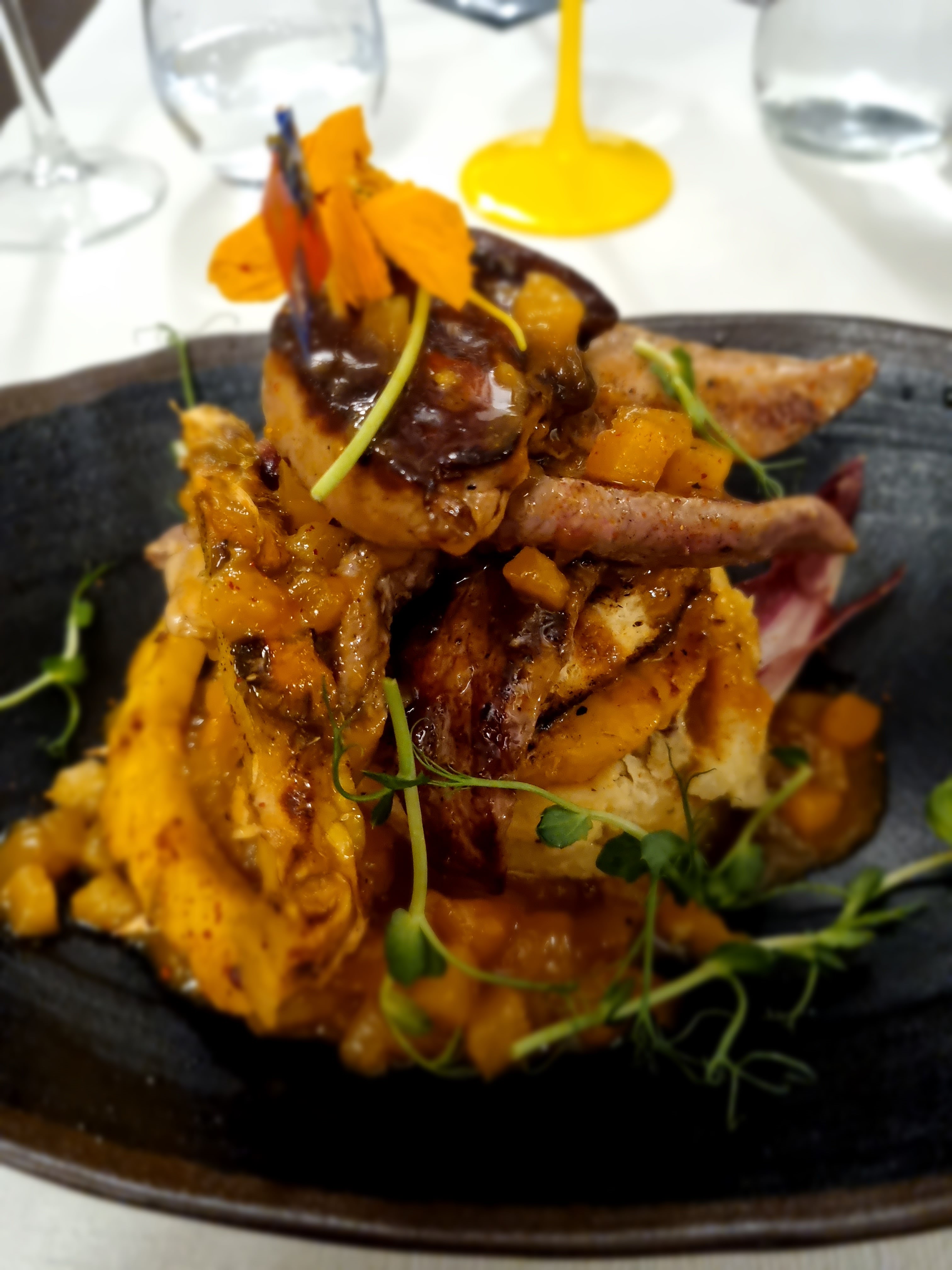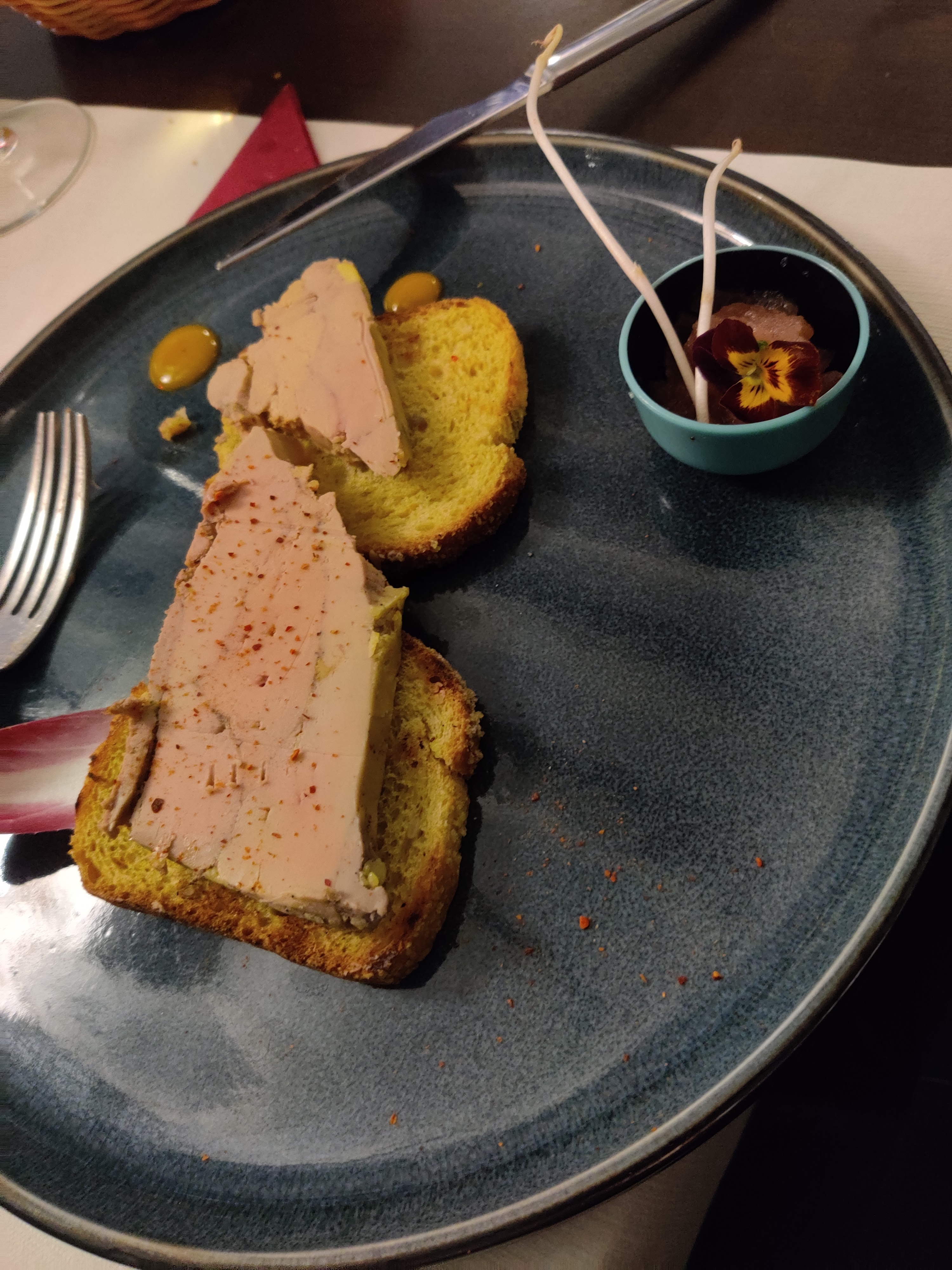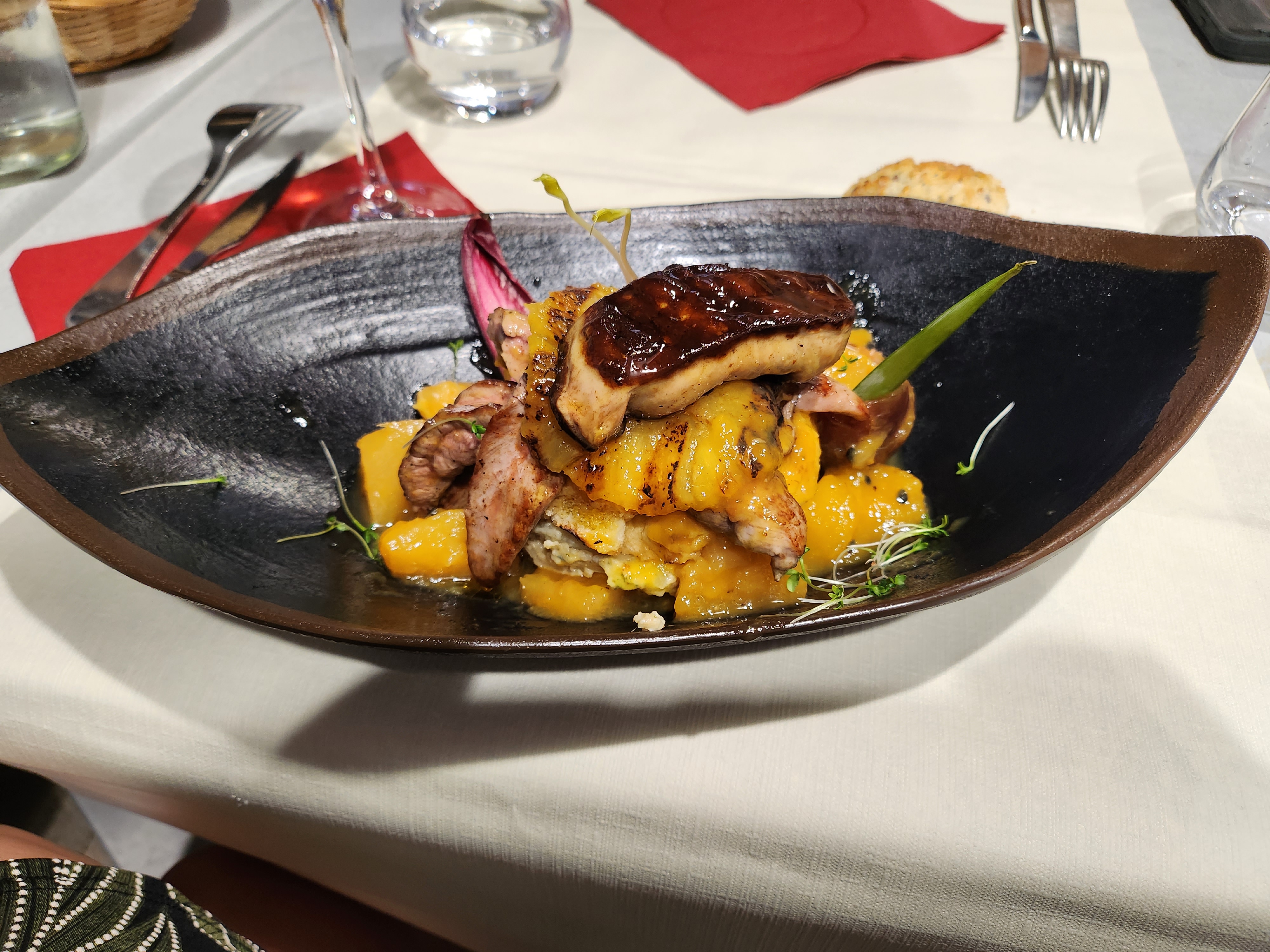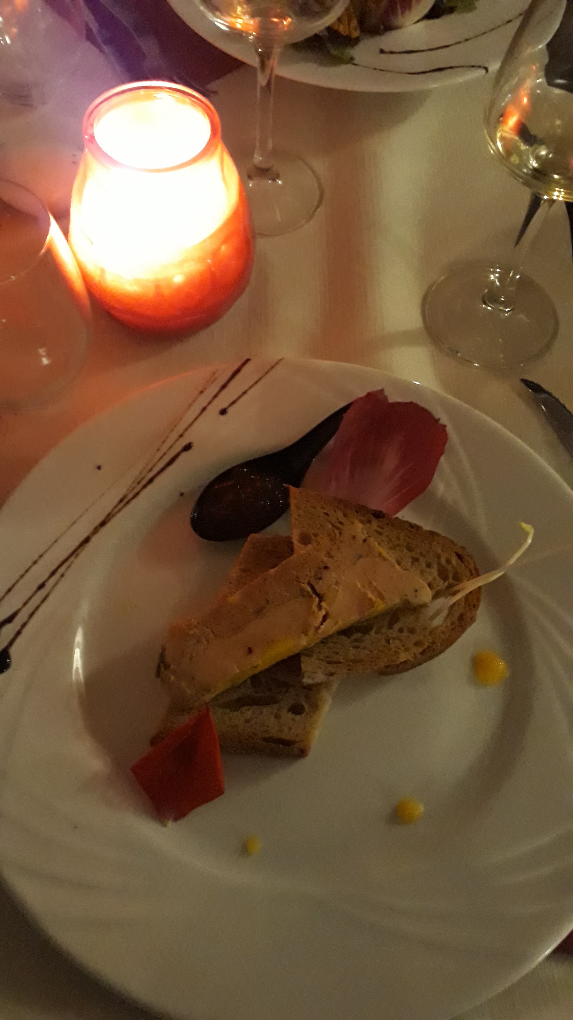 Le canard s'est le roi de ce restaurant :) Accueil sympathique du personnel , côté cuisine :heureusement que cela est monté crescendo, l'entrée avec le foie gras poêlé ... froid m'a laissé de marbre, c'est peut être un partie pris, mais pas pour moi , mais la suite à sauvé l’honneur : rien à dire ! Le petit point NOIR, c'est la luminosité dans la salle, attention à ne pas confondre ambiance tamisée avec sombre , la carte fut difficile à comprendre et à lire ; diner dans un lieu trop sombre, le visuel des plats n'est plus là , on n'a pas pu profiter de la présentation des plats , c'est dommage ...