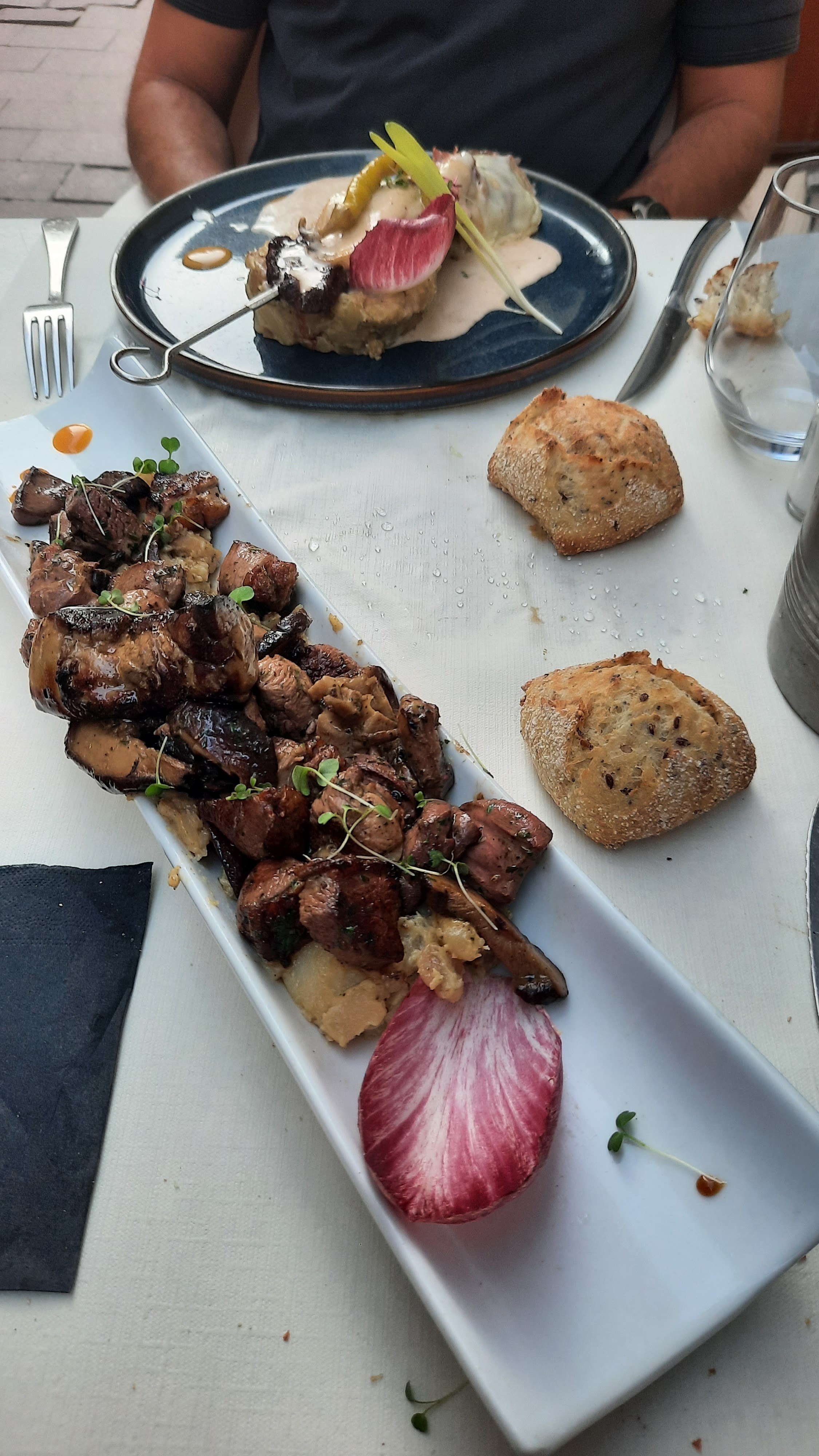 Nourriture vraiment excellente avec une super présentation (ce qui n'est pas toujours le cas). A dispo, des lampes rouge chauffantes pour l'extérieur👍