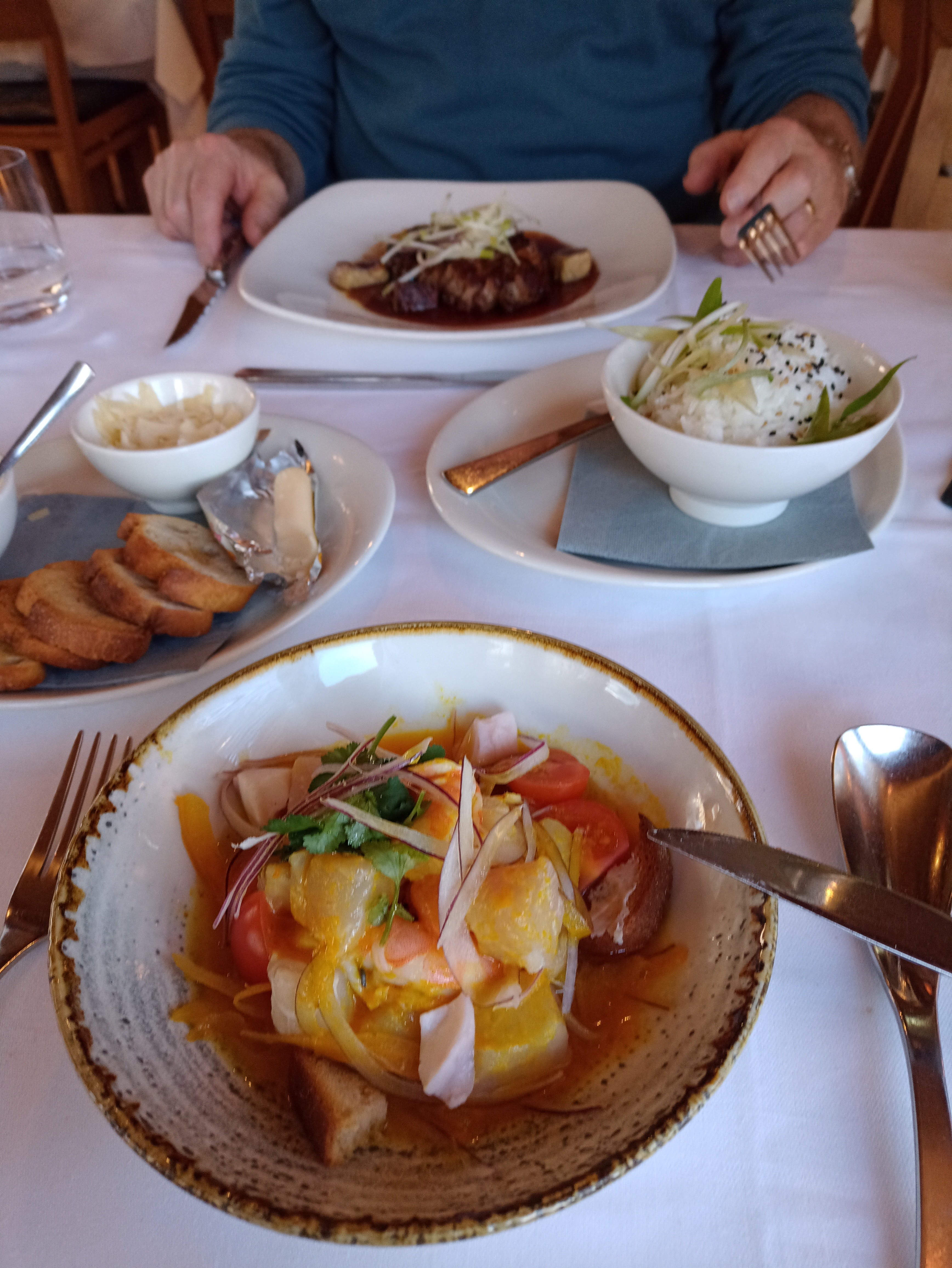 Bonne soirée au Cap Horn mais nous avons dû demander deux fois notre bouteille de vin et quatre fois un verre de vin alors que les plats sont arrivés très vite. Un peu bruyant à cause d'un groupe à proximité de notre table.