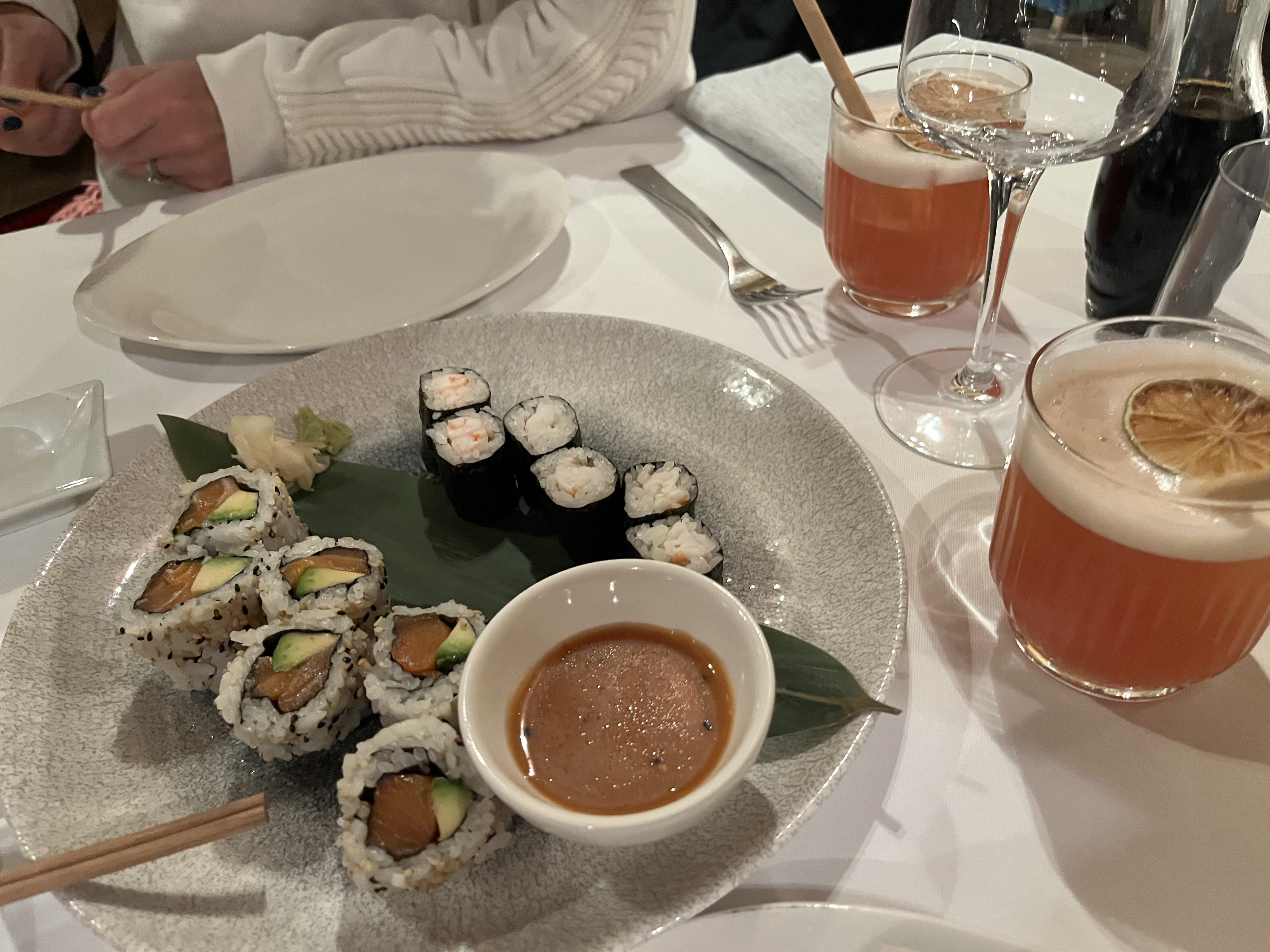 Cher pour ce que c'est. Le sushi est un fiasco. Les cocktails et les entrées étaient bons, le reste était un peu moyen.