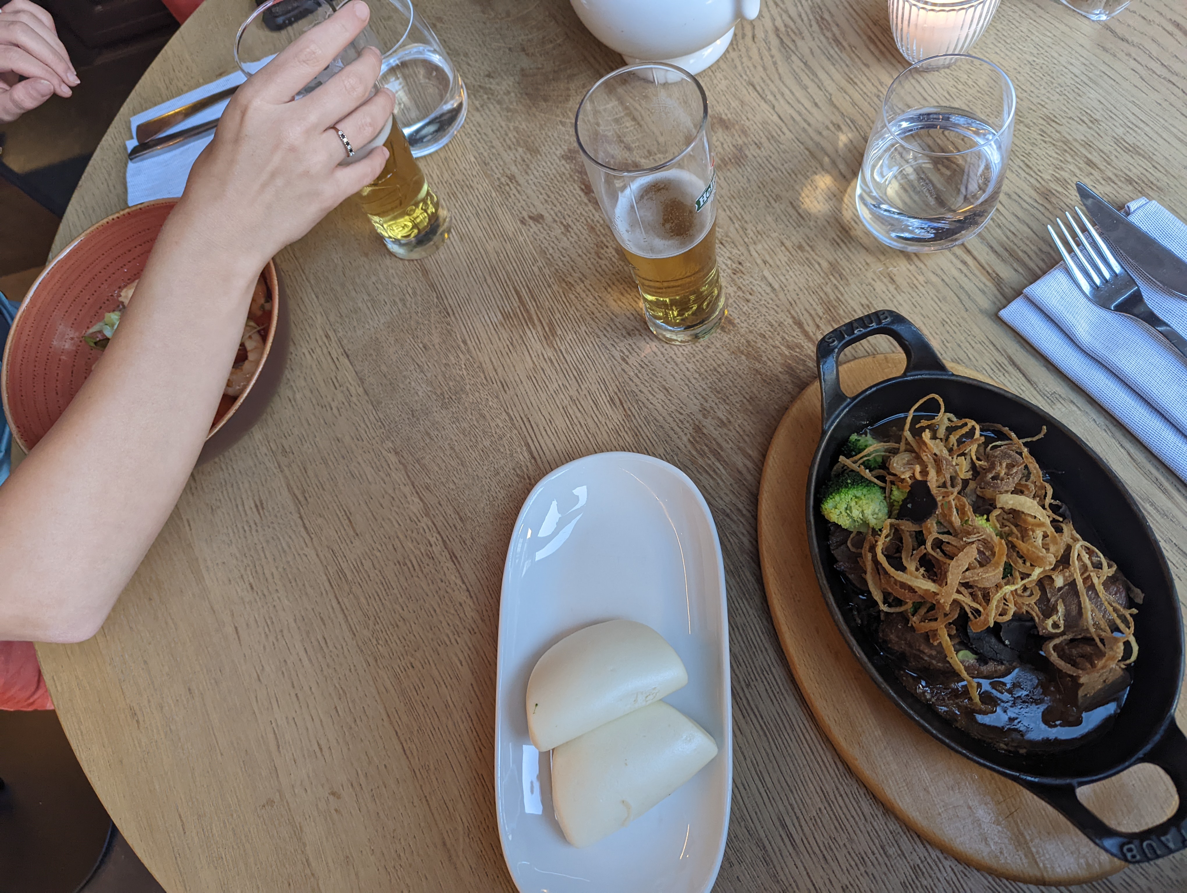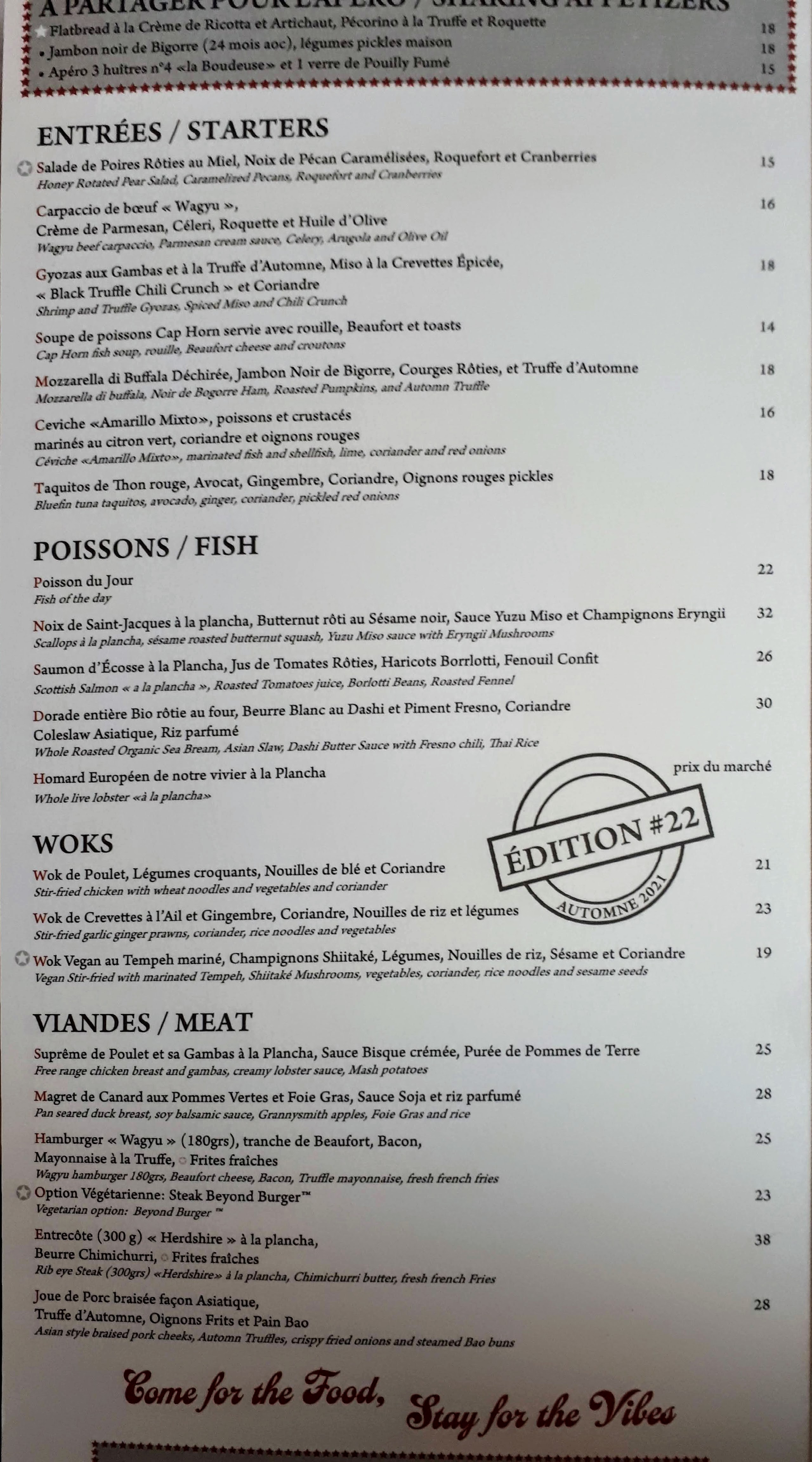 L'ambiance est ici très vivante et chaleureuse, la déco est sympa, notamment la partie verrière. On aime la plupart des plats, notamment le poisson complet et l'entrecôte, leurs frites et leur pop corn à la truffe sont savoureux ! Cependant, le gua bao aux crevettes n'est pas aussi bon qu'il y paraît, j'ai trouvé la sauce pas trop savoureuse, et ils devraient probablement hacher les crevettes pour que le goût soit plus étalé par bouchée. Il a également fallu un certain temps pour recevoir notre facture.