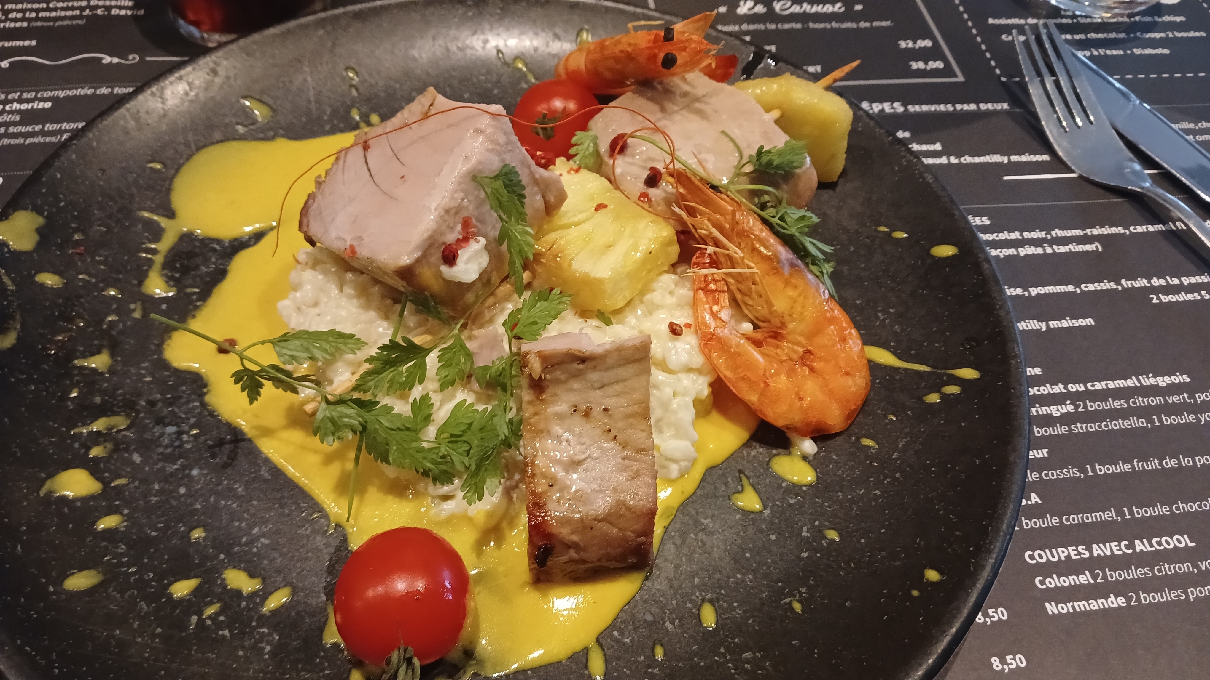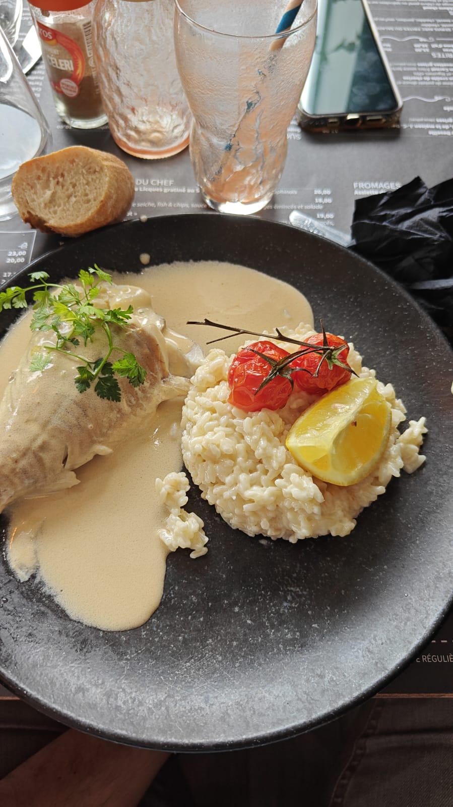 Un retour après une grosse déception l'année précédente...et c'est une réussite. Nous avons choisi le dos de cabillaud avec croûte et sauce crémeuse au chorizo. Le plat est accompagné de rattes et d'aubergines en gros cubes. Et c'était délicieux, le cabillaud cuit juste bien qui se séparait en grosses écailles nacrées ... la sauce au chorizo juste relevée et crémeuse à souhait, les petites rattes fondantes ... une réussite totale. Comme quoi il faut savoir essayer à nouveau 🤗 Le personnel, serveuse et réceptionniste très souriants et aimables ce qui est un plus évident !