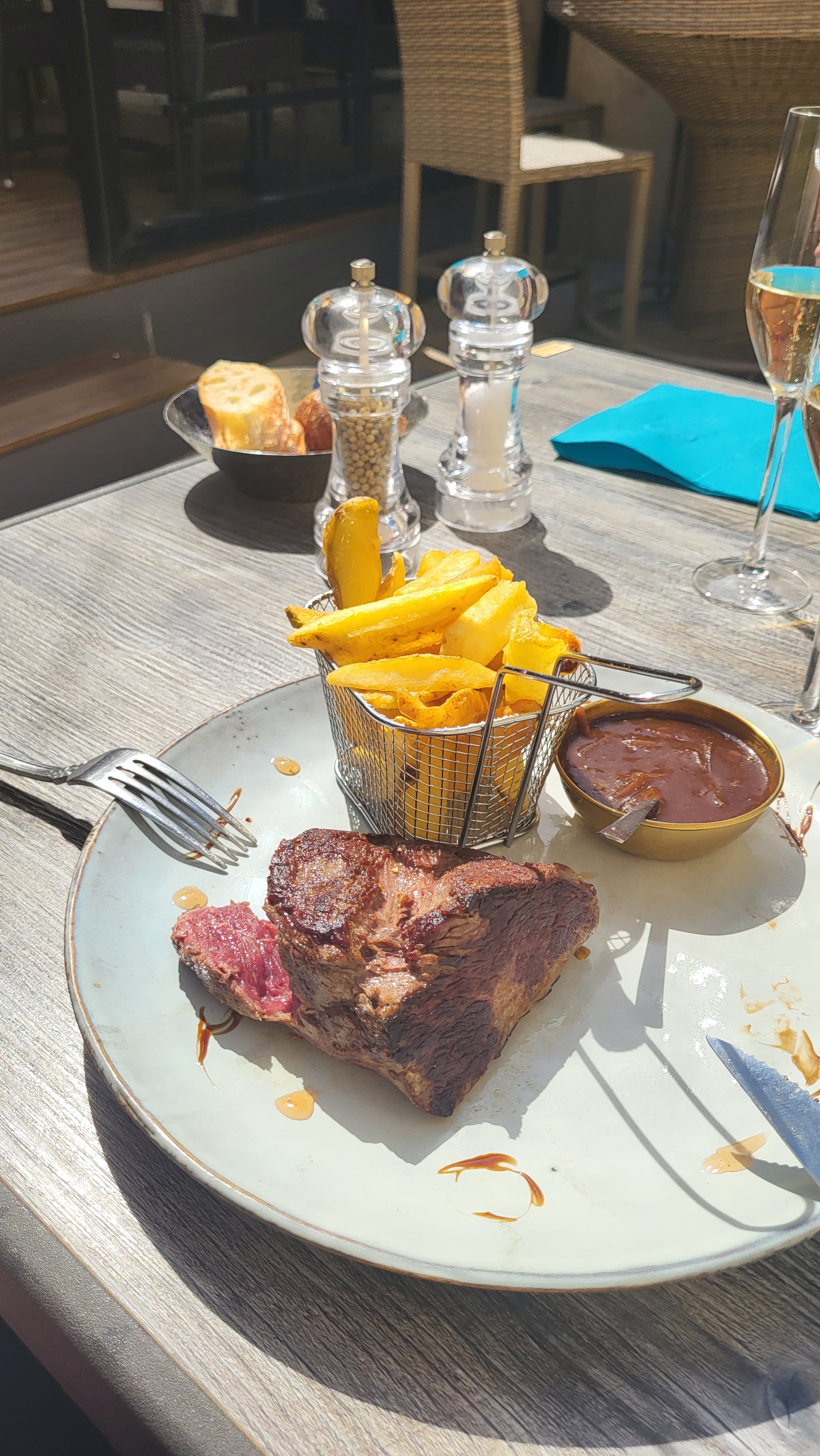 Très joli cadre, personnel accueillant et agréable, service rapide. Les cocktails étaient bien présentés et généreux. Nous regretterons par contre que, étant donné les tarifs pratiqués, les frites ne soient pas faites maison, la côte de bœuf un peu trop grasse à mon goût et la cuisson demandé saignante était plutôt bleue. Bon moment passé dans l’ensemble.