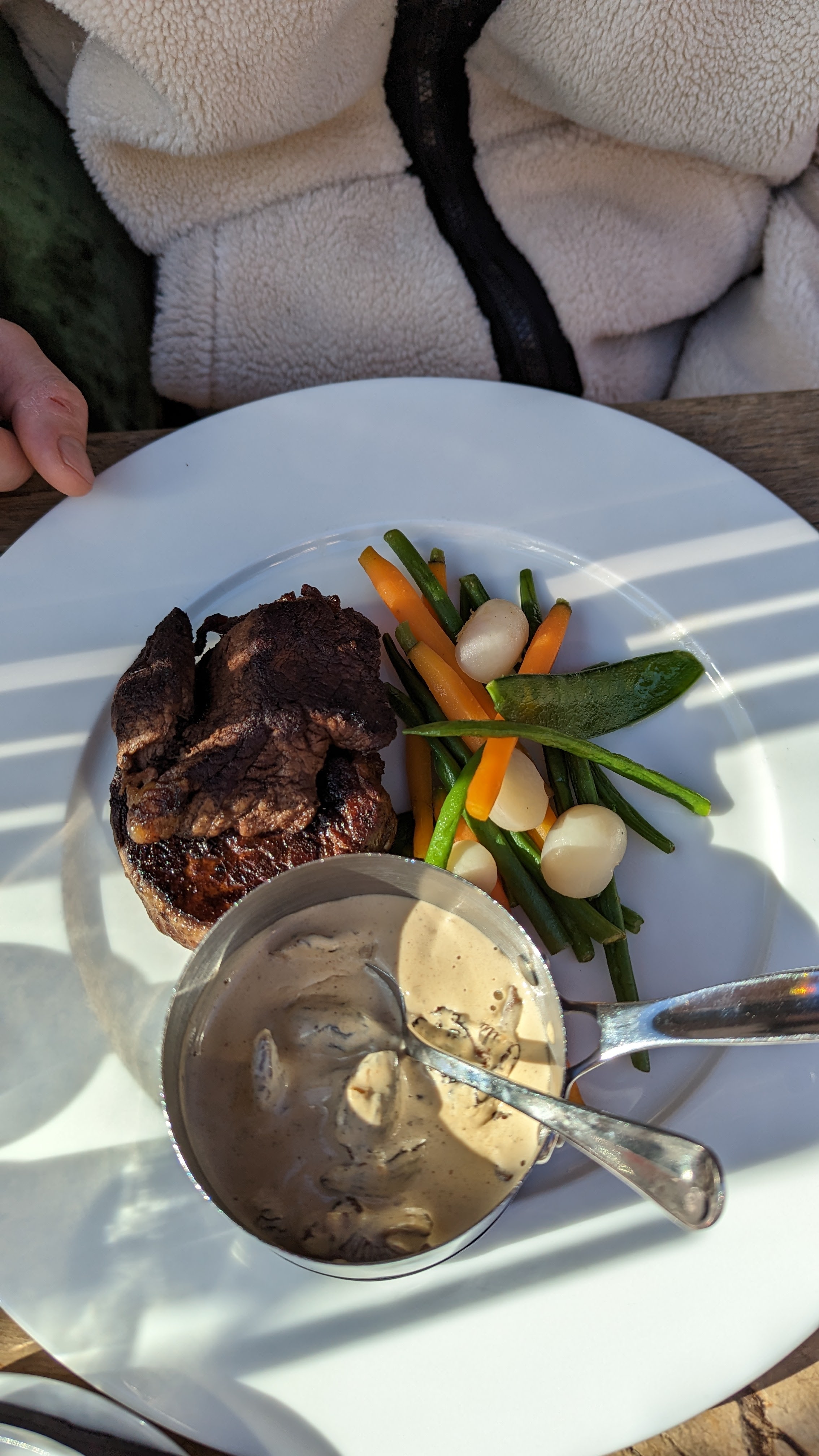 Le Carrousel avait l'air prometteur grâce à son emplacement agréable et son menu raffiné. L'ambiance semblait agréable, avec les tables éclairées aux chandelles, etc. Notre expérience s'est rapidement détériorée lorsque le chanteur a commencé à parcourir les tables - voix OK mais choix de chansons très intéressants et l'errance était un peu gênante. Le vin était bon et le service bon, avec une bonne entrée en terrine, mais nos plats étaient vraiment décevants (et pas bon marché !). Le gratin dauphinois était clairement réchauffé et n'avait pas été bien cuit au départ, les carottes étaient crues, j'ai commandé un steak mi-saignant et il est sorti presque cru (heureusement, j'aime aussi un steak saignant, mais il aurait été immangeable pour les autres). Dans l'ensemble, je ne le recommanderais pas du tout - le restaurant devrait embaucher un nouveau chef au lieu de chanteurs médiocres, et il était beaucoup moins haut de gamme qu'il ne le prétendait. Cela vaut bien mieux de manger dans un endroit simple mais fiable.