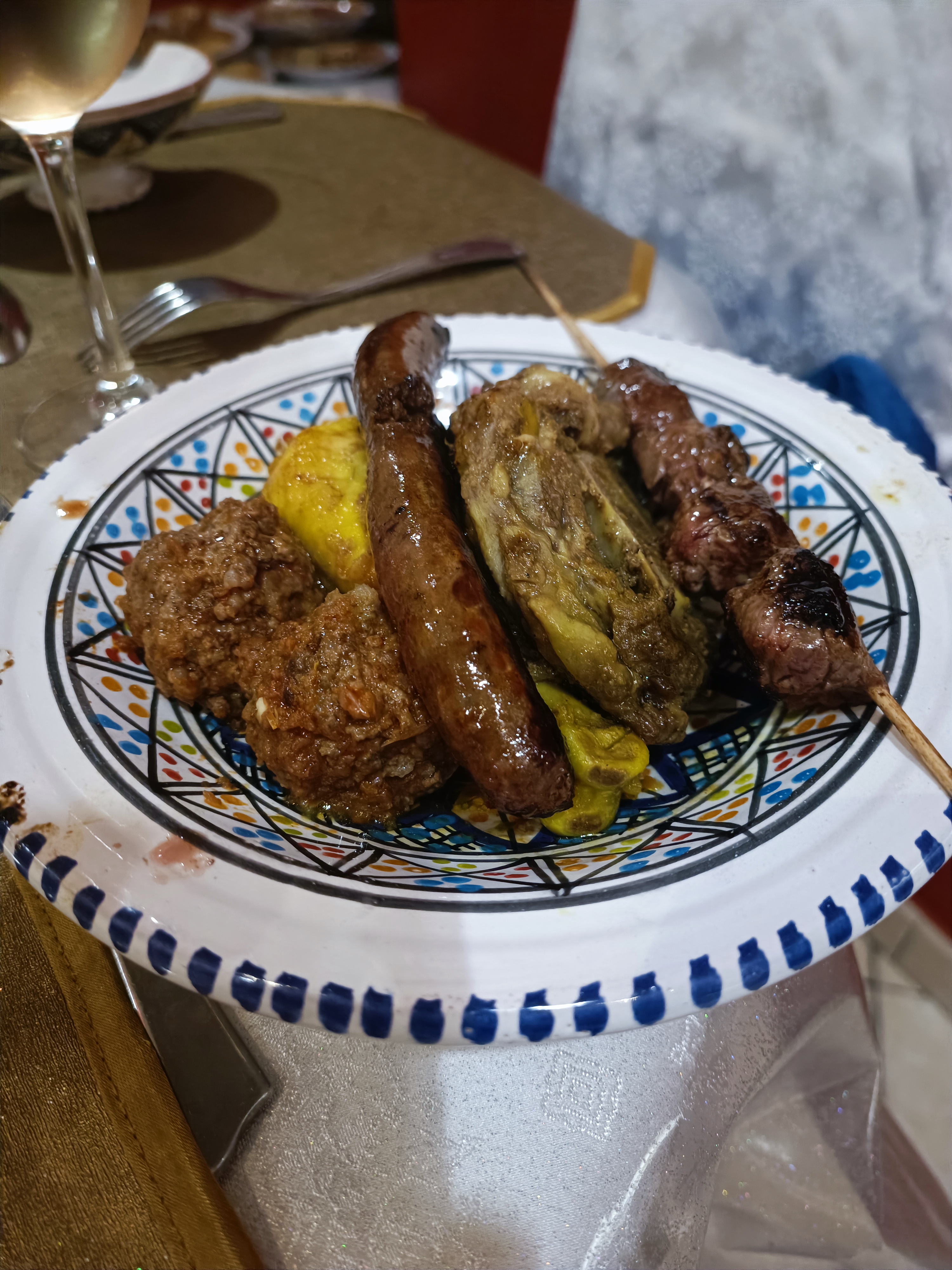 3 étoiles me paraissent pas assez mais 4 c'est clairement trop alors pour moi ce restaurant mérite plutôt 3.5 étoiles dans la cotation Google. Le restaurant est situé dans un petite rue adjacente très proche de la rue piétonne. La décoration est plutot vieillotte et il y a des éléments qui ne devraient pas être visibles par les clients comme un vélo électrique ou des boîtes de comptabilité. Il y a aussi la tenue vestimentaire du personnel qui n est clairement pas digne de n importe quel restaurant surtout pour le service du samedi soir. La viande que nous avons eu était bonne mais la grainé et le bouillon nettement moins bien. Les portions sont vraiment petites et nous aurions souhaité avoir quelques petits à côté comme des raisins et de l oignon confit que l on retrouve souvent dans la cuisine marocaine mais qui n étaient pas de sortie dans ce restaurant. Nous avons goûté la partie couscous du restaurant et il y a une partie méditerranéenne sur la carte que nous ne gouterons probablement pas . D ailleurs nous n avons vu aucun client manger sur la carte méditerranéenne lors de notre visite.