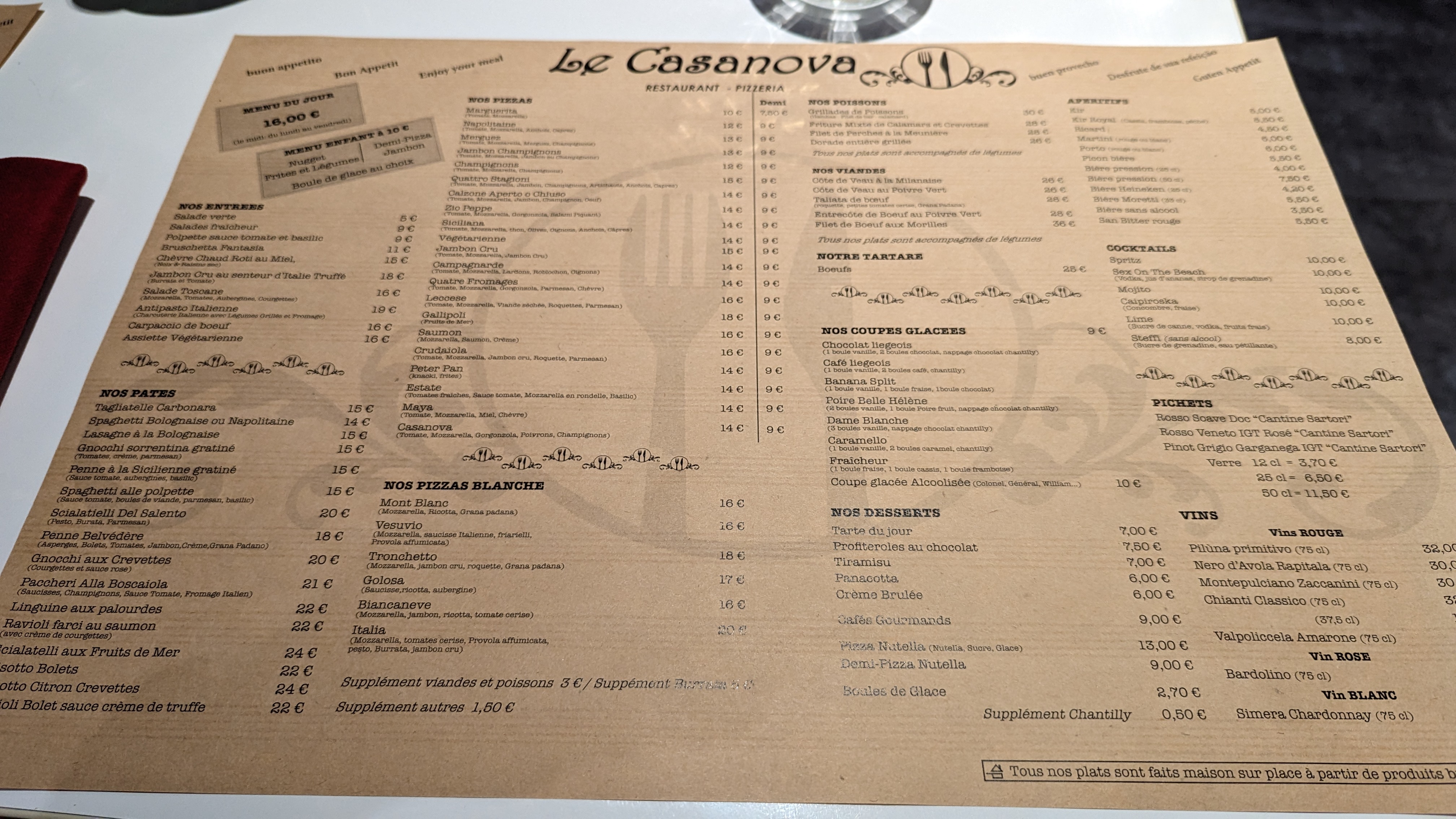 Plusieurs années que je n'étais pas revenu au Casanova. Beaucoup de changements (positifs) en salles. Les services et l'accueil toujours au top et tree réactif. Les pizza ne m'ont jamais déçu. Menu enfant nugget avec de vrais morceau de poulet. Mon ptit gars a même mangé tout les brocolis !