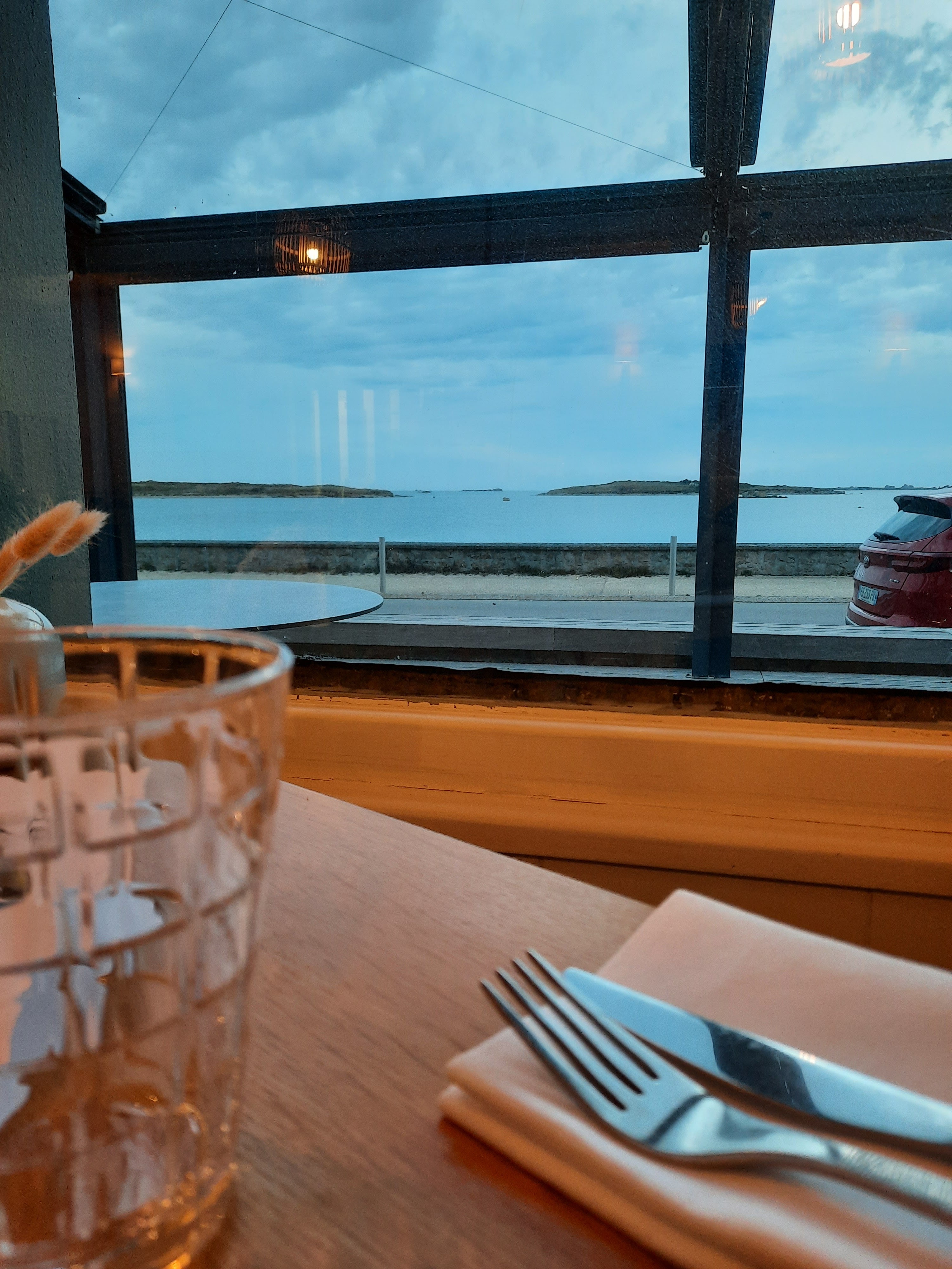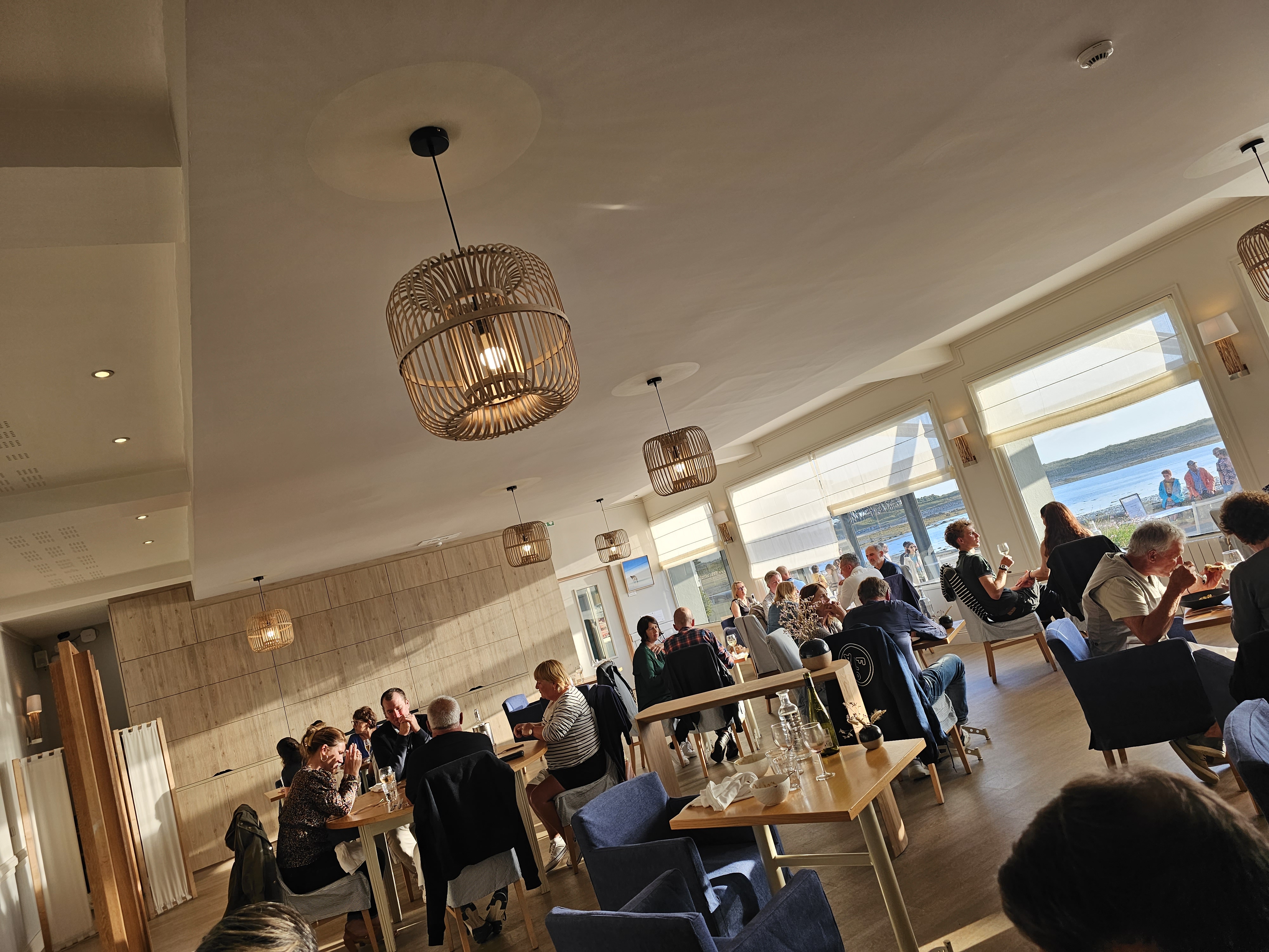 Jeudi 25/04/2024 , Service de Midi . Nous étions que 2 à y déjeuner , face à la mer , alors qu'il faisait très beau ! Cela fait bizarre de se retrouver qu'à 2 , dans une immense salle ! ------------------- Le Menu du Jour , 3 plats , est très bien ( Prévoyez quand même un budget de 30,00 Euros / personne , sans boisson ) Cuisine moderne , inventive . Le chef se décarcasse pour sortir des sentiers battus ! Par contre , n'arrivez pas avec une faim de loup , car les assiettes ne sont pas beaucoup garnies . -------------------- Peut-être faudrait il , pour le midi en semaine , un menu plus simple , moins sophistiqué ( menu du terroir ) , assorti d'un prix plus abordable , afin de remplir cette grande salle à manger située face à la mer ! ---------------------- J'y retournerai , et je prévoirai ce jour là un goûter en plus pour l'heure du thé !