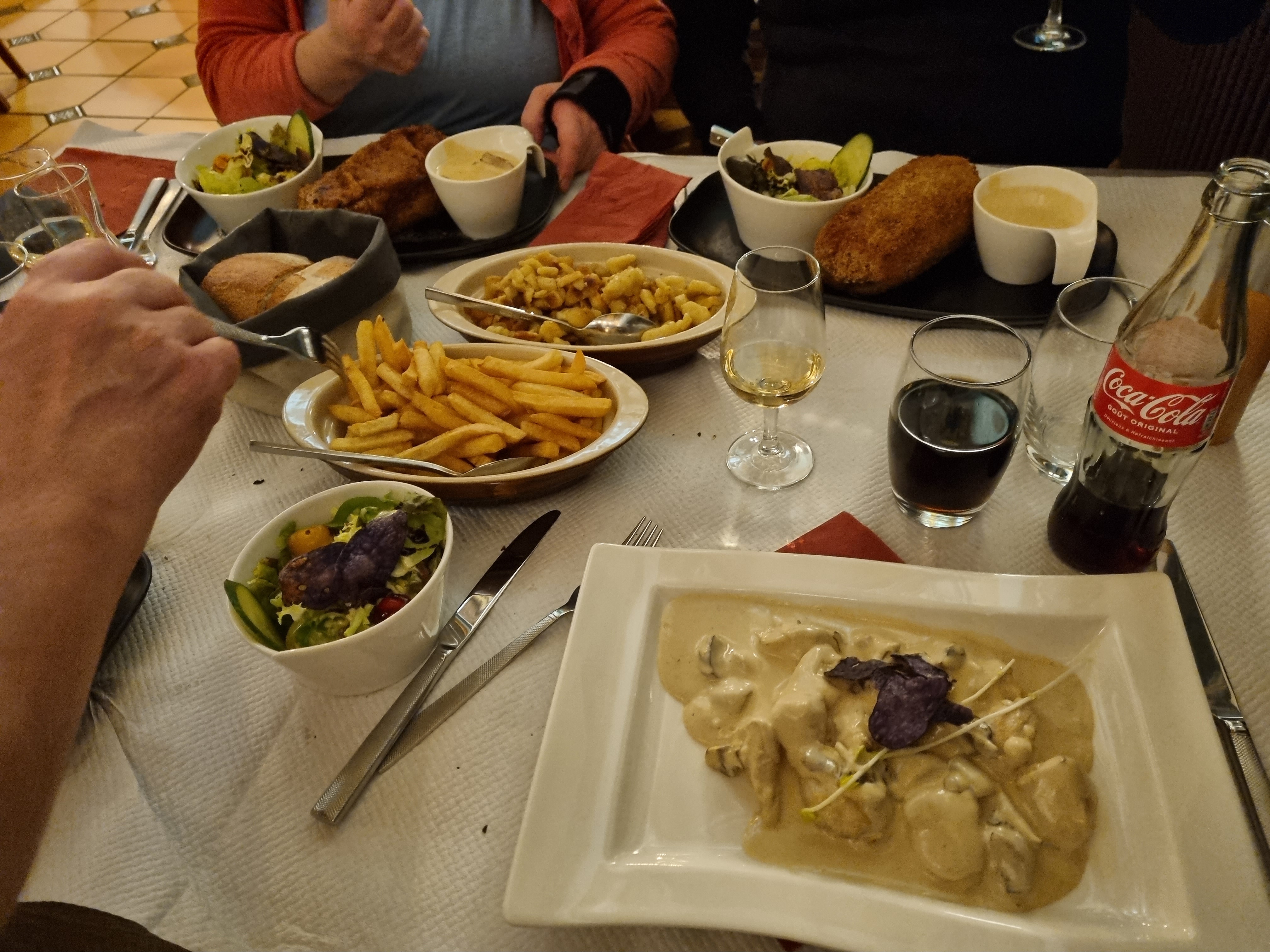 Nous avons très bien manger Une tarte flambée en entrée très bonne Ensuite 3 cordons bleu avec sauce crème champignons et émincé de poulet sauce crème champignons Avec plusieurs boissons (3/4boisons personne) et une bouteille de pinot gris ( +-30€) Et une dame blanche 🍨 et deux irish Coffee. Nous avons dépenser 45€/personne ce qui est très correct au vue de la quantité servie. nous reviendrons 😊