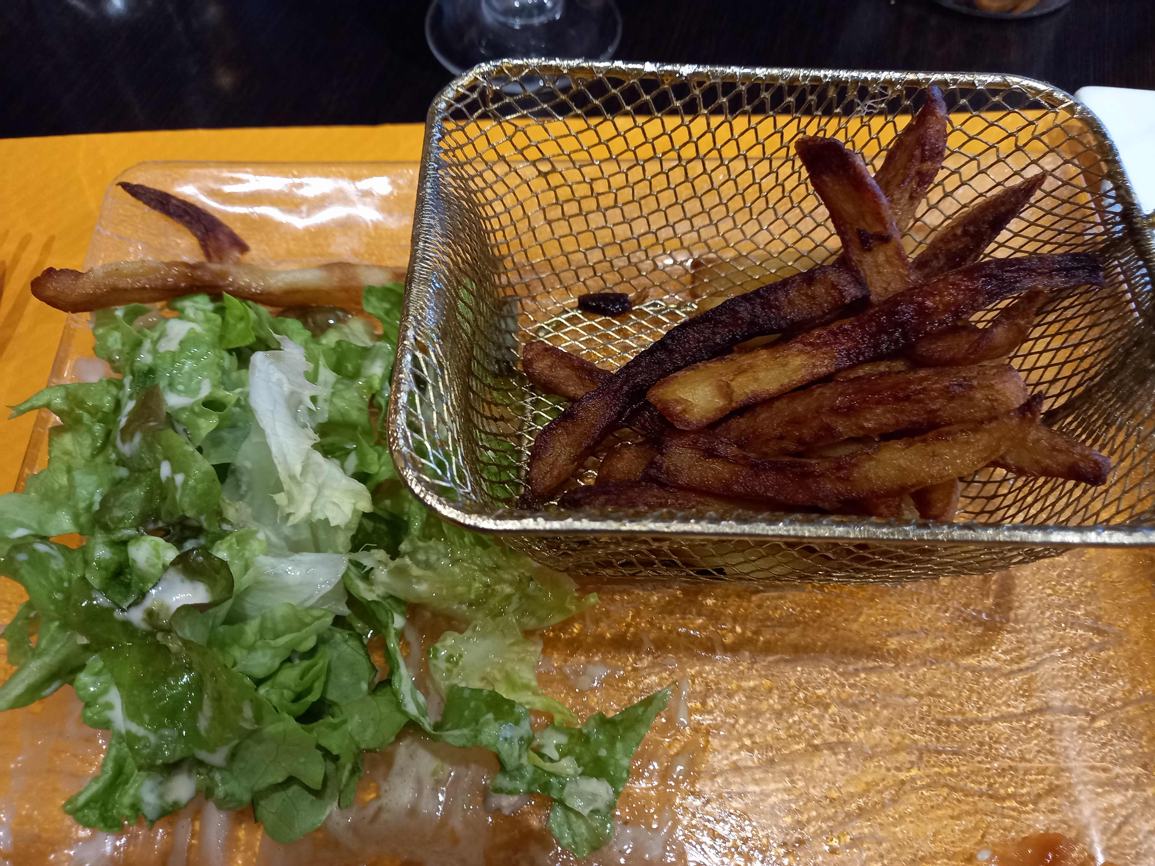 Je ne reviendrai pas ici... 1) La serveuse ne sait pas renseigner le client sur la composition des plats. Je demande ce qu'il y a dans le burger maison, et notamment s'il contient du bacon, elle me répond Je sais pas trop, c'est un burger classique quoi... 2) J'ai quand même commandé un burger maison (qui était bon, d'où mes 2 étoiles) cependant, la salade servie avec comportait des feuilles fanées, et les frites étaient immangeables (bourrées d'huile) alors que pourtant je ne suis pas hyper regardant d'habitude (cf photo)