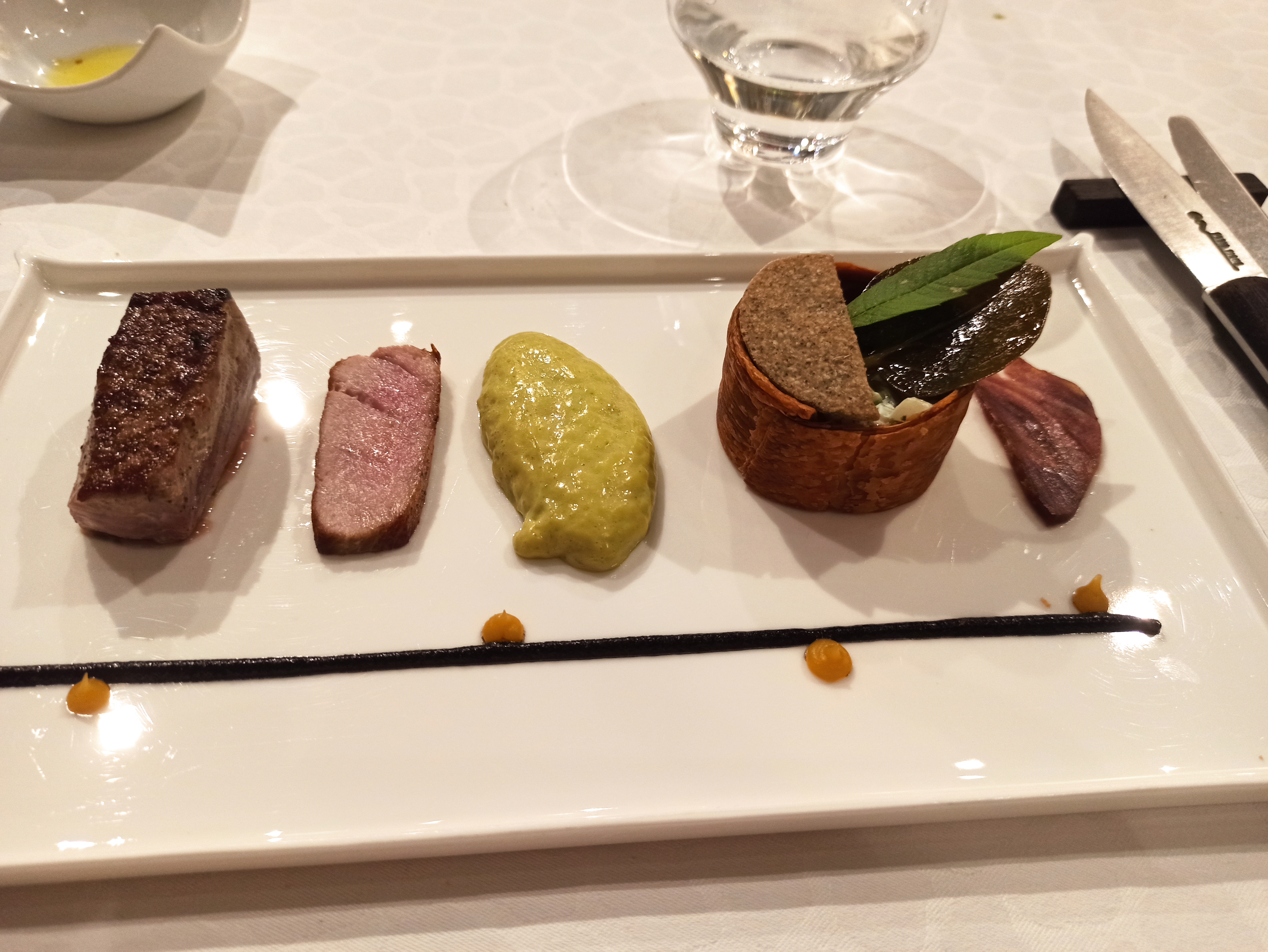 Superbes assiettes aux saveurs originales et recherchées, décor moderne et chic avec un tableau de Caravage peint sur un mur complet, vaisselle variée, service chic et prix à la hauteur de la gastronomie du lieu, choix de la sélection Michelin, 65€ le 1er menu 3 plats avec plusieurs amuse-bouches incroyables en entrée et des mignardises au dessert.