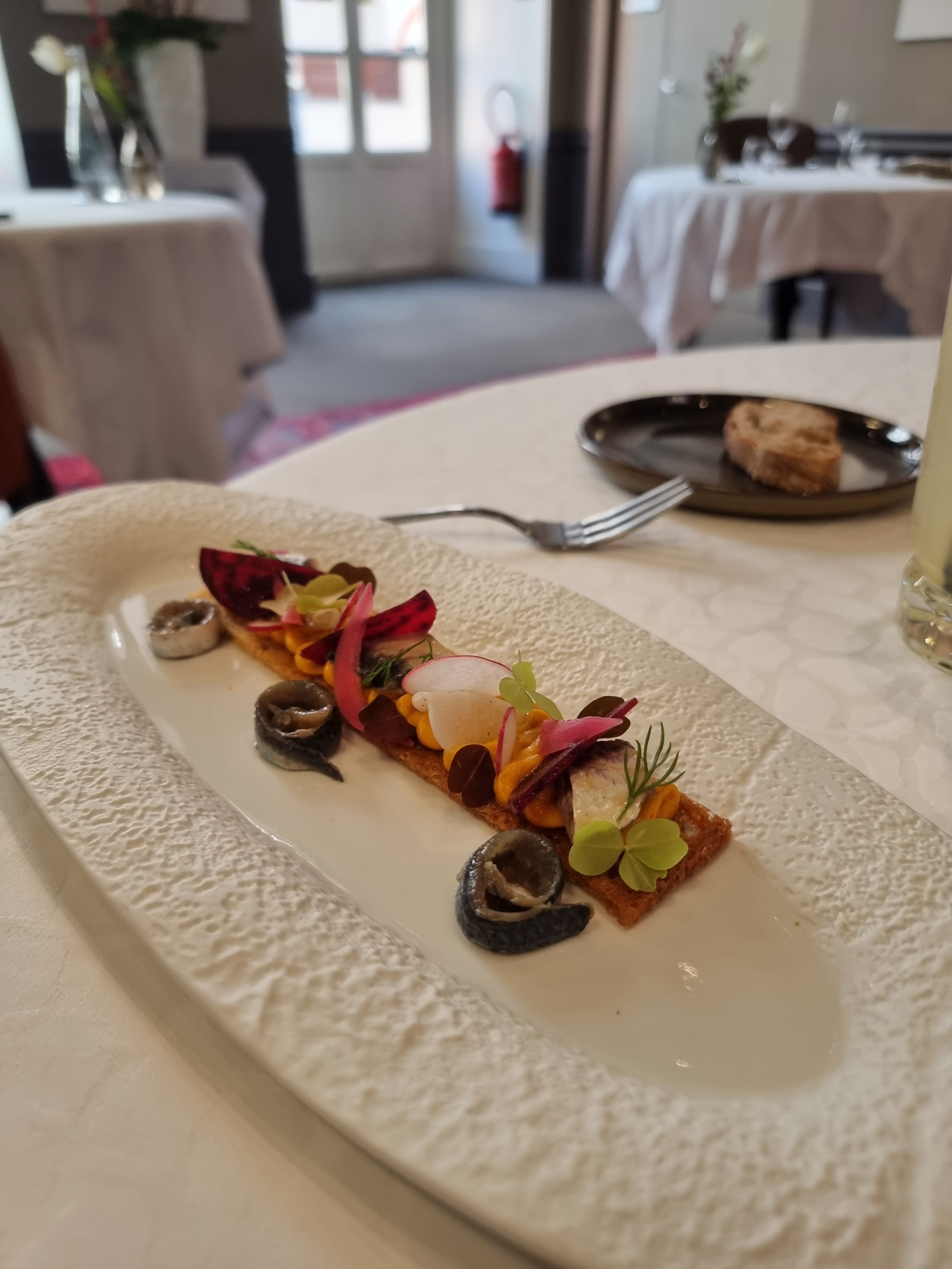 C’est parce que mon amie Marie connait bien la maman du nouveau chef Clément Convard que nous sommes venus dans ce restaurant étoilé au guide Michelin. Bien nous en a pris, car je dois dire que c’est un des meilleurs repas que j’ai dégusté de bout en bout. En plus l’accueil y est extraordinaire : de la chef de rang à la dernière embauchée en passant par un sommelier aux explications expertes et un serveur d’expérience qui devance nos besoins, tout est parfait. Le contenu des assiettes est prodigieux, rien que de revoir les photographies, j’en salive encore. Comment vous décrire les associations des mets, les saveurs qui s’en dégagent, le plaisir subtil et profond que provoque chaque bouchée ? Nous sommes restés les derniers à discuter avec ce personnel d’exception qui nous donne tellement envie de revenir le plus tôt possible. Il me faut cependant trouver une mauvaise note pour l’équilibre de mon discours : c’est en baissant les yeux que nous voyons d’affreux tapis bien usagés qui contrastent avec les œuvres d’art dans nos assiettes et l’élégance du service.