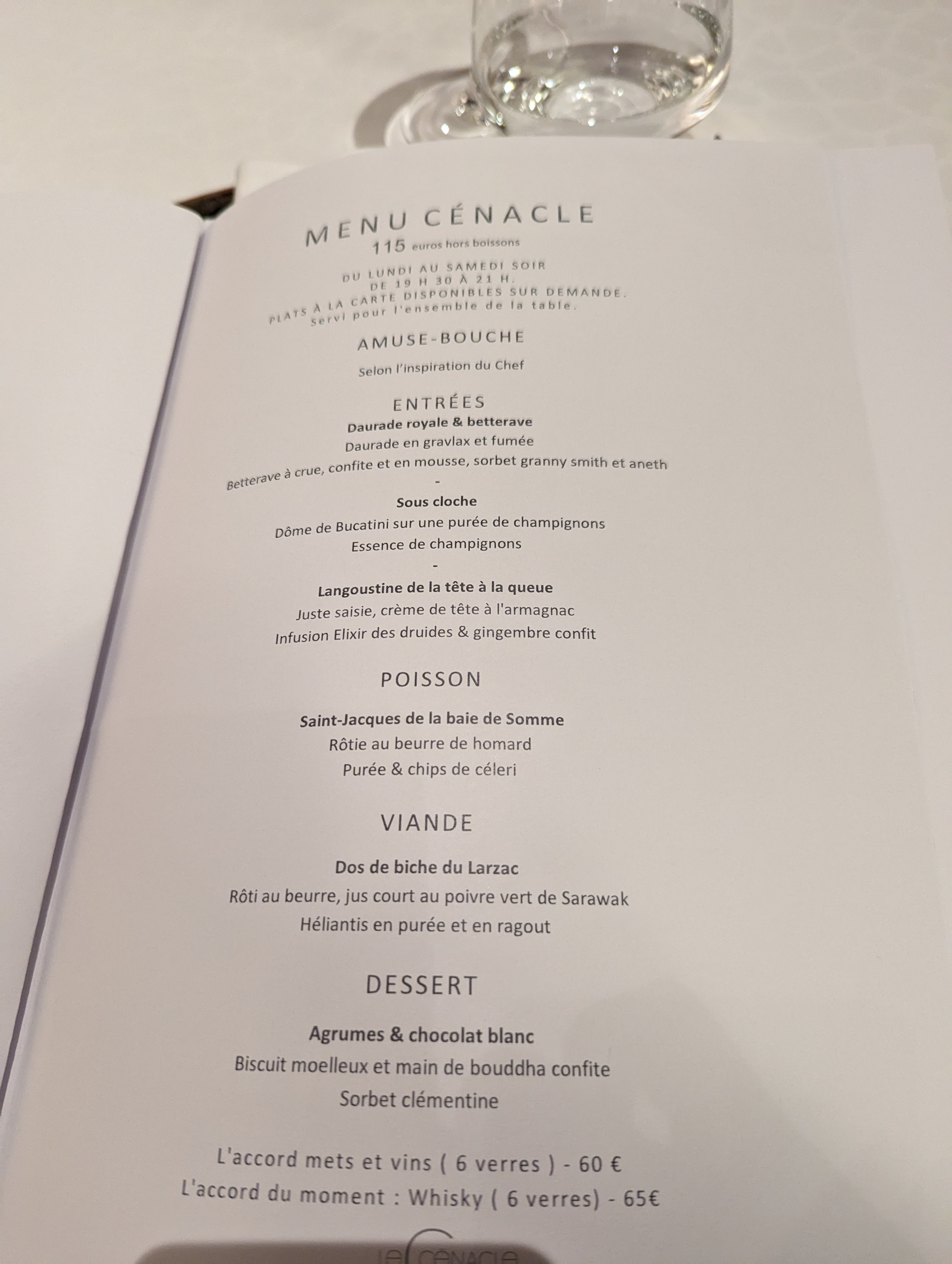 Après un accueil un peu mitigé, nous avons finalement passé un excellent repas au Cénacle avec la très bonne formule déjeuner. Le cadre est élégant et les tables assez espacées. Le service a été parfaitement exécuté avec les serveurs Léo, Philippine et la chef de salle qui ont tous étés aux petits soins des amuses bouche jusqu’à la bougie d’anniversaire. Les différents plats étaient très bons et bien travaillés. Merci à toute l’équipe !