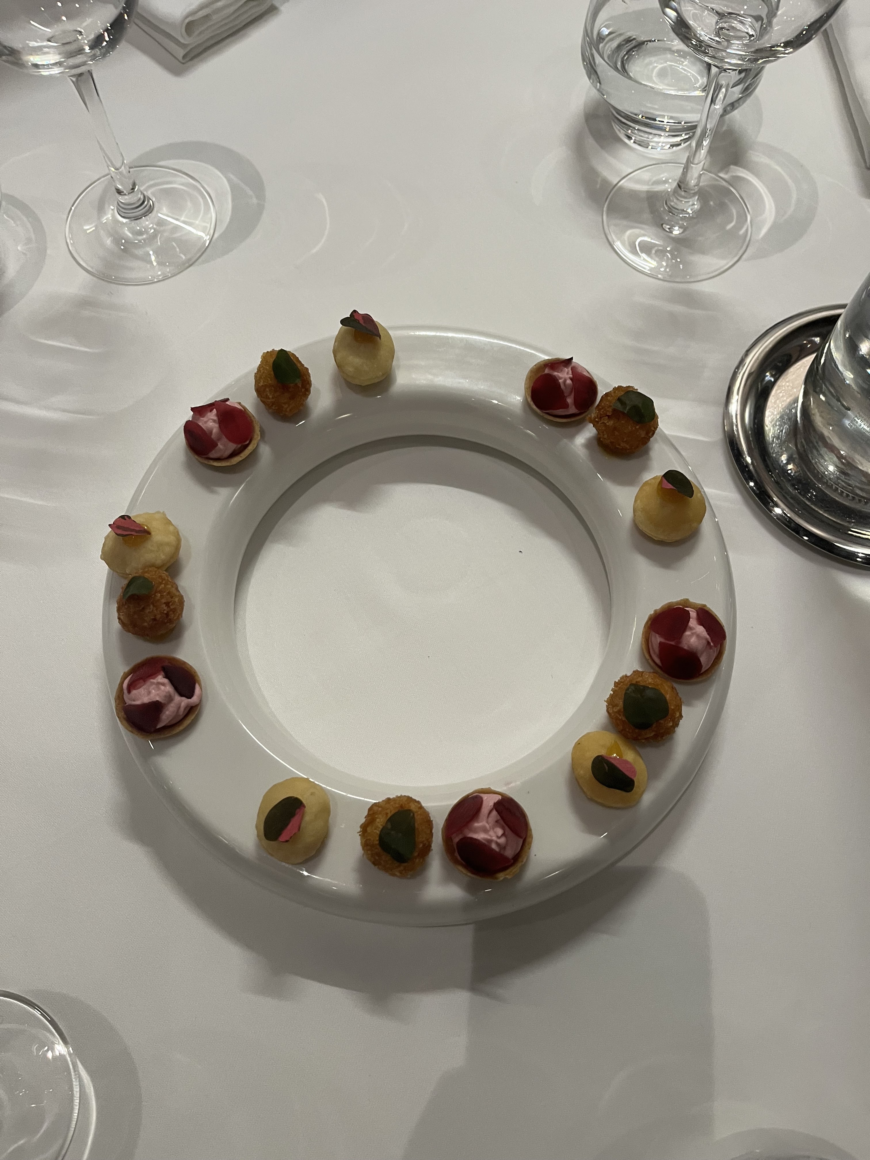 Salle magnifique, repas exceptionnel avec de belles découvertes comme le pithiviers, l'huître hallucinante ou les muse en bouches très délicates, service un peu long et choix des vins pas vraiment adaptés à nos goûts, dommage car cela gâche un peu le plaisir...