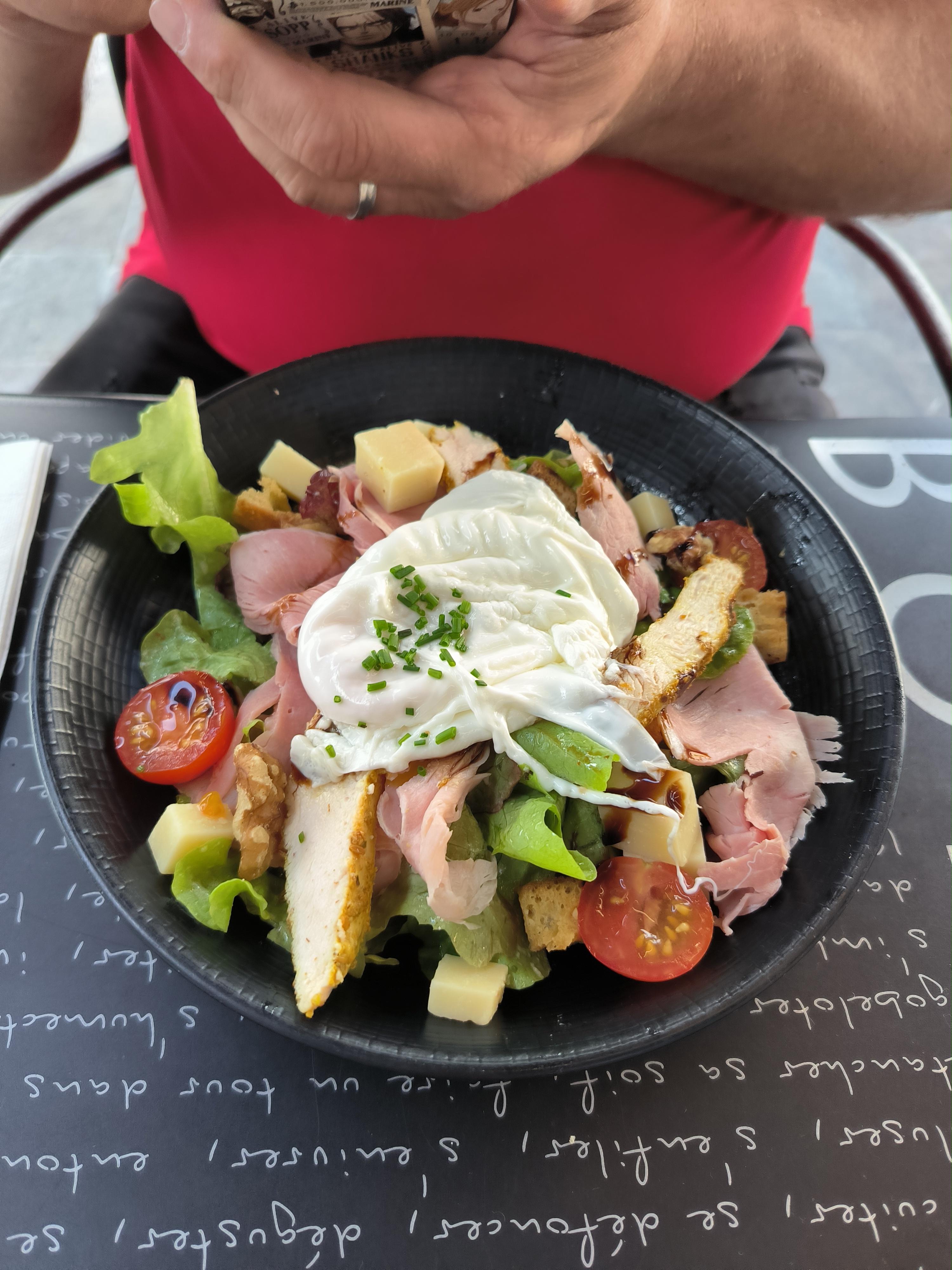 La serveuse qui nous a prit de haut pendant tout le service a vraiment été un désagrément pour nous car nous lui avons demandé de changer nos verres et couverts qui étaient sales, puis nous nous renseignons si la bouteille d'eau pétillante d'1L est en verre où en plastique (pour voir si nous pouvions l'emporter où pas si pas fini) et nous dis du coup vous prendrez de l'eau en carafe 😱 et lorsqu'elle débarrasse nos assiettes ne demande même pas si ça été bref. Les salades (petite faim) étaient copieuses mais on a trouvé cher quand même voir photo. La salade césar devrait être de la romaine et ça été de la feuille de chêne et la sauce ne correspond pas du tout au vrai assaisonnement (mais cela m'a pas dérangé) et la salade de mon mari l'oeuf poché n'était pas du tout coulant comme il devrait. Nous l'avons signalé à la personne qui nous a encaissé qui s'est excusée du comportement de la serveuse et nous a dit qu'elle signalerai pour l'oeuf poché. Sinon c'est agréable et les chiens sont acceptés c'est le petit plus