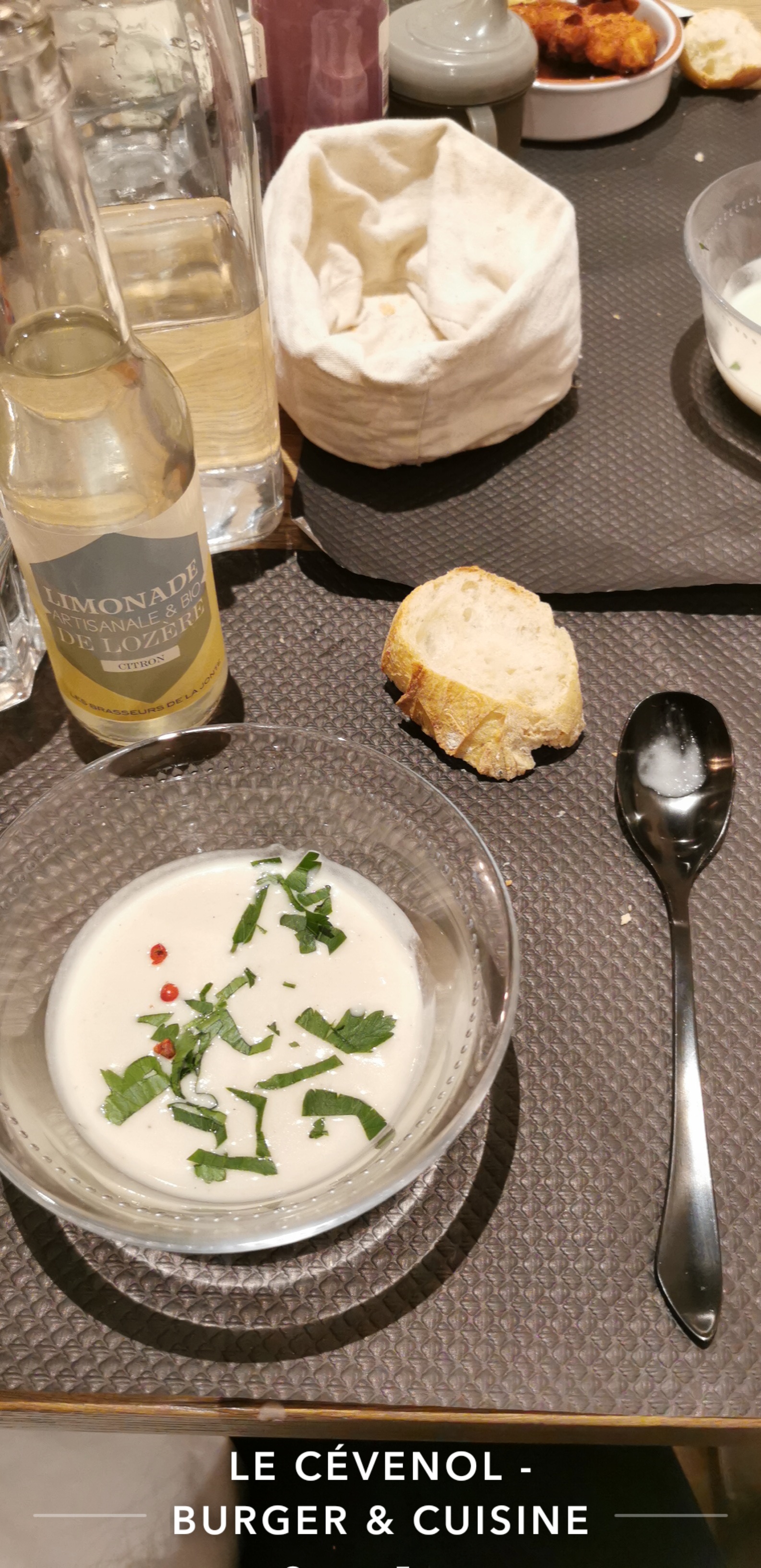 Un situation un peut proche de la circulation, mais de belles recette, un gaspacho melon pêche basilic 😍, une bière, la faro bière blanche de Lozère, burger du jour, neuf, salade, confit d'oignons jambon et comté.... Et pour finir sur une note sucrée, une glace au lait de chèvre, saveur caramel au beurre salé. Je recommande, je dirais même, faite un détour, ça vous bien un peut de route. Bonne dégustation.