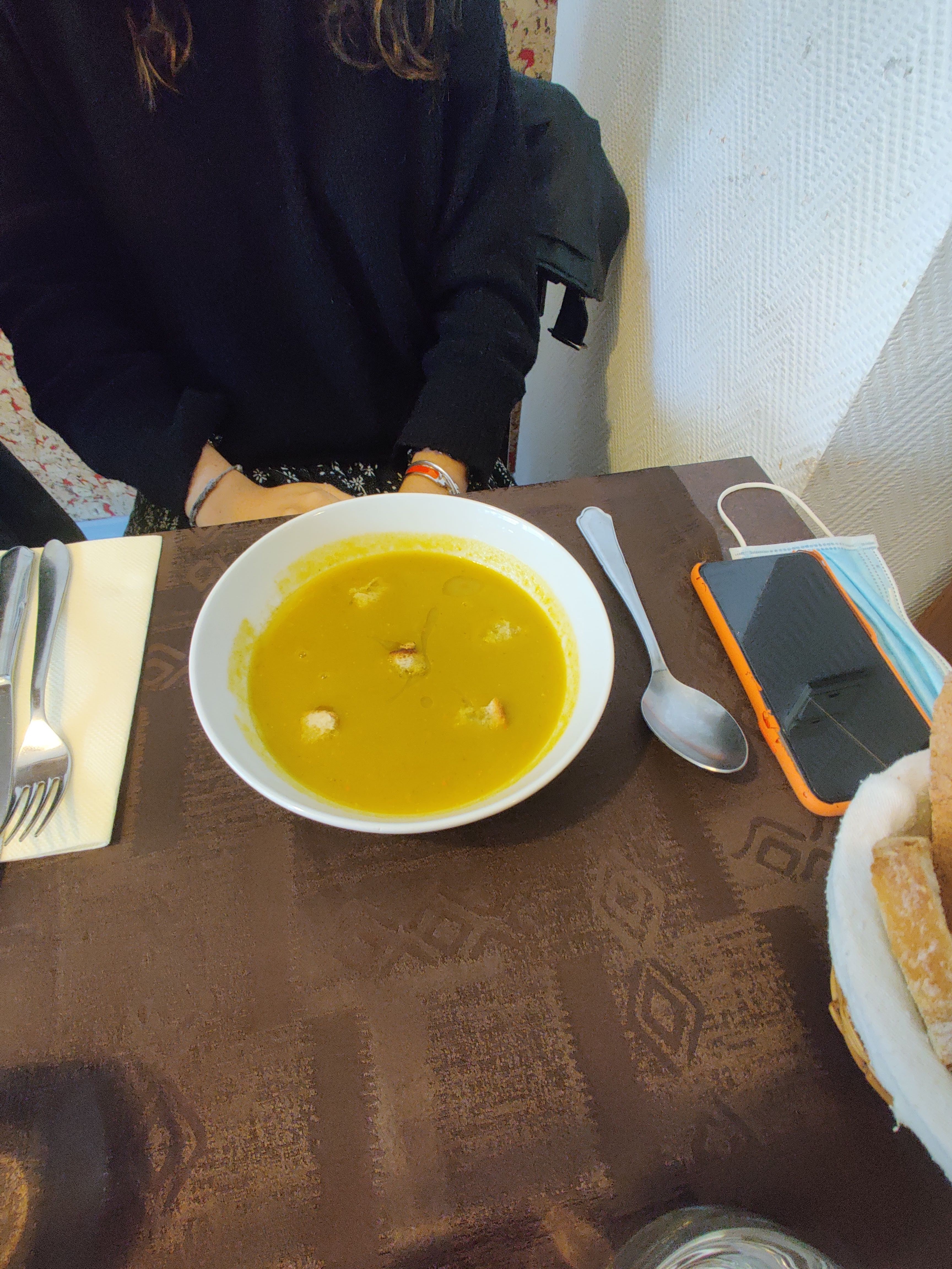 On nous a servi leur soupe (bouillon gras et insipide) puis un medaillon de boudin et un autre de purée de potimarron, froids, et un poisson qui n'avait pas été vidé... serveuse pas aimable, en plus A eviter !
