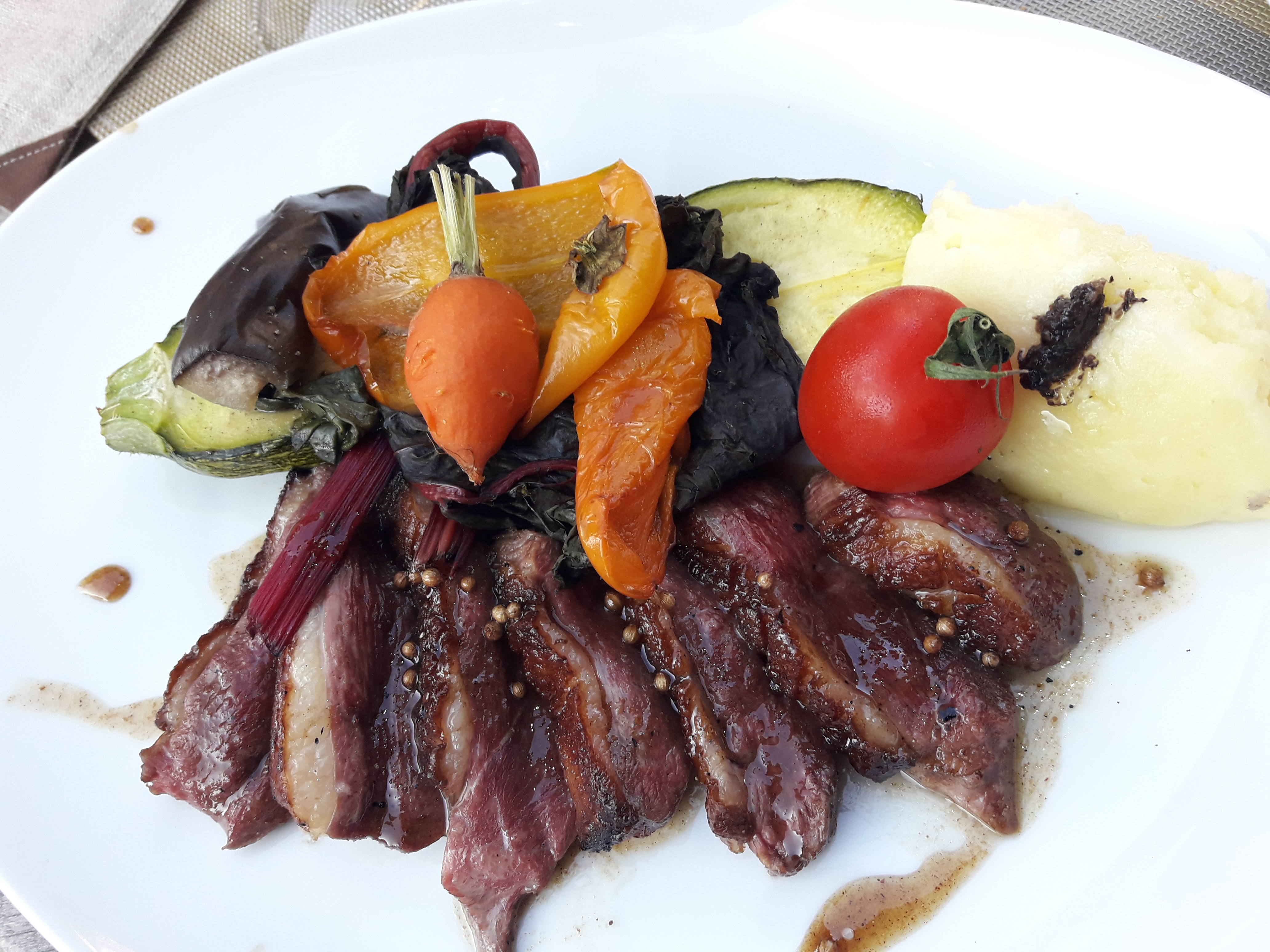 Assis à l'extérieur donc un peu frais plus tard dans la soirée mais la nourriture était excellente. Le canard à la sauce sichuanaise et aux framboises était fantastique.