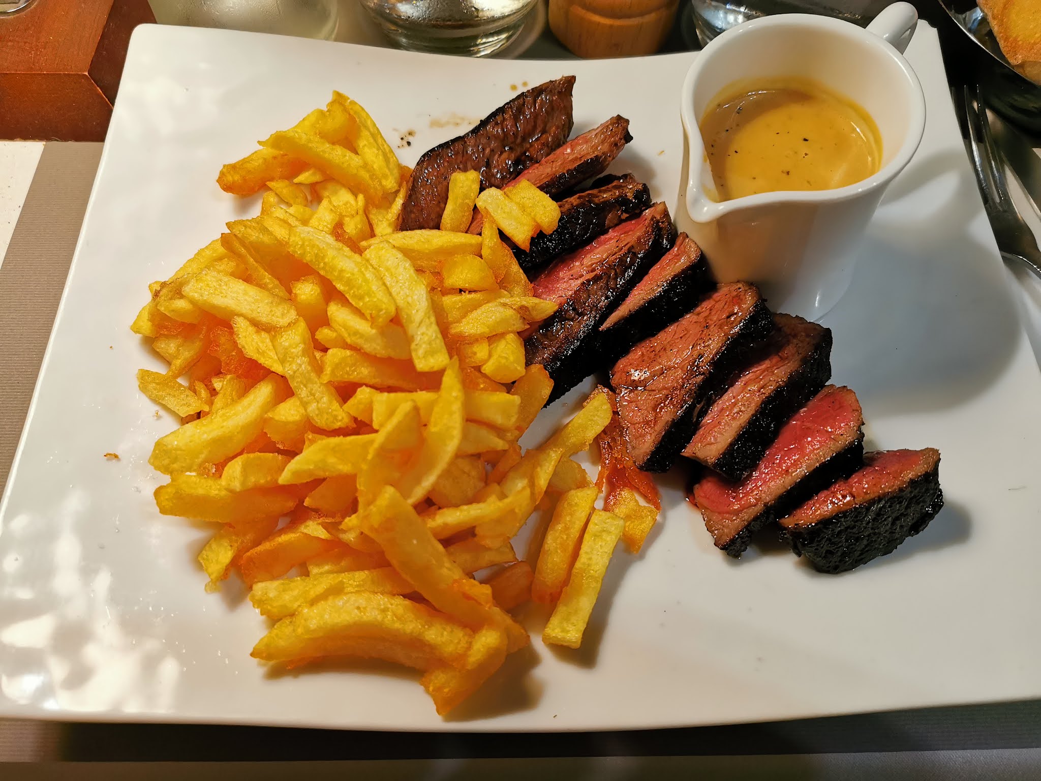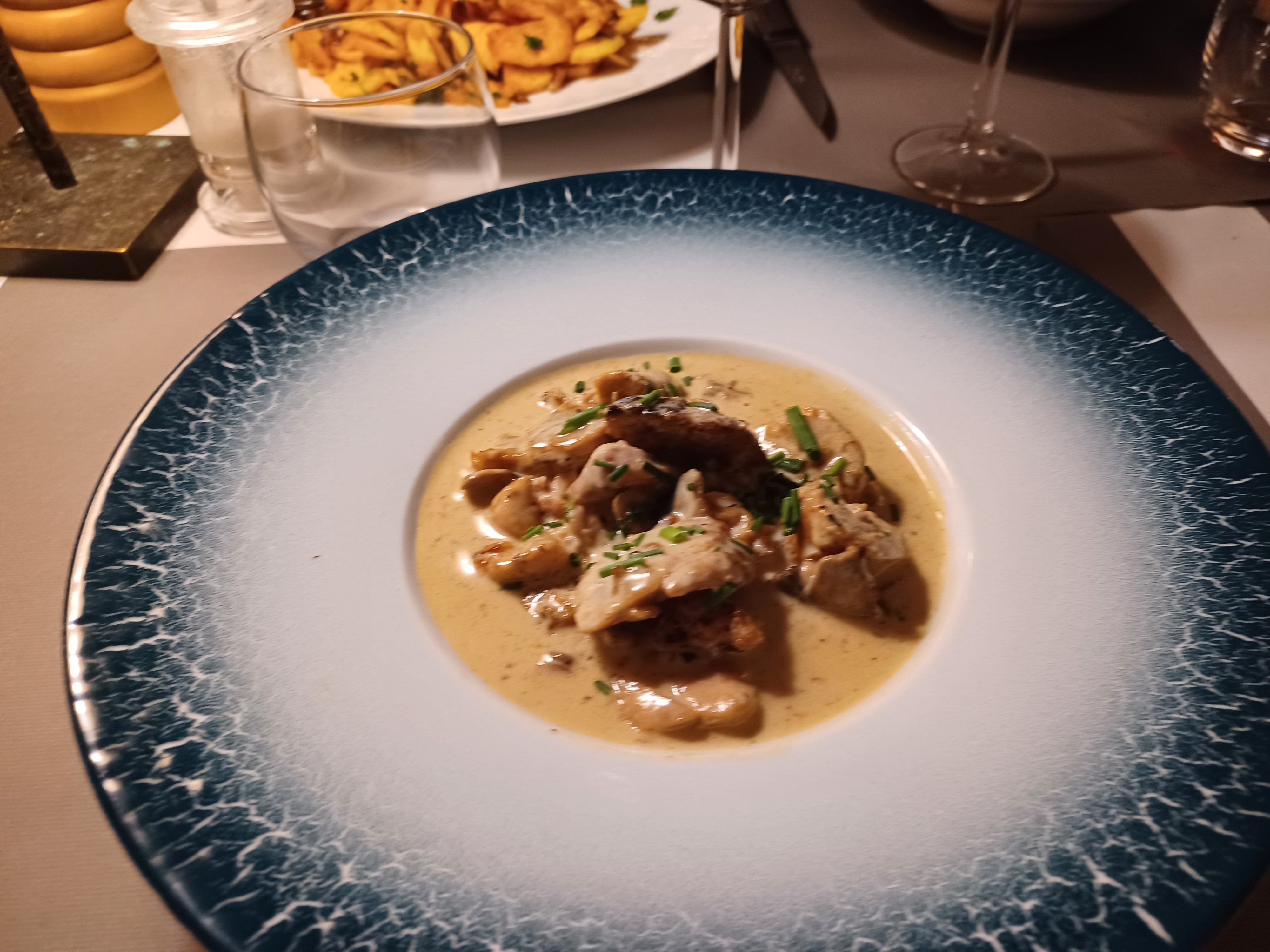 Plutôt déçue. Pas d'effort sur la présentation : plat servi brut au milieu de l'assiette (pas de feuilles de salade ou de petit filet de sauce pour faire joli) avec saladier de frites collectif pour l'ensemble de ma tablée (portions peu généreuses). Vu le prix à la carte, j'aurais apprécié d'avoir le plat et son accompagnement servis individuellement dans chaque assiette. Je ne m'attendais pas à être servie comme à la cantine ...