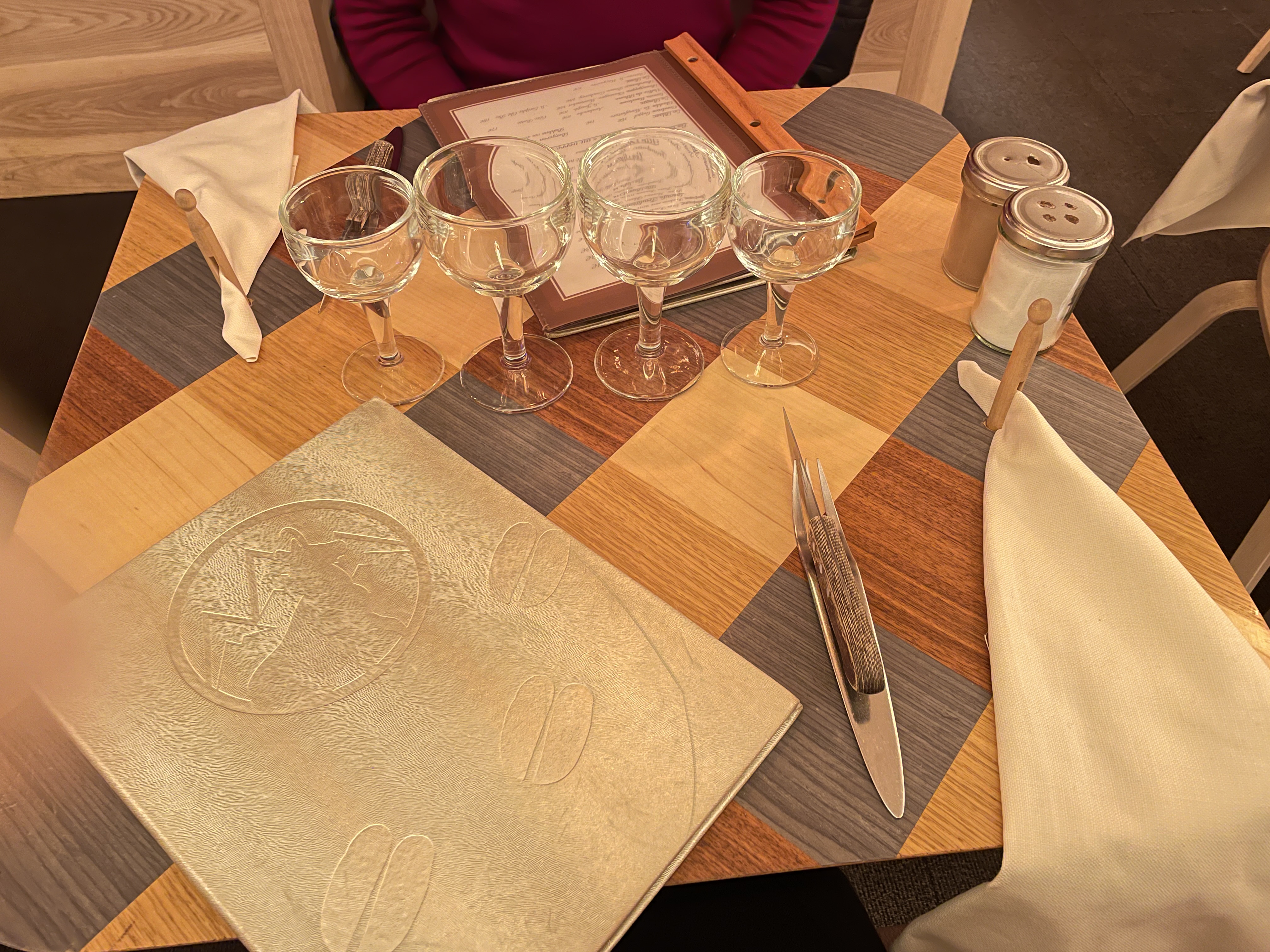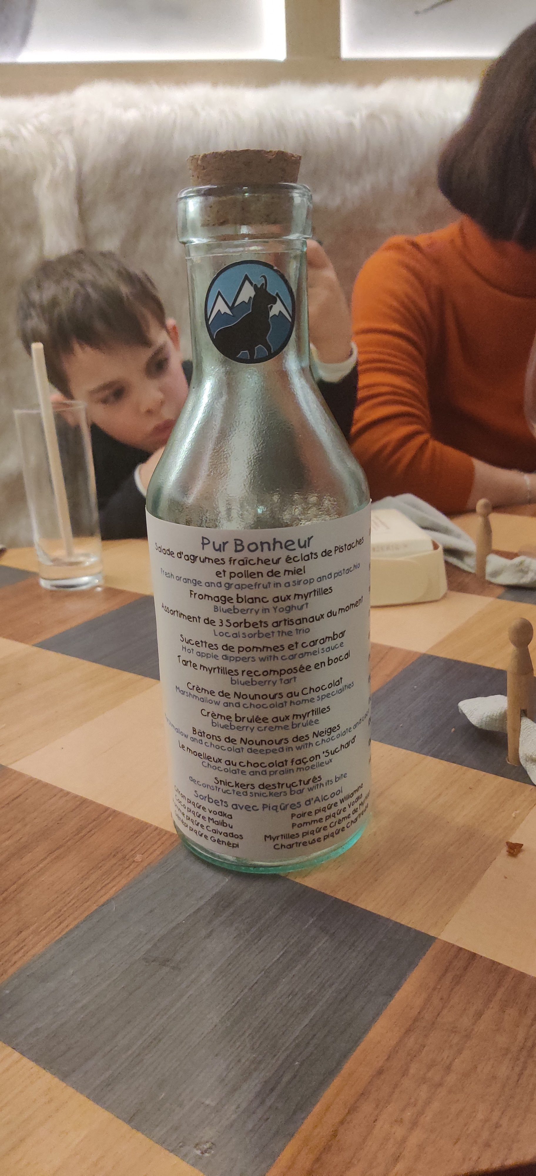 Une fondue savoyarde en solitaire, pourquoi pas ? En préambule je prends la viande de boeuf séchée avec l'apéritif maison pétillant à la myrtille, c'est parfait. Puis la fondue savoyarde, excellente. Une musique lounge/folk avec des reprises de tubes récents, je questionne la serveuse, il s'agit d'une playlist de covers (reprises) faite sur youtube. Excellent! Plus de place pour un dessert (ils sont paraît-il) excellents, je finis avec un limoncello, servi sur glace pilée dans un verre à Cognac, décidément je reviendrais 😊