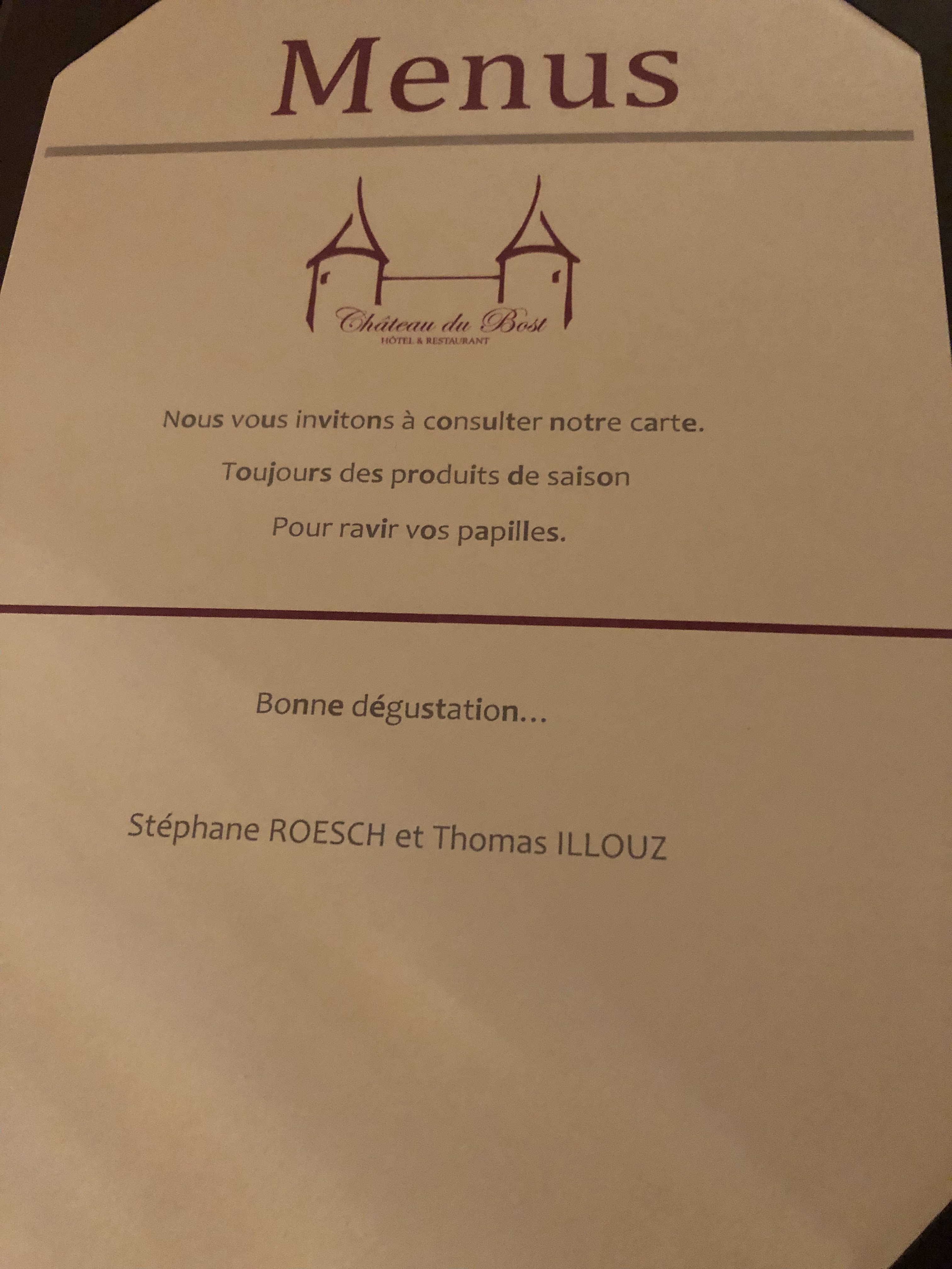Voilà le type même de restaurant qui nous laisse pantois!! Le cadre est très joli et pour manger vous pouvez avoir le choix entre la grande salle et celle dit des douves intismiste et avec de jolis tableaux du monde sportif Les plats sont bons mais pour un gastro il manquait le petit plus qui en ferait une très bonne adresse Exemple: les sauces qui accompagnaient le foie gras poêlé ou le risotto de coquillages manquaient un peu de peps ! L accompagnement des plats est un peu léger Par contre le dessert était très bon même si je pense que la quenelle de sorbet aurait mérité d’être à peine plus importante pour accompagner l’entremet à la mangue. Ce qui n allait pas du tout c est le service, au pas de course pour commencer jusqu’au dessert…. Puis 45 minutes d attente pour avoir notre pré dessert puis notre dessert!!!! On avait été oublié tout d un coup Sans compter notre temps d attente pour régler car personne à proximité Bref, des choses à revoir pour cette catégorie de restaurant 🧐 Je viens de retourner au Château de Bost. Menu complet Cette fois-ci c’était top et vraiment excellent Personnel affable et service impeccable Les plats étaient simples et délicieux Le plateau de fromage une extase ! Dessert un peu simplet peut-être être Bons petits vins. Continuez vous êtes sur le bon chemin !