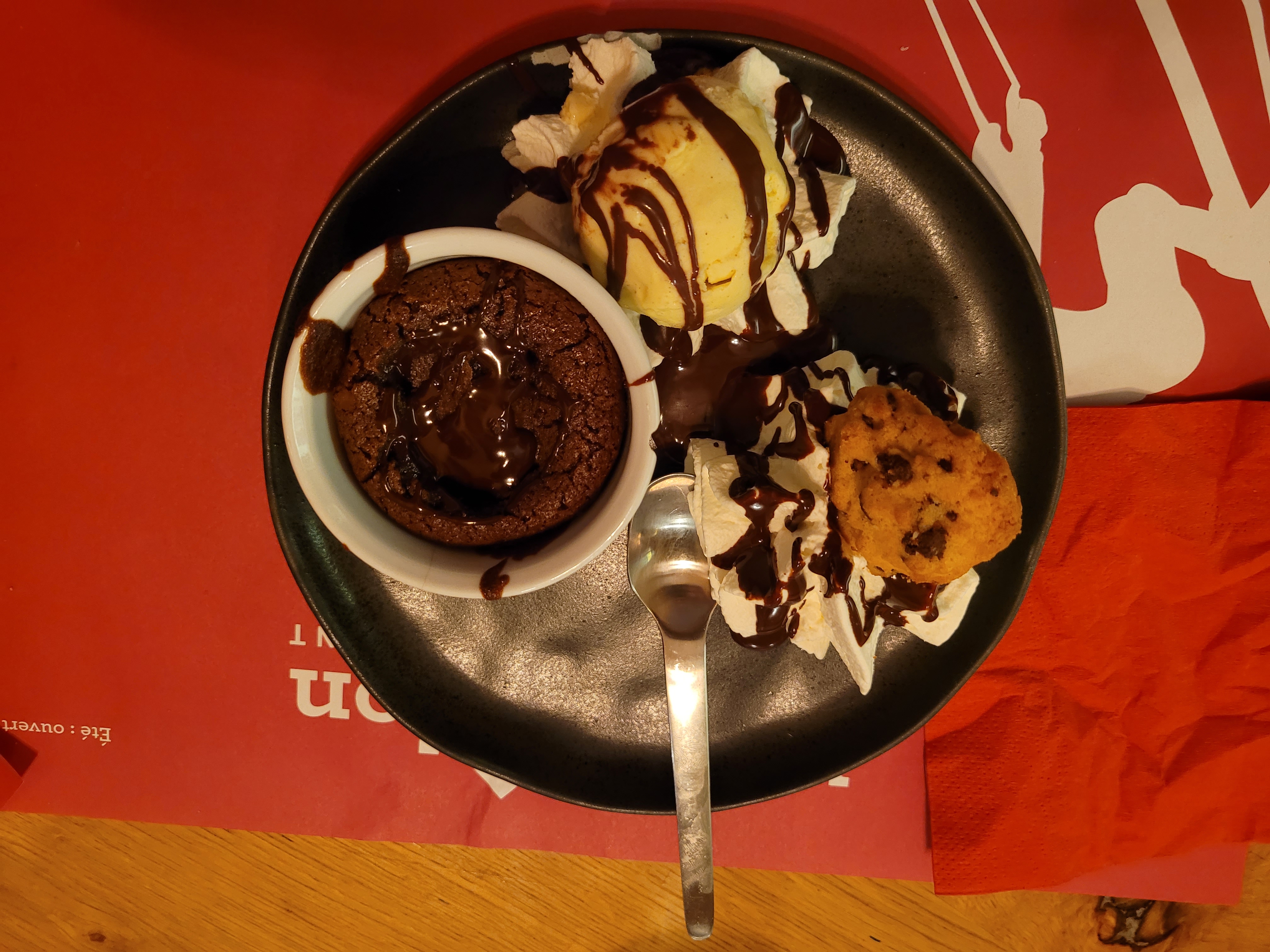 Très bon restaurant assiette bien garni ainsi que de bonnes quantité un café gourmand qui pourrait s'appeller plutôt un gourmand café temps le choix ainsi que la quantité était au rdv . Un très bonne accueil un personnel au top très agréable, serviables, souriant, réactif . Bravo on reviendra avec plaisir