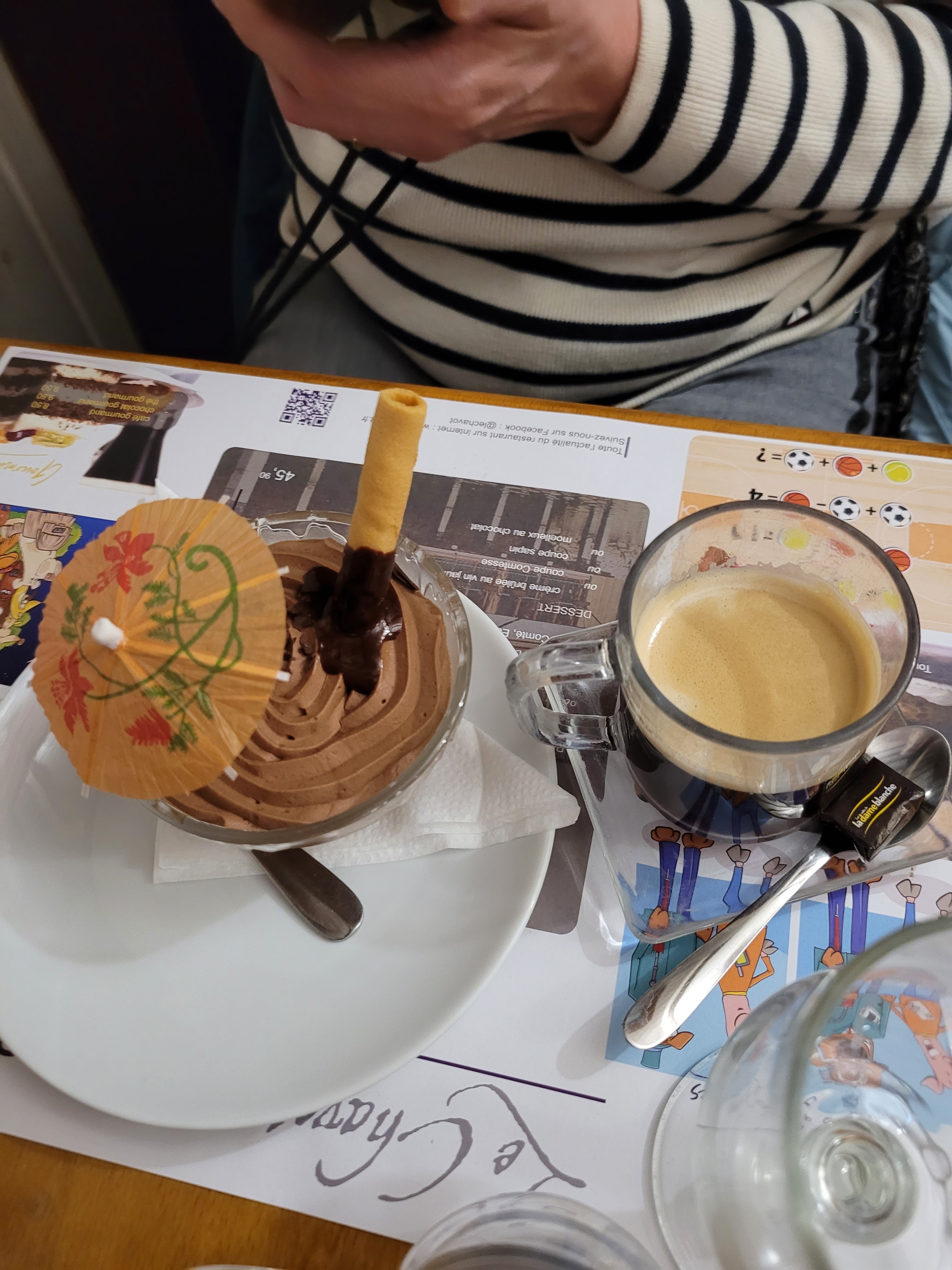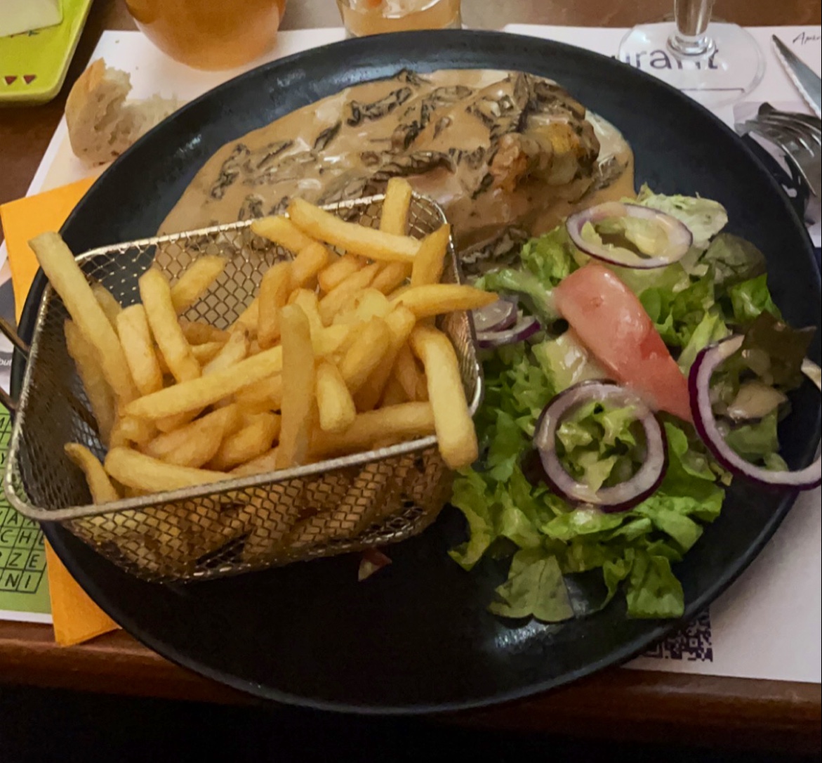 Nous avons pris un Pontarlier en apéro suivi d'une croûte aux morilles en plat principal qui était excellente et en dessert une coupe oranaise avec deux cafés. Nous étions repus pour une visite ensuite au musée Courbet. La cuisine est excellente et le service est impeccable. Merci à toute l'équipe du chavot... 👍